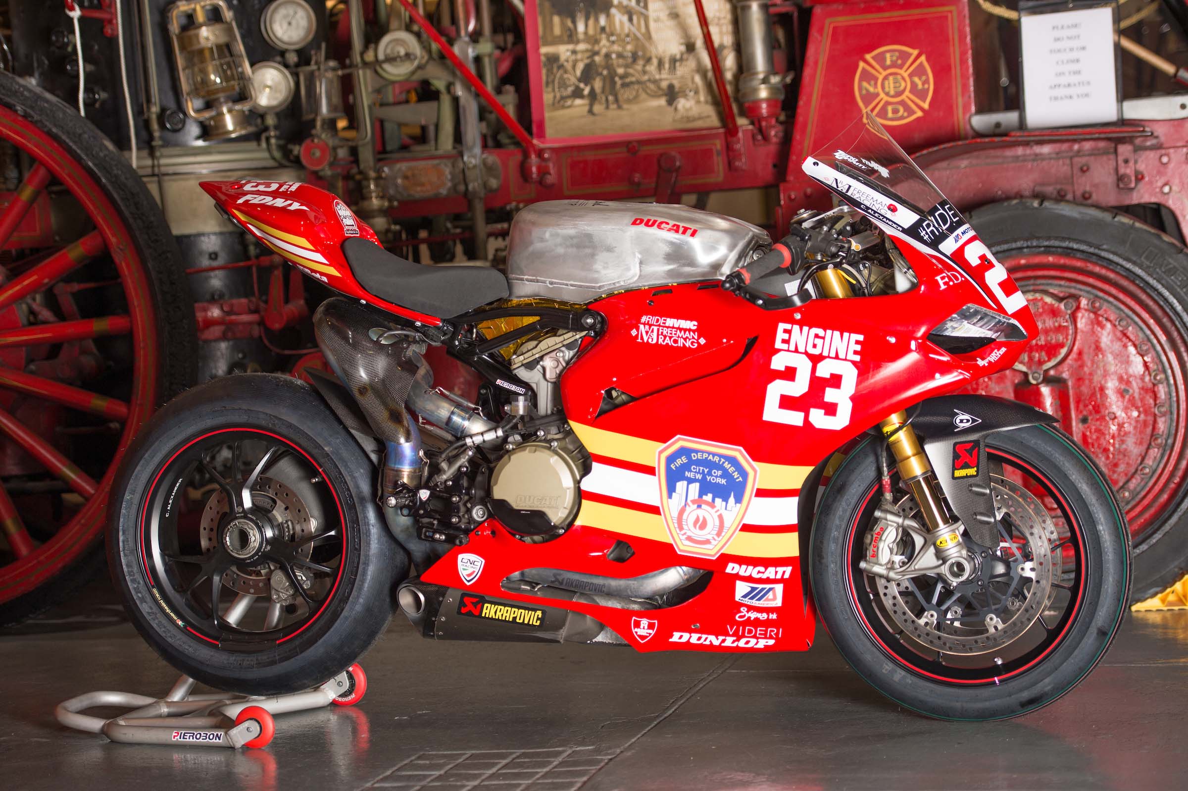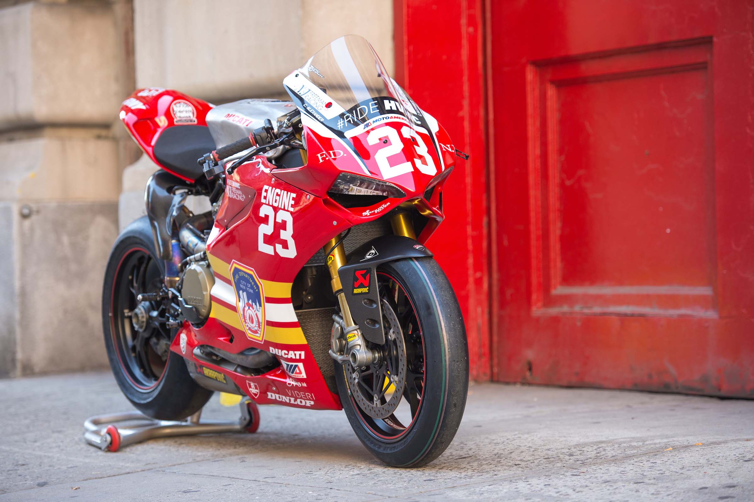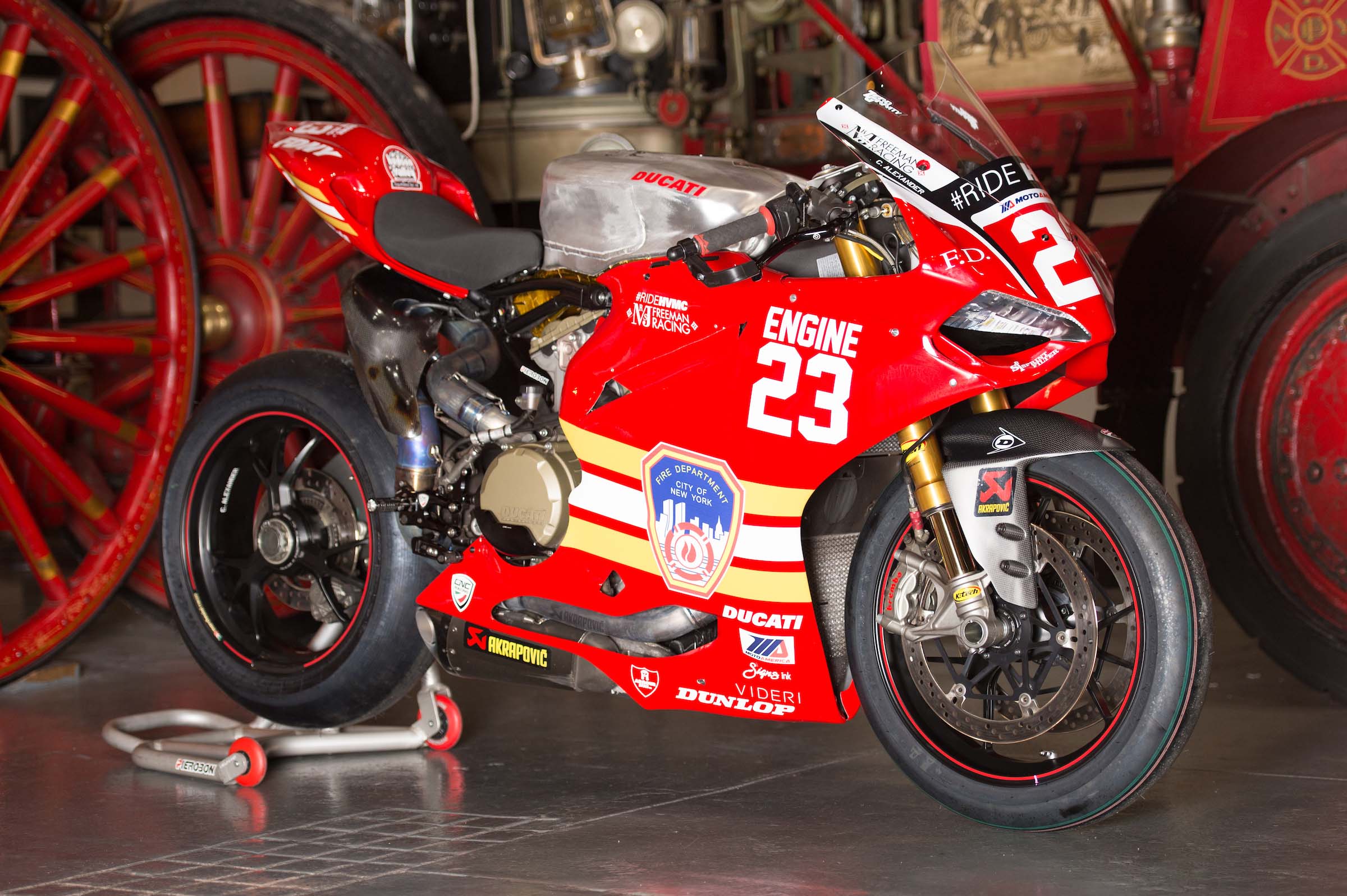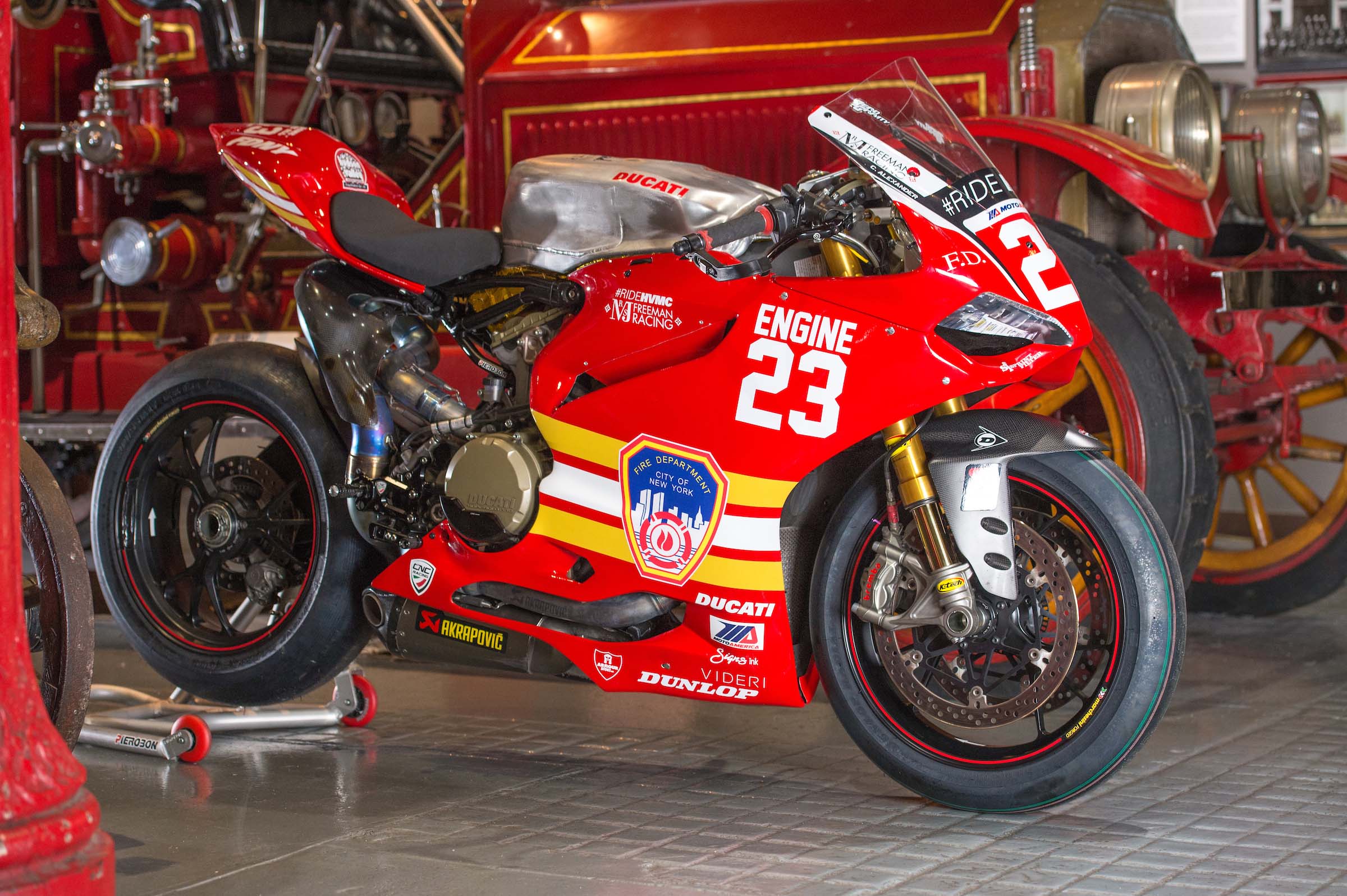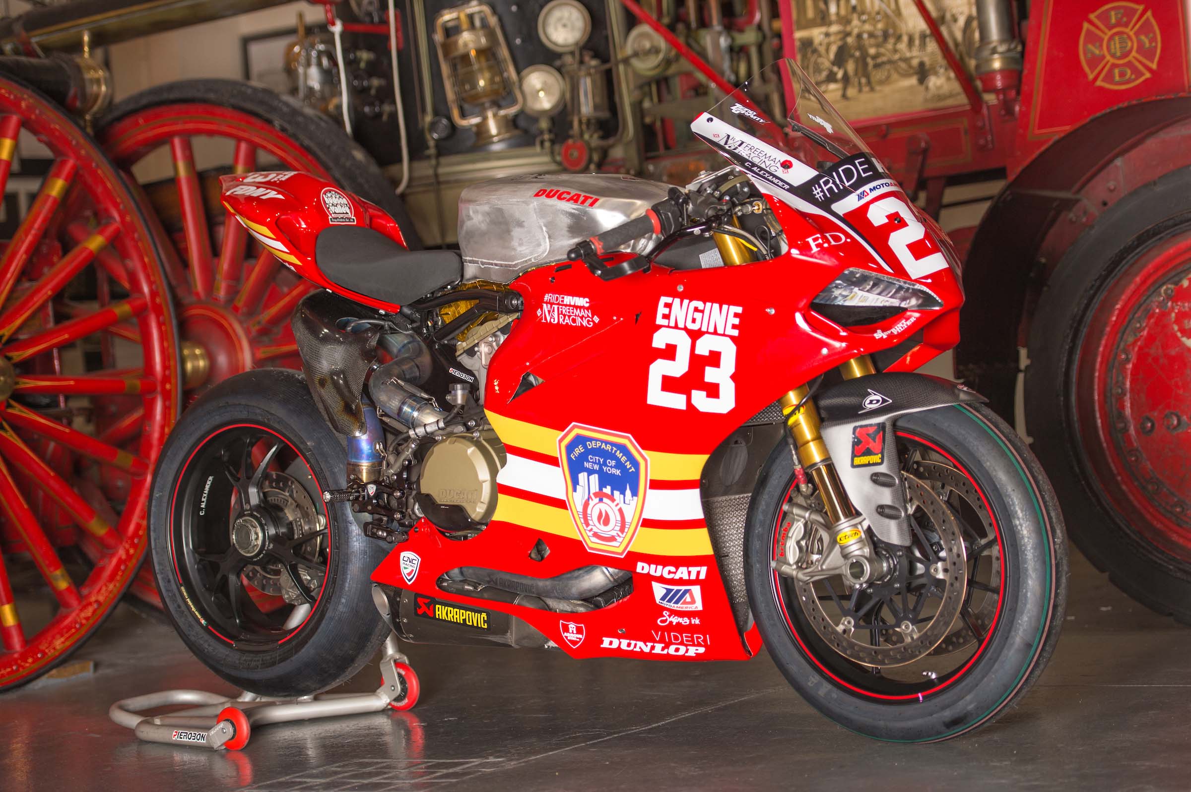 As such, Corey Alexander and the #RideHVMC Freeman Racing Ducati Panigale R will be wearing a special livery that commemorates the men and women of the New York City Fire Department. As you will see in the photos after the jump, “Engine 23” is a fetching motorcycle, with a touching message.