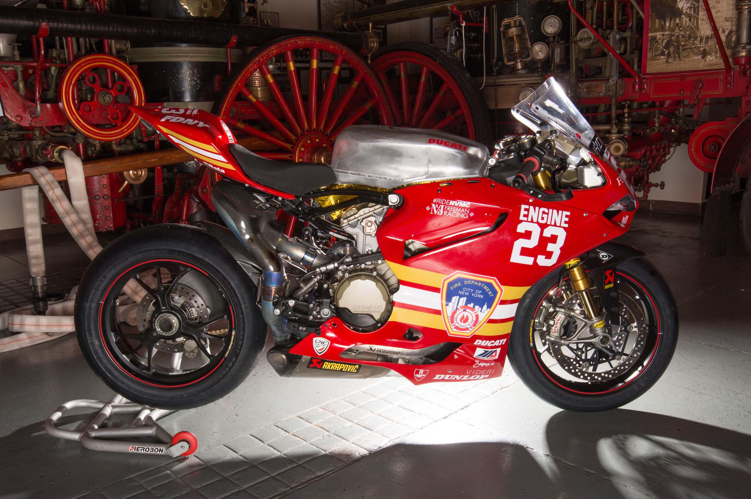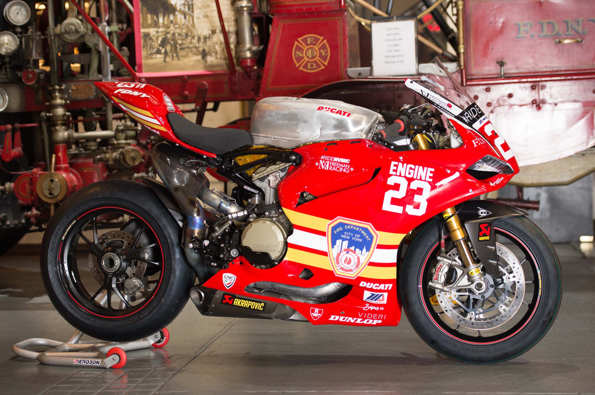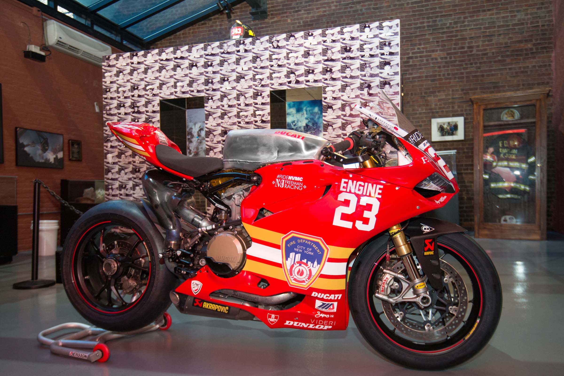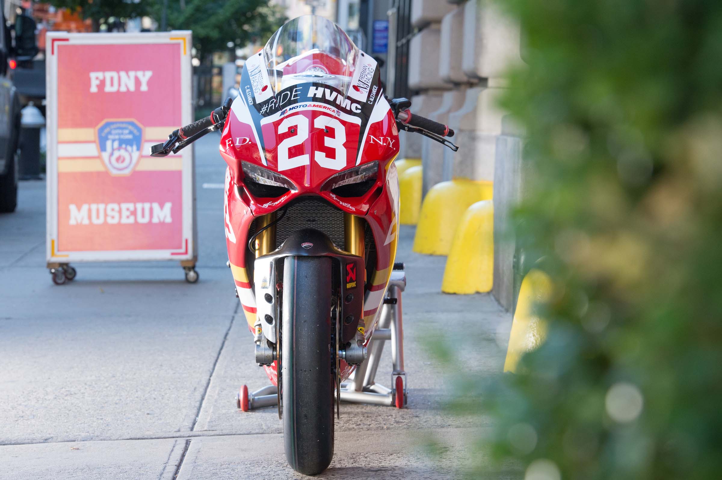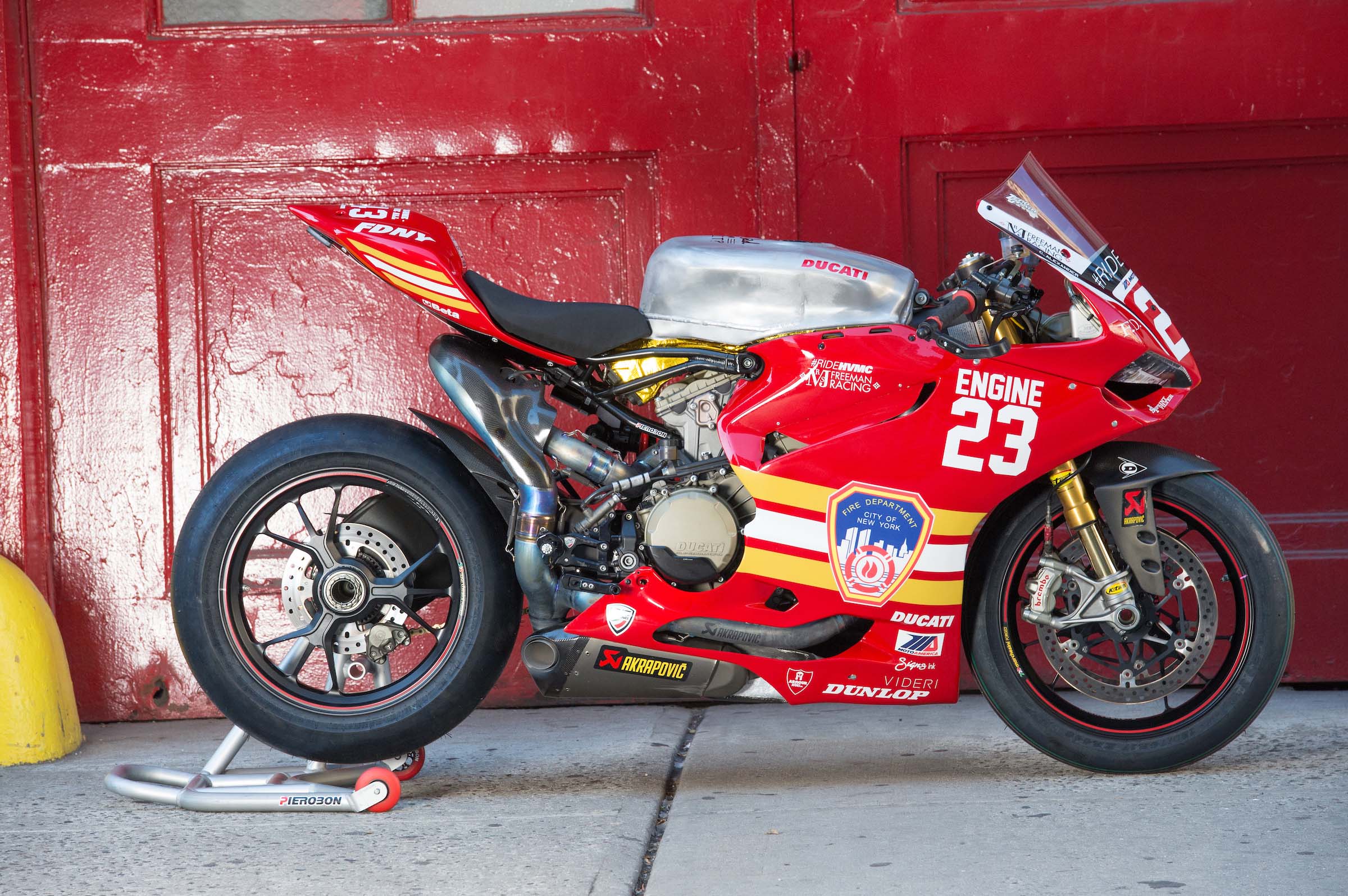 As such, Corey Alexander and the #RideHVMC Freeman Racing Ducati Panigale R will be wearing a special livery that commemorates the men and women of the New York City Fire Department. As you will see in the photos after the jump, “Engine 23” is a fetching motorcycle, with a touching message.