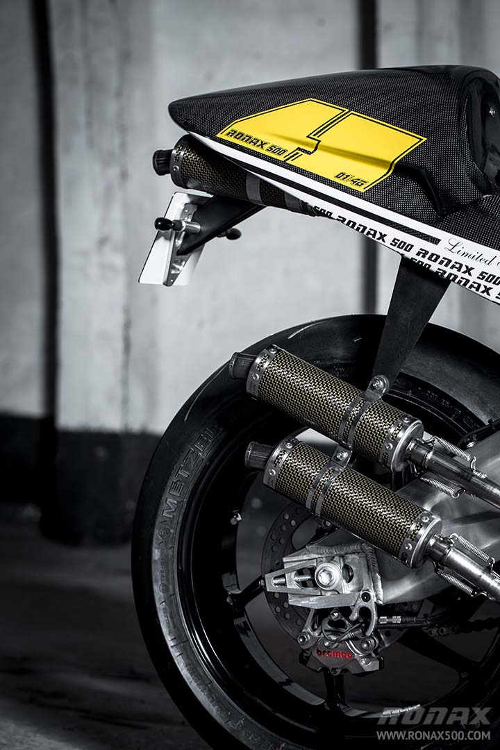 Fuel-injected for more rideability, Ronax has programmed the Ronax 500 with a sport and rain ignition map. Upgrading the class GP bike design with modern components, an electric starter and four carbon/kevlar mufflers are part of the Ronax 500’s highlights, while carbon fiber fairings, Öhlins suspension, and Brembo brakes complete the package.