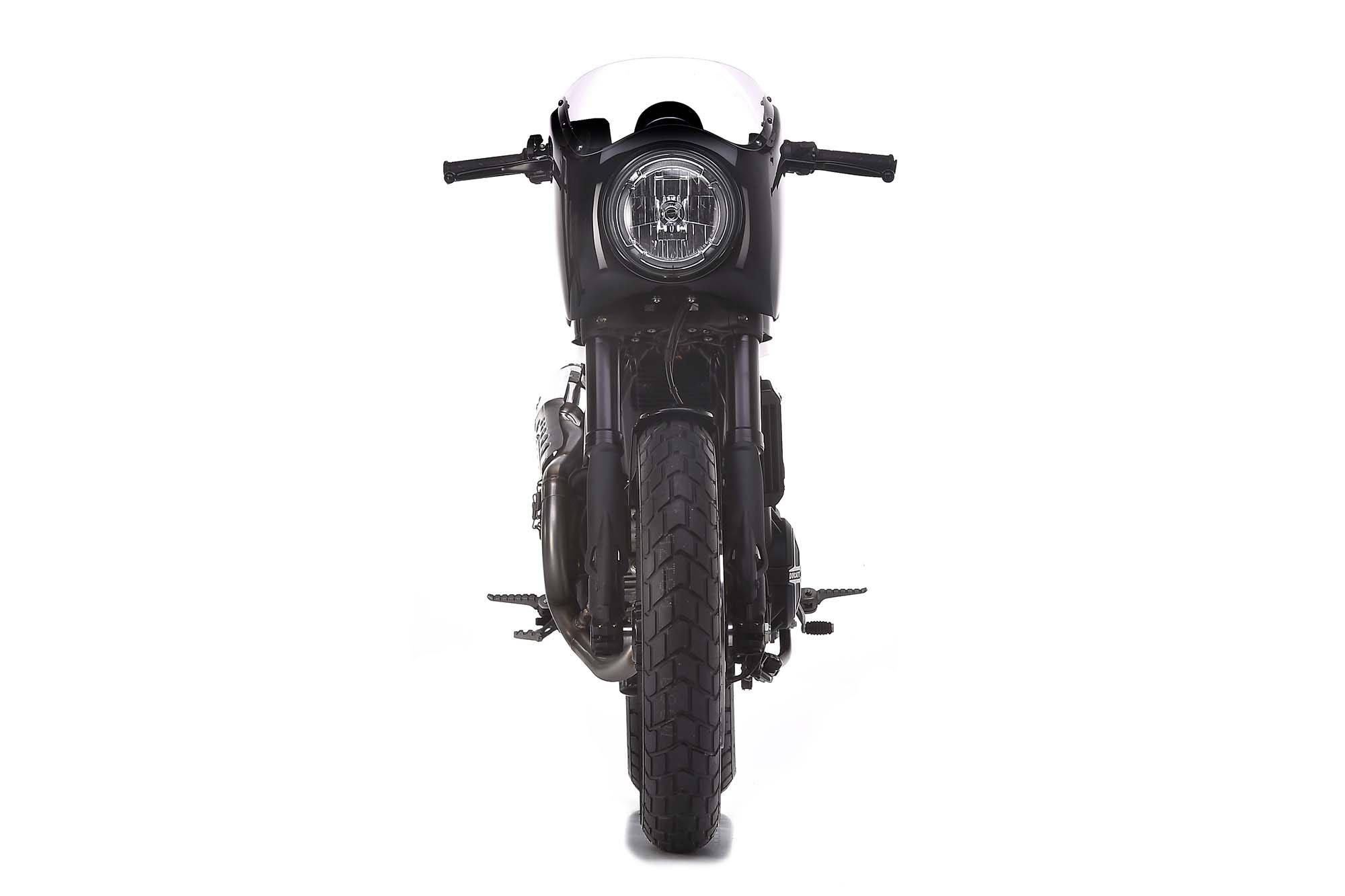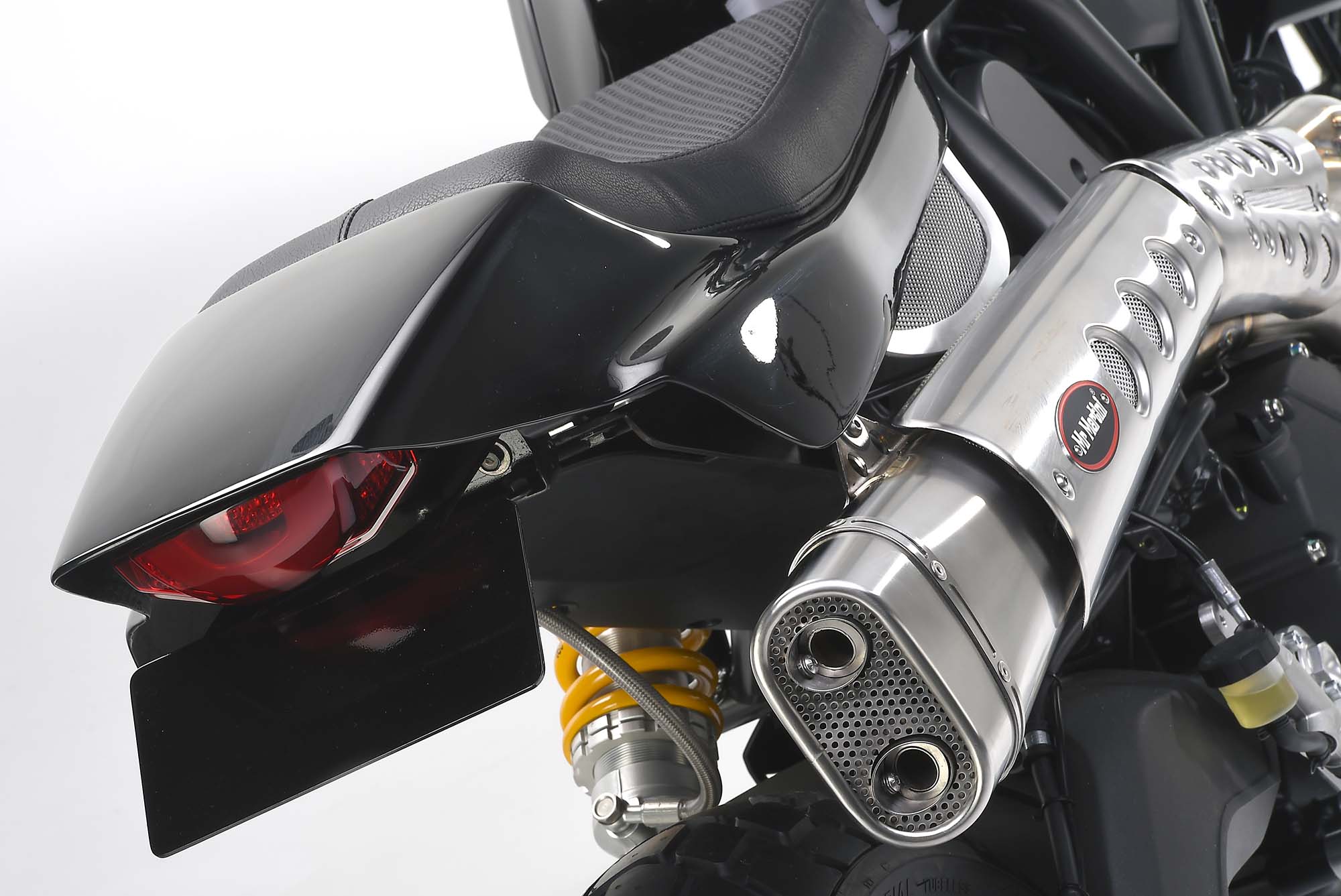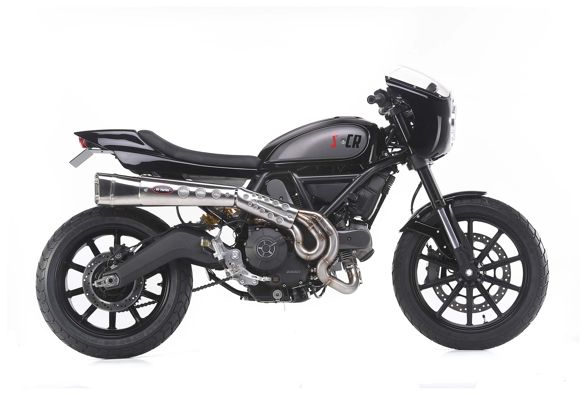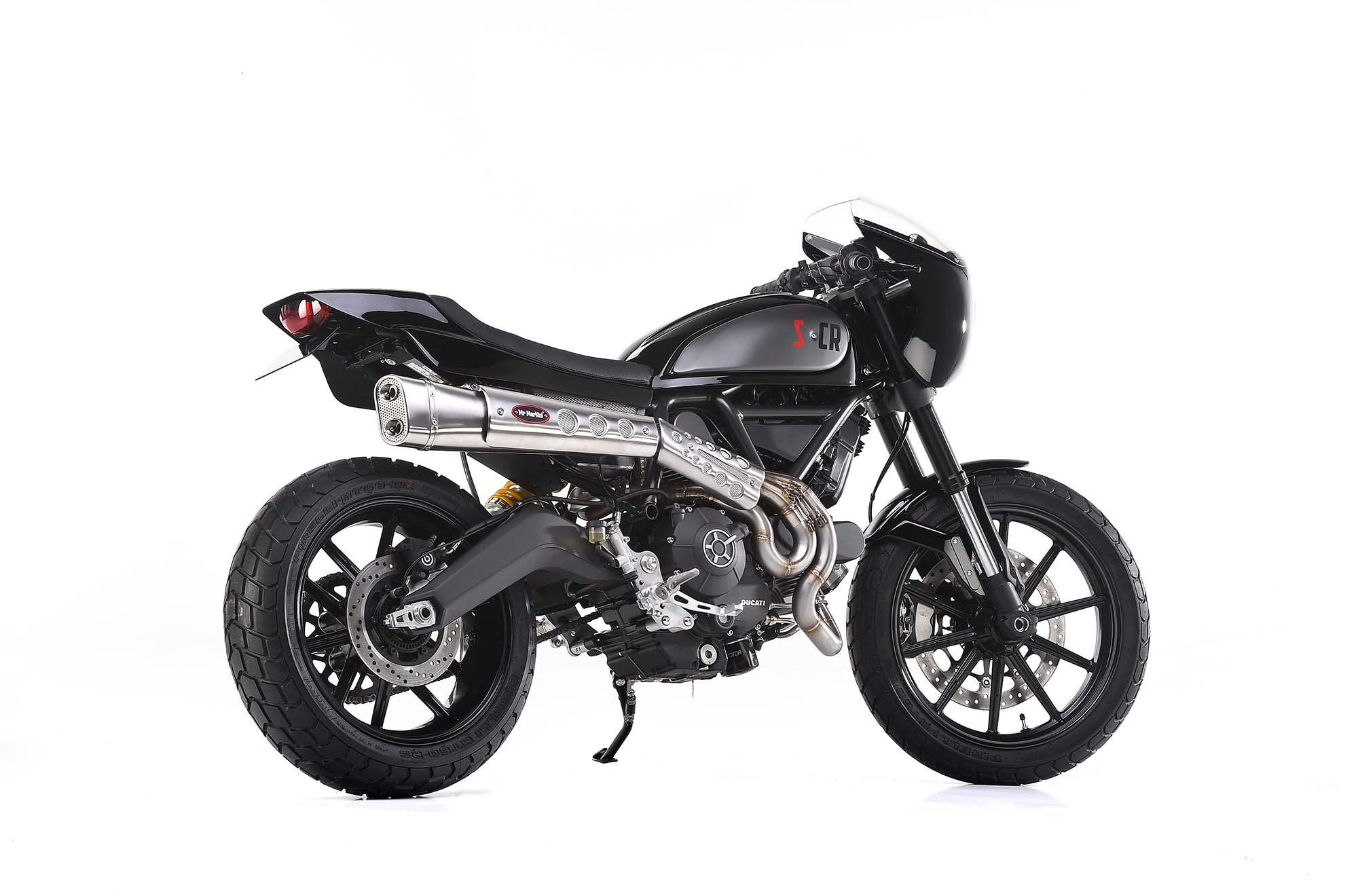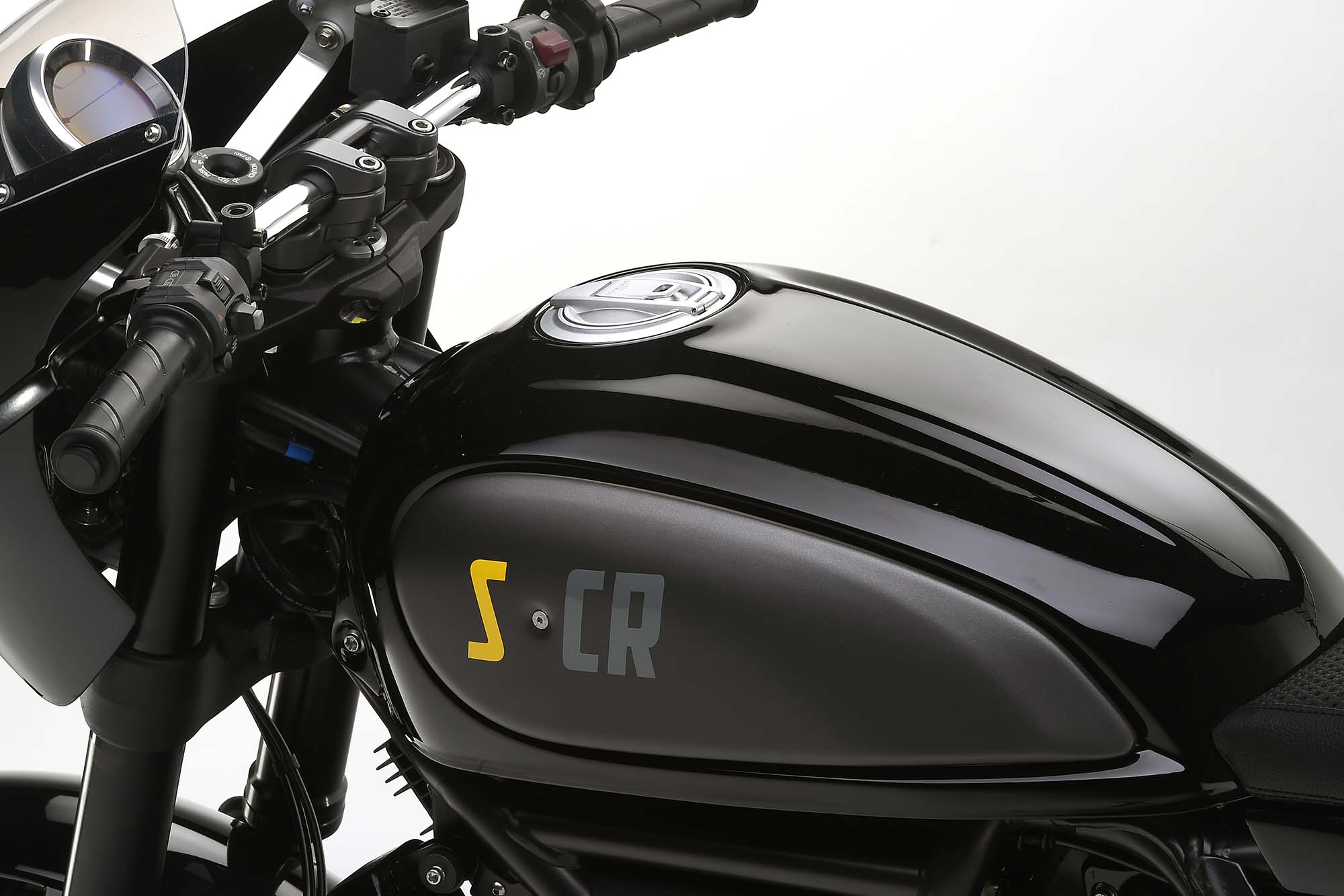 “This fusion gave our bike its name: S.C.R. – Scrambler Café Racer. We’ve changed the nose fairing, the tail-piece, the whole of the exhaust, the foot-peg and handlebar mountings and the rear suspension unit and have, of course, given the bike a new colour. The Scrambler Café Racer is in ‘total black’ including the saddle, undertail and timing belt covers.”