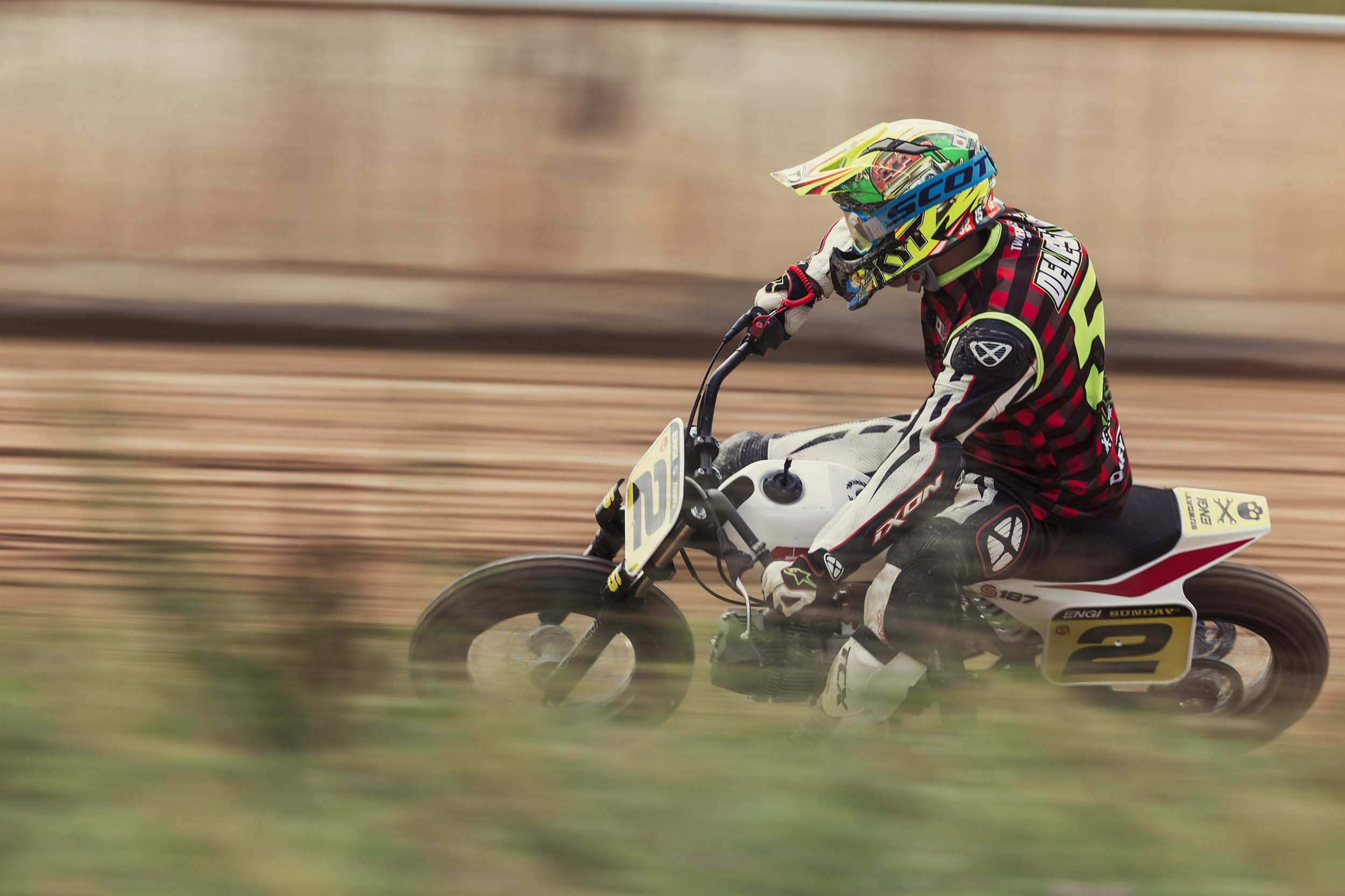 Now, source again the 187cc single-cylinder engine from Daytona, and use that same “built for kids (but really adults)” form-factor, except this time build this creation for the flat tracking realm, and what you have is the Sunday Motors S187.