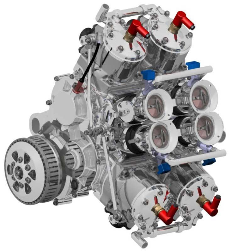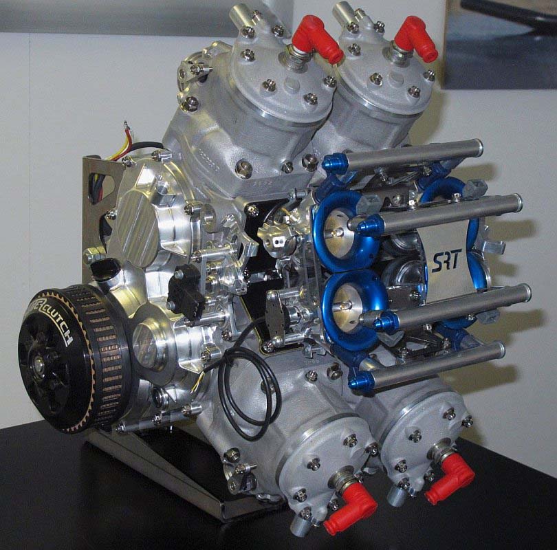 | Engine Type | 4 Cylinder V4 two stroke double counter rotating crankshaft, roller bearings |