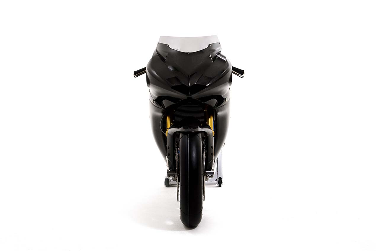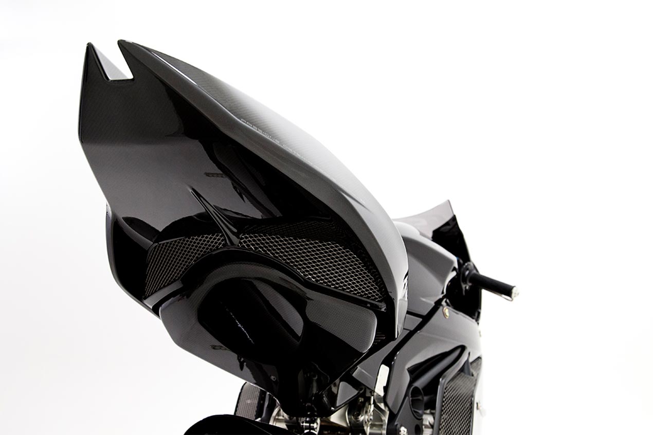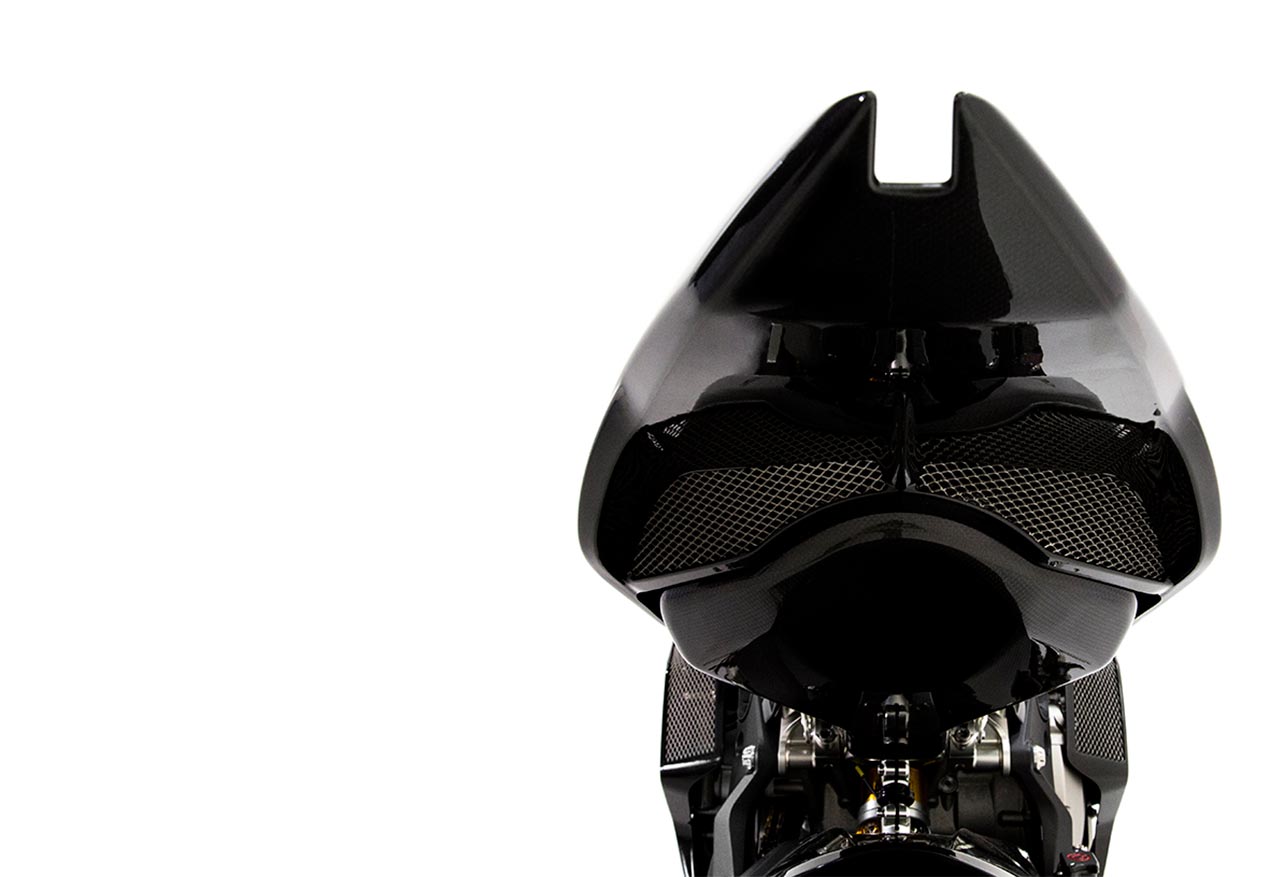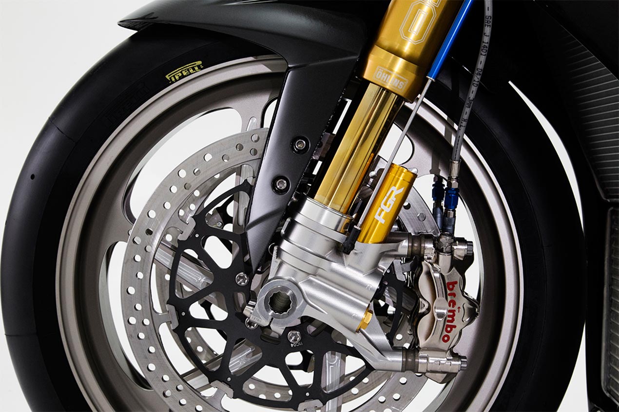 The wheels are forged magnesium units, while the carbon fiber fuel tank gives support to the seat and rear subframe. Suspension is handled by top-shelf suspension from Öhlins, front and rear.