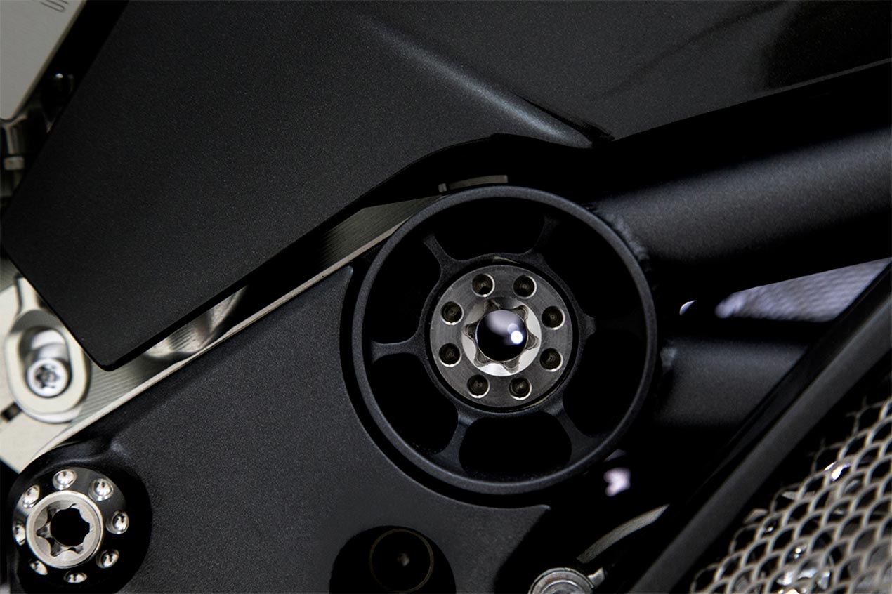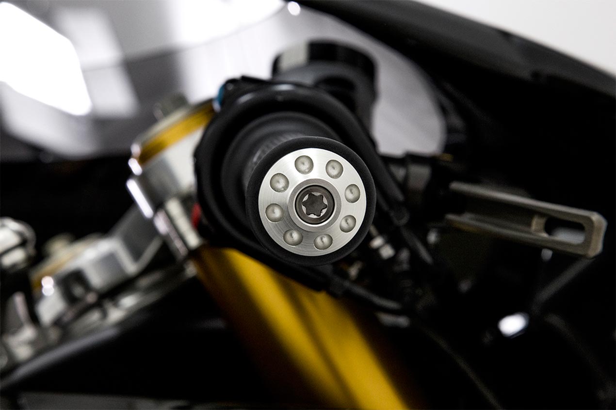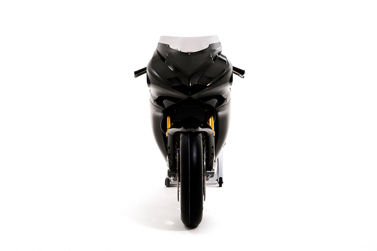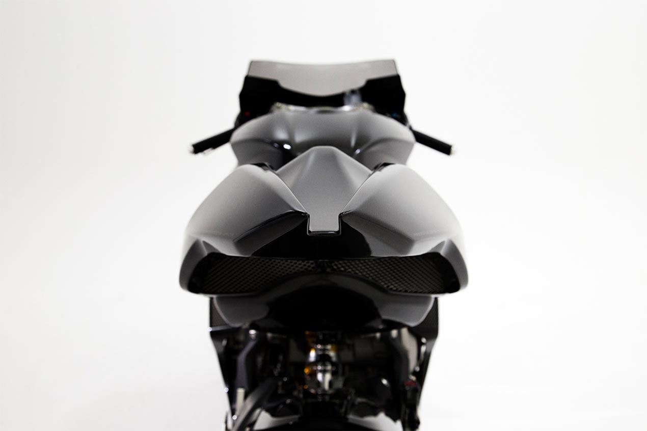 The wheels are forged magnesium units, while the carbon fiber fuel tank gives support to the seat and rear subframe. Suspension is handled by top-shelf suspension from Öhlins, front and rear.