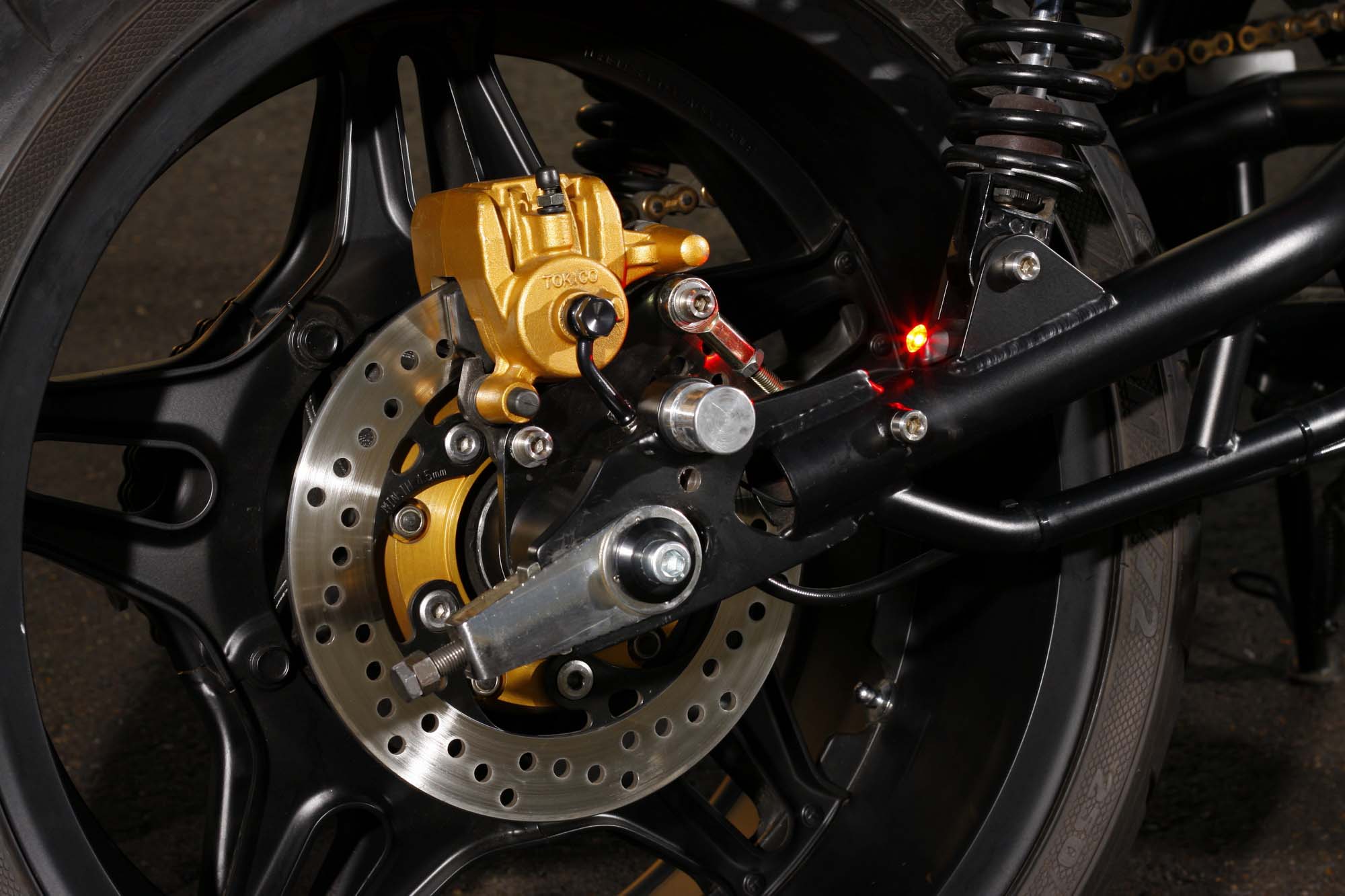 Comprised of parts from all the major Japanese manufacturers, Pauletto has a few American bits and pieces on the Trillion Industries 1979 Honda CB650 for good measure as well. The front-end is off a Kawasaki sportbike, while the headlight is from a Harley-Davidson V-Rod. The frame, swingarm, and wheels have all been widened, and the Honda CB650 motor has been slightly tuned for a bit more pep-in-the-step.