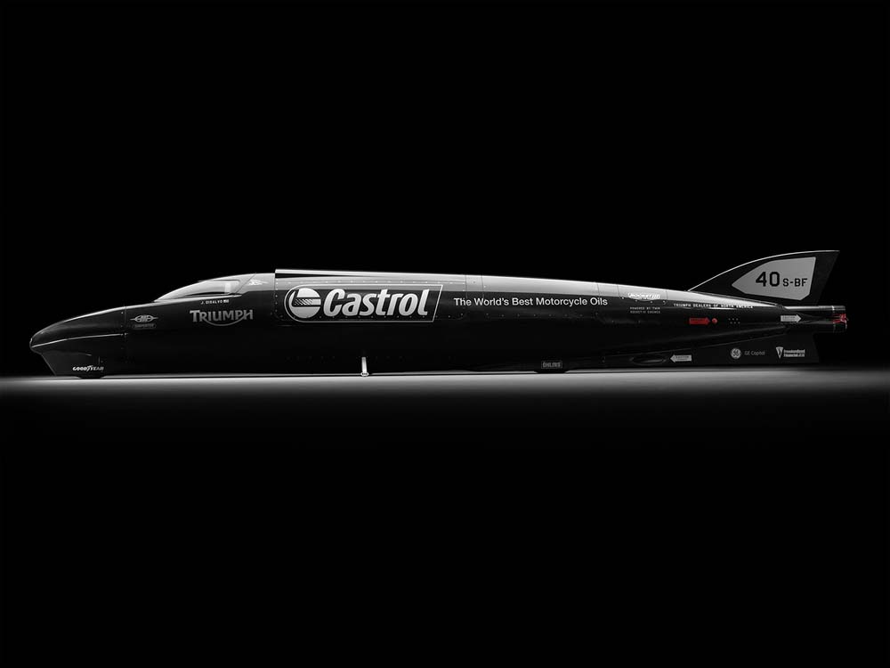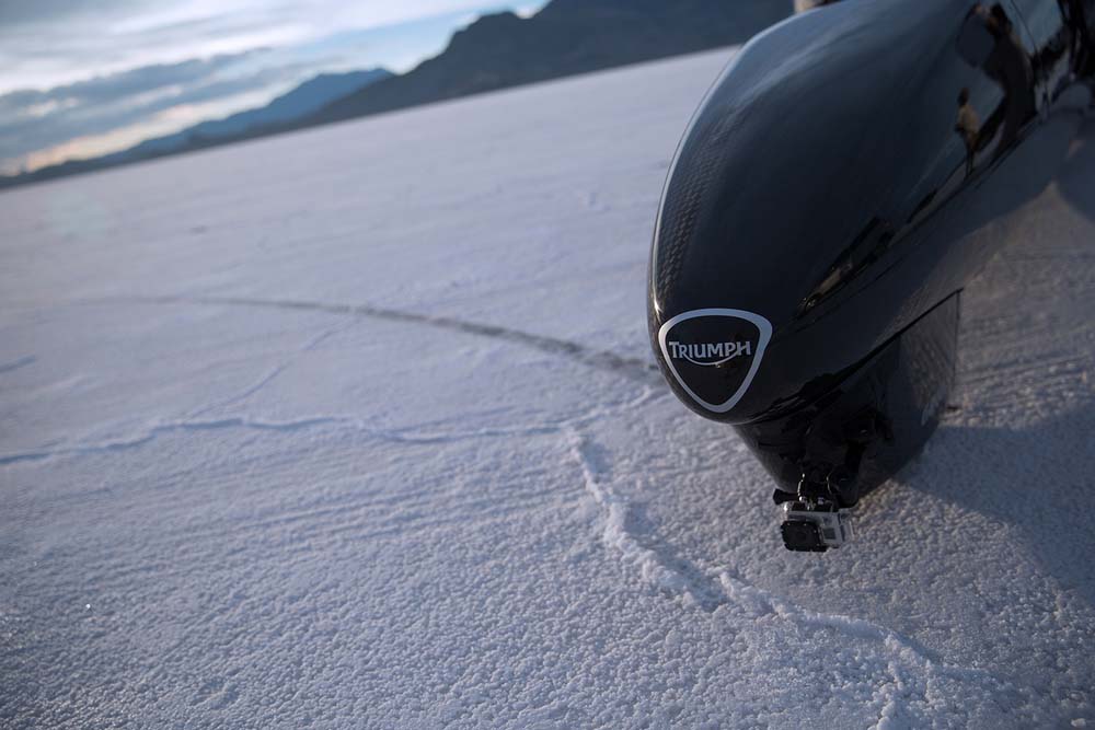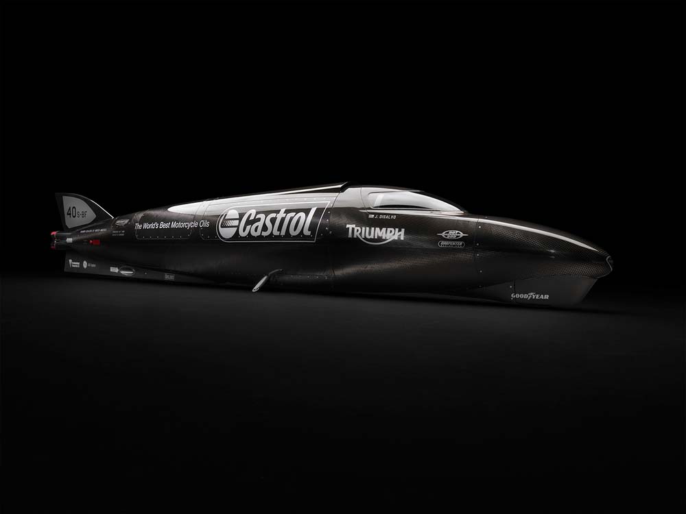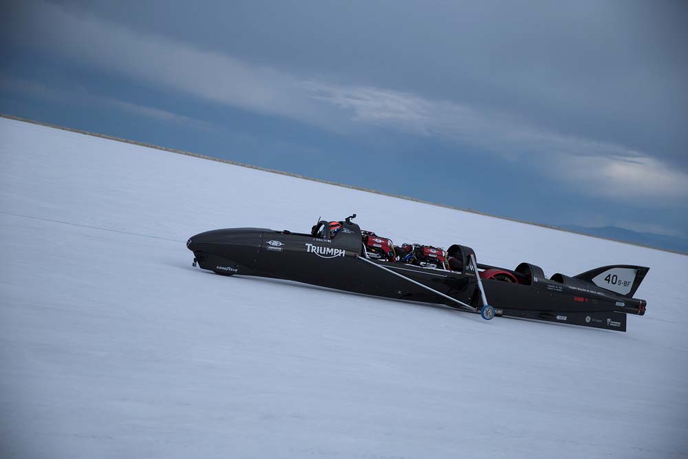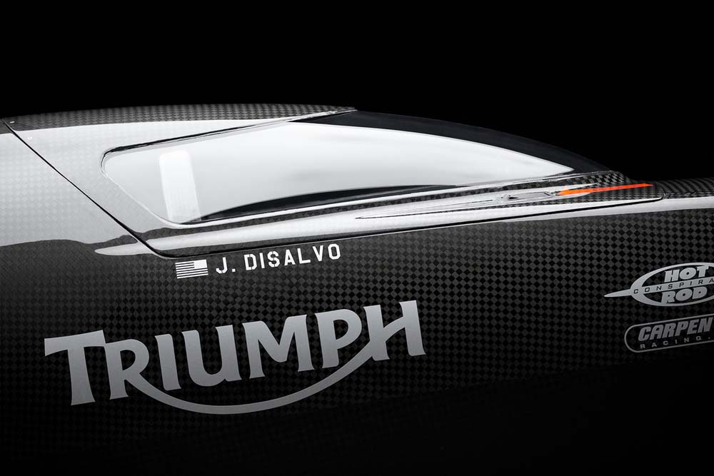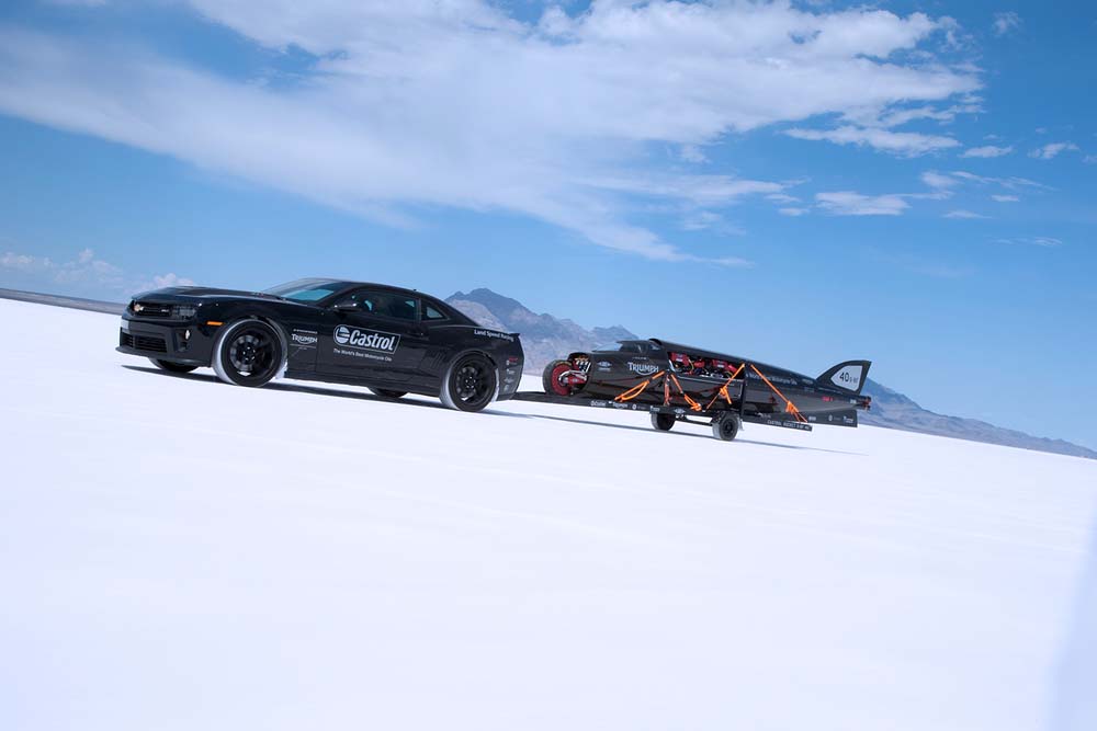 It goes without saying then that Triumph and Jason DiSalvo’s attempt at 400 mph on the Bonneville Salt Flats is a serious endeavor. Piloting the carbon/kevlar clad the Hot Rod Conspiracy/Carpenter Racing Castrol Rocket, DiSalvo will have two turbocharged Triumph Rocket III engines, good for a combined 1,000+ hp and 500 lbs•ft of torque when burning methanol, hurling him down the land speed record course on two wheels.