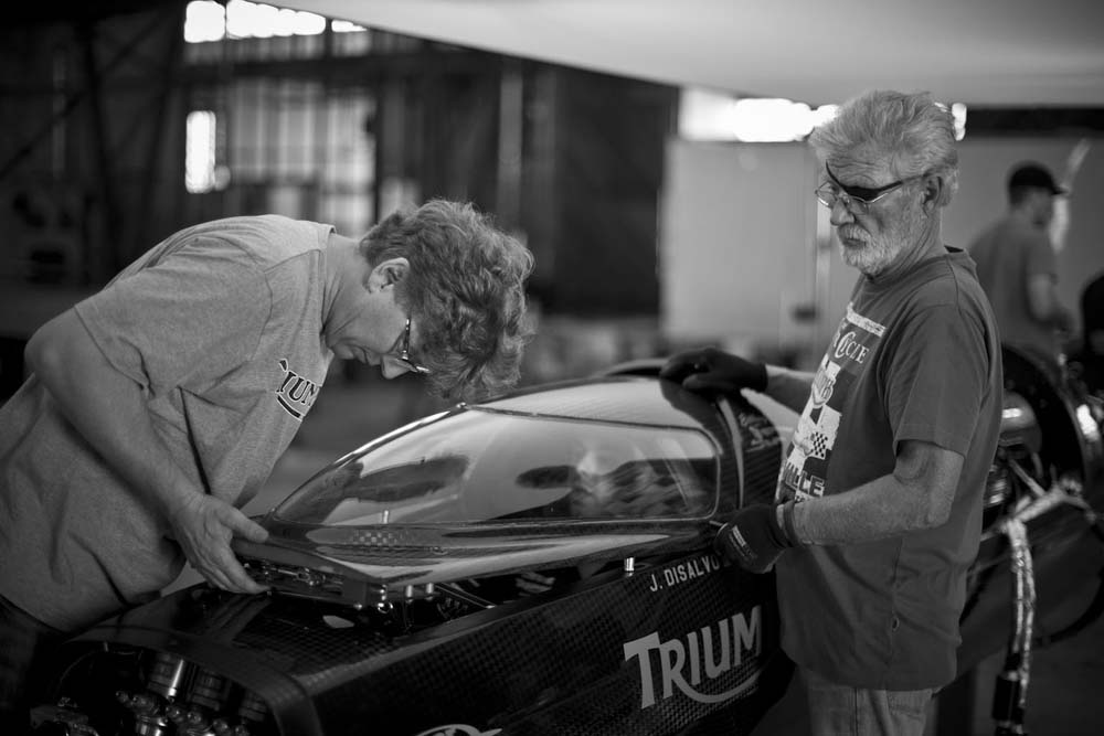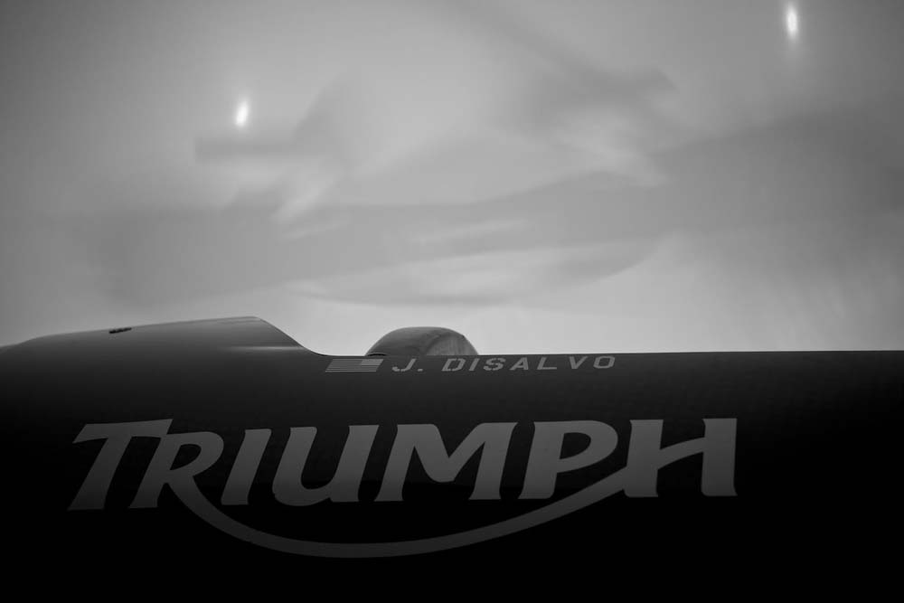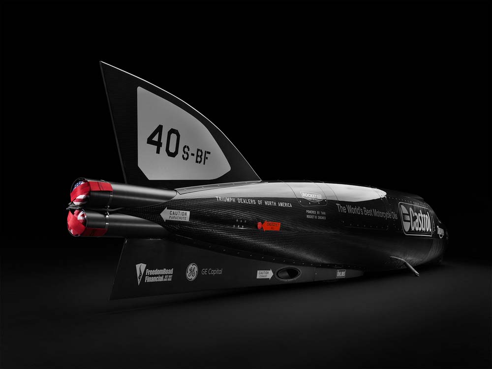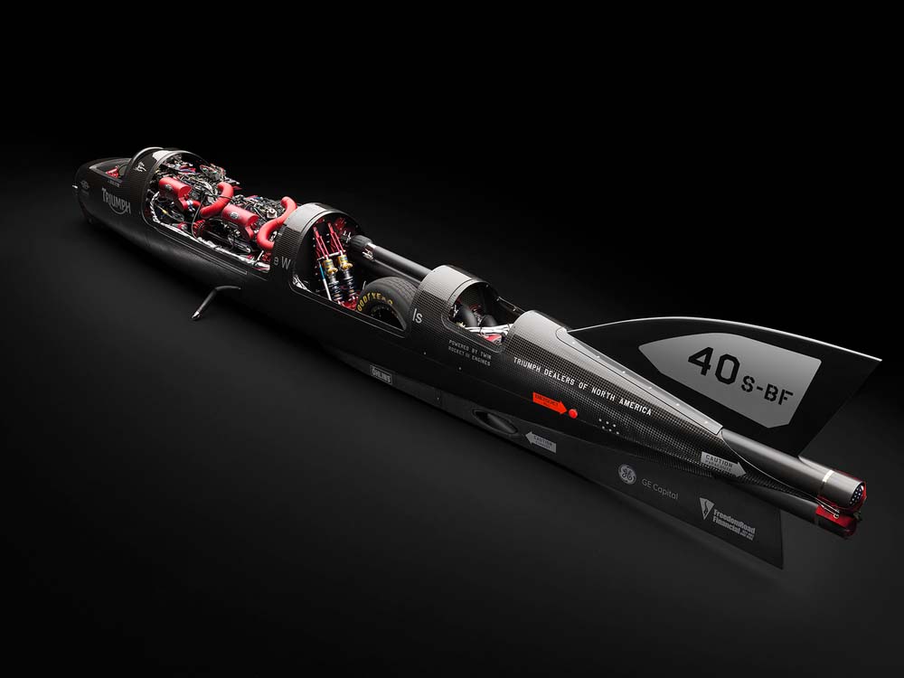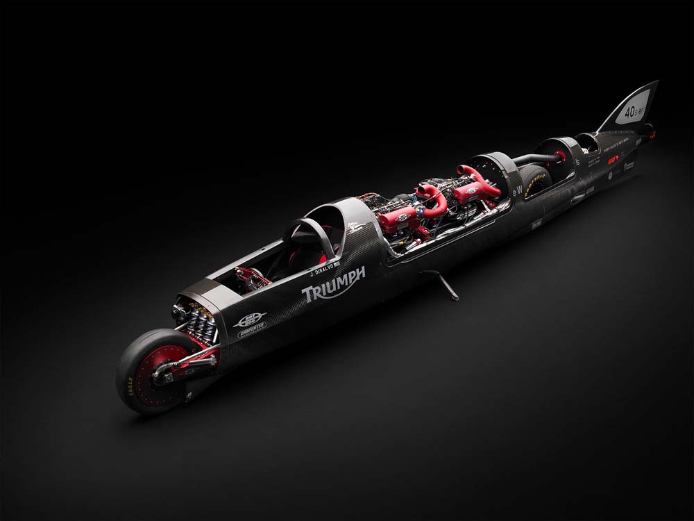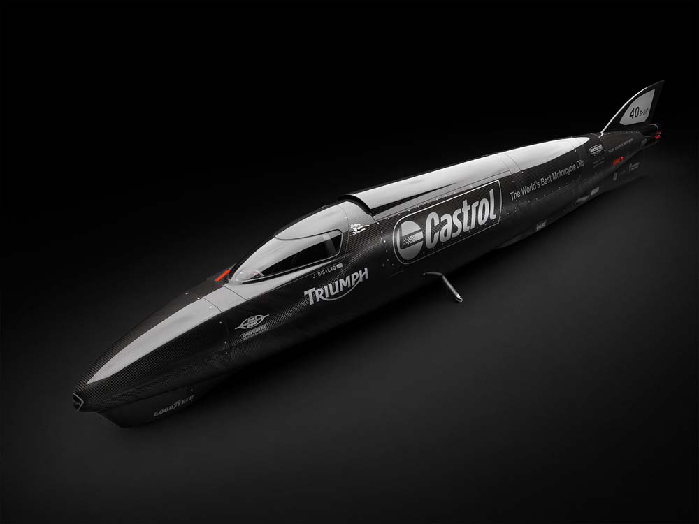 It goes without saying then that Triumph and Jason DiSalvo’s attempt at 400 mph on the Bonneville Salt Flats is a serious endeavor. Piloting the carbon/kevlar clad the Hot Rod Conspiracy/Carpenter Racing Castrol Rocket, DiSalvo will have two turbocharged Triumph Rocket III engines, good for a combined 1,000+ hp and 500 lbs•ft of torque when burning methanol, hurling him down the land speed record course on two wheels.