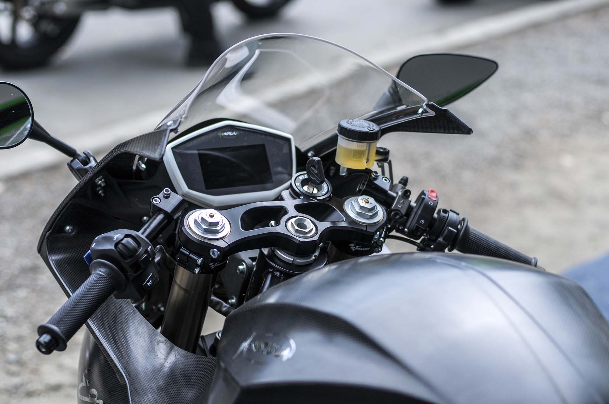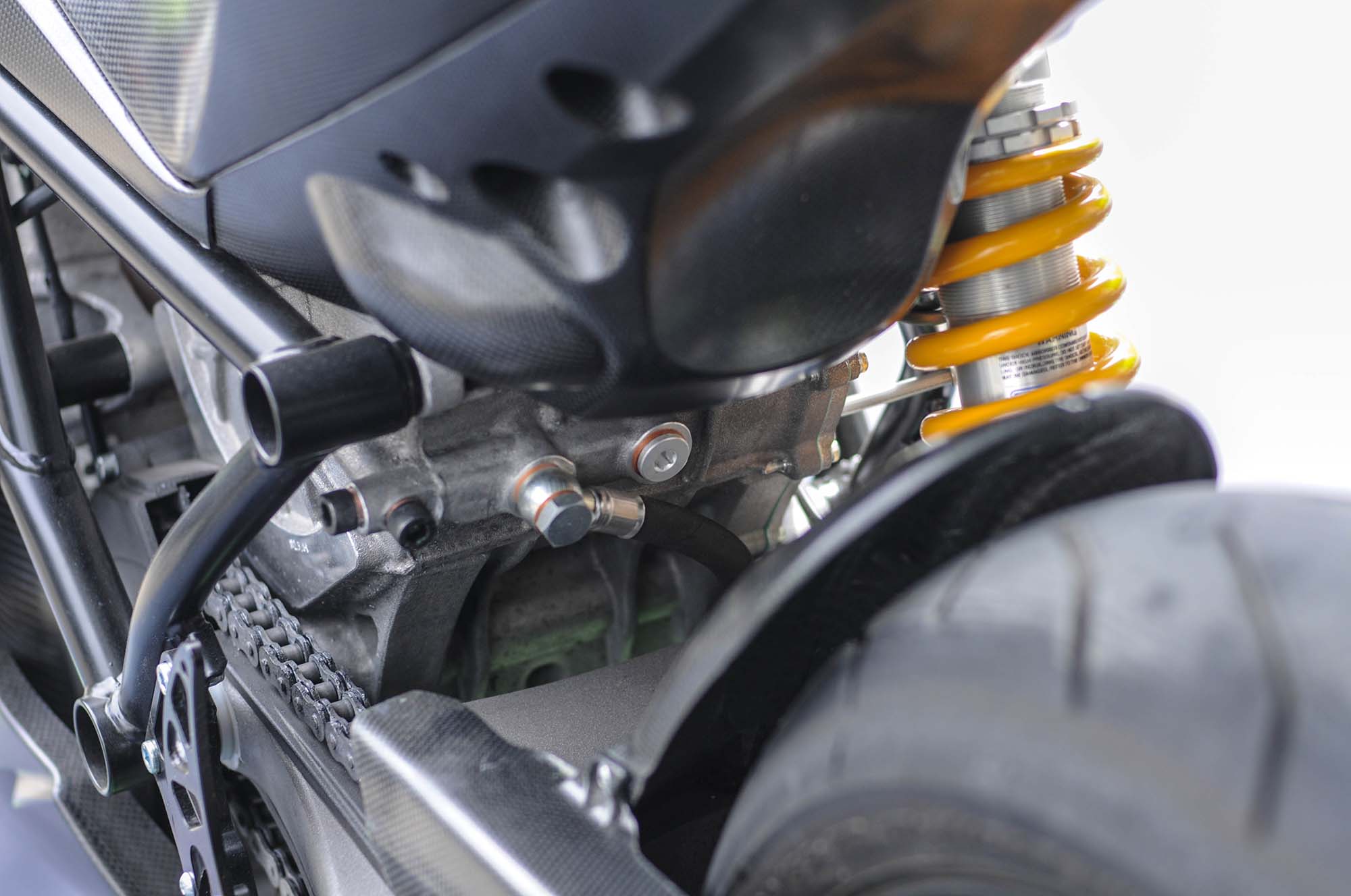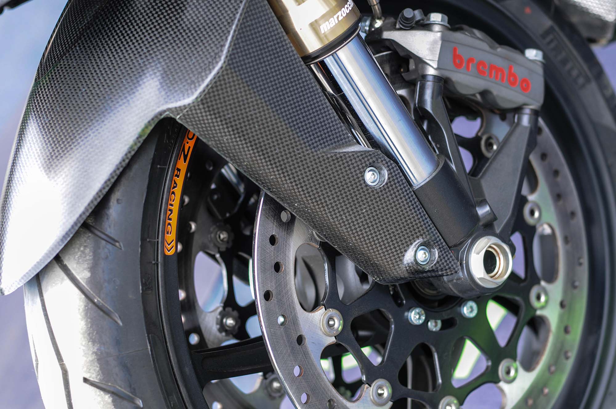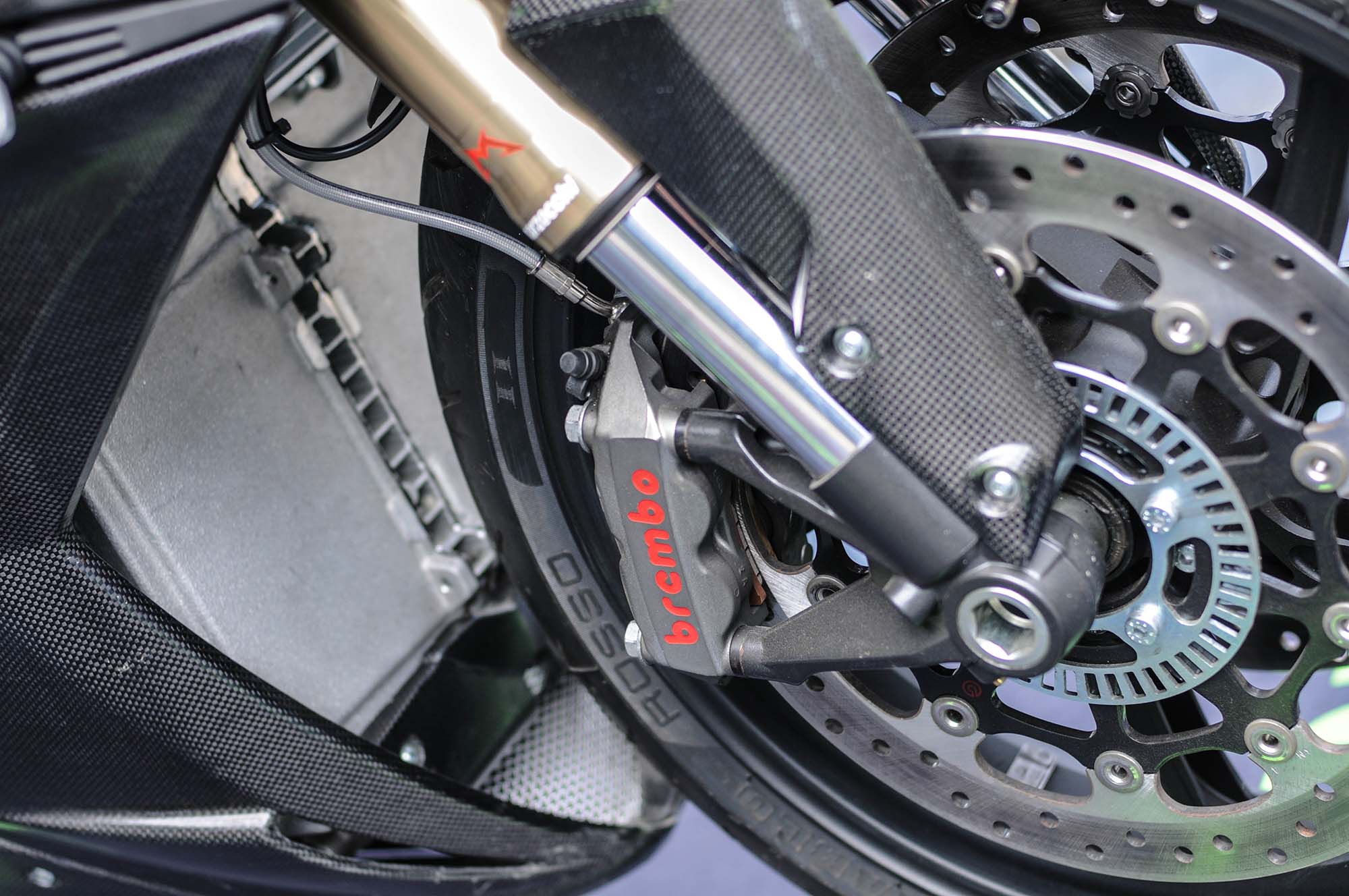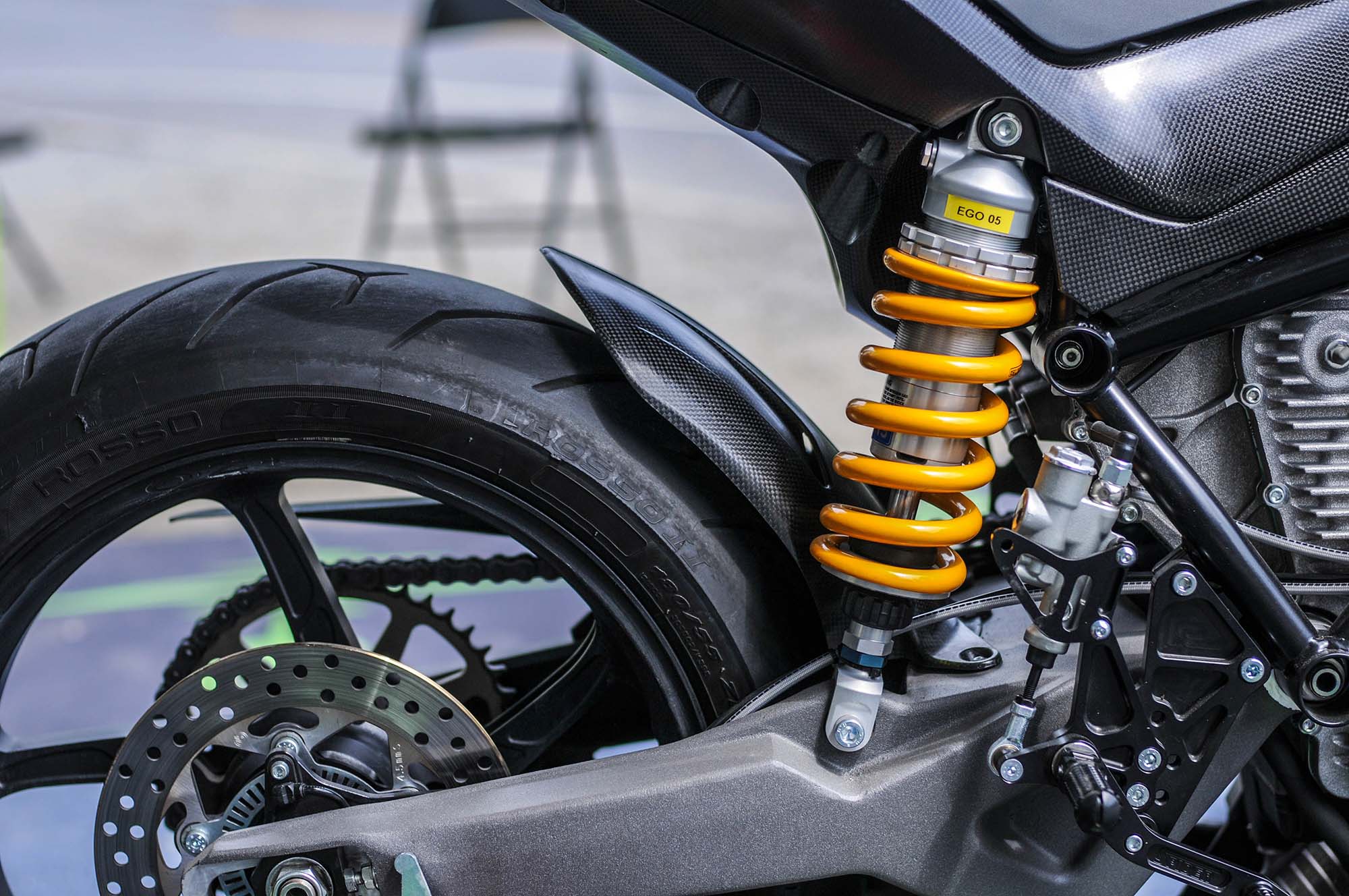 Fully adjustable Marzocchi forks upfront, and side-mounted Öhlins shock do the suspension duties on the Ego. OZ wheels and Brembo brakes complete the branding lexicon.