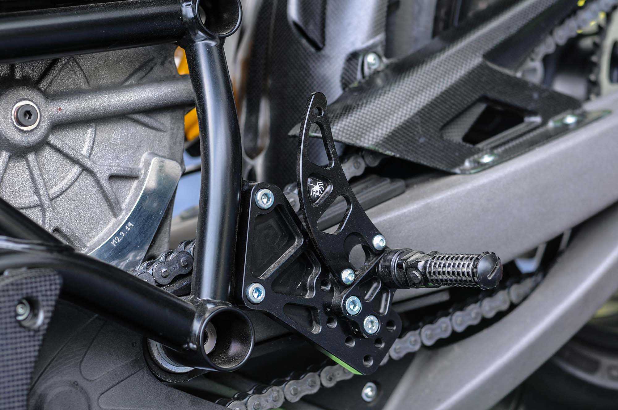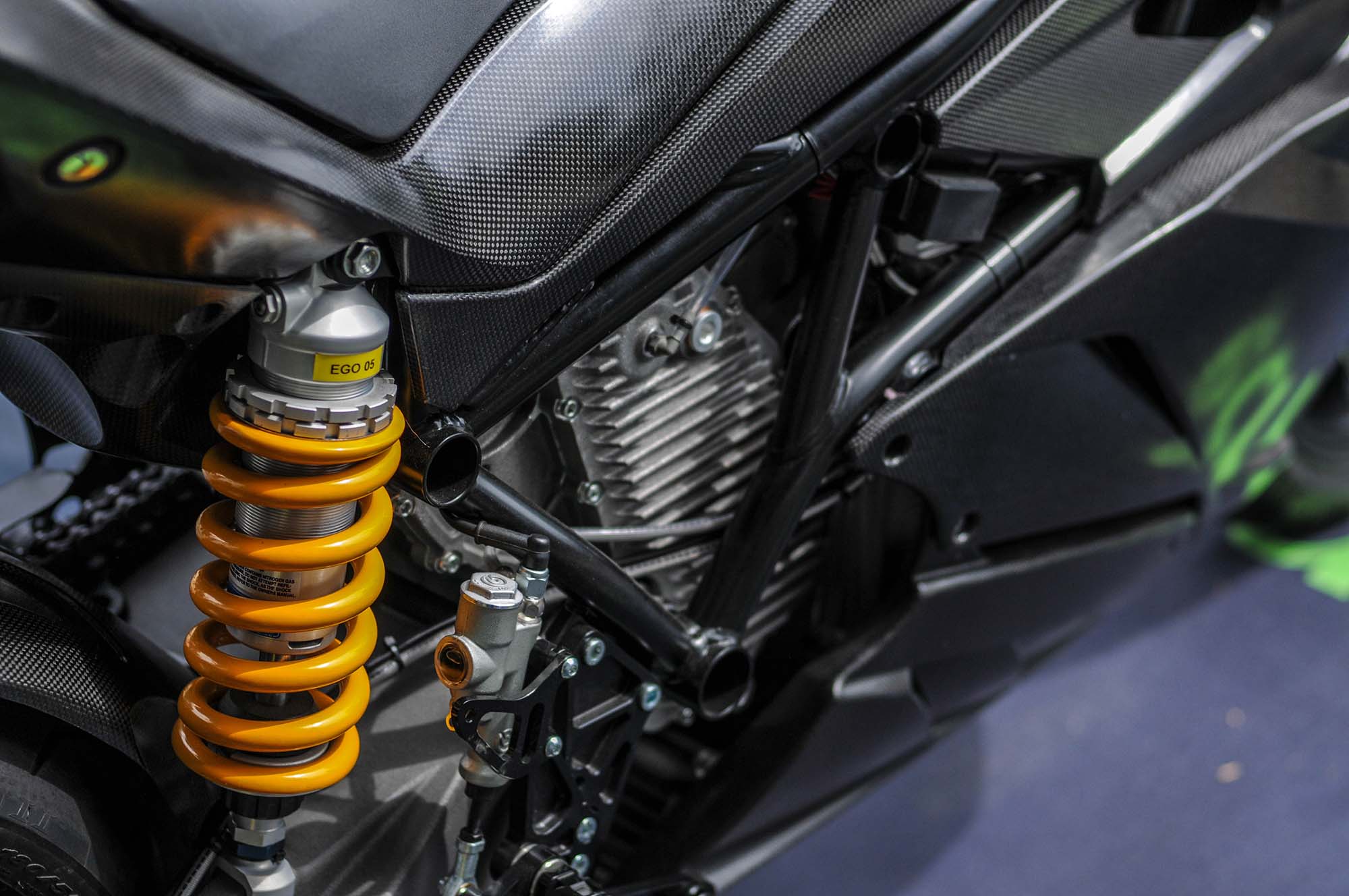 Surely designed to trouble those afflicted with OCD-tendencies, a careful examination of the Ego’s drivetrain packaging reveals the need for the rear shock to be offset so greatly to the right-side of the swingarm, as it makes room for the PMAC electric motor that protrudes over the cast aluminum swingarm.