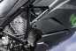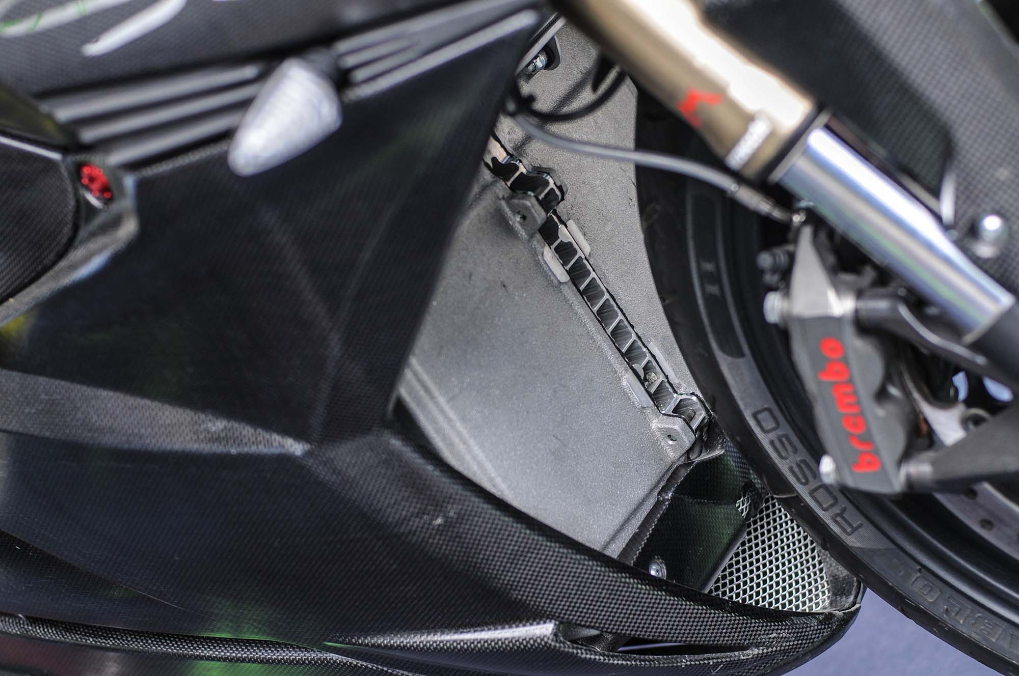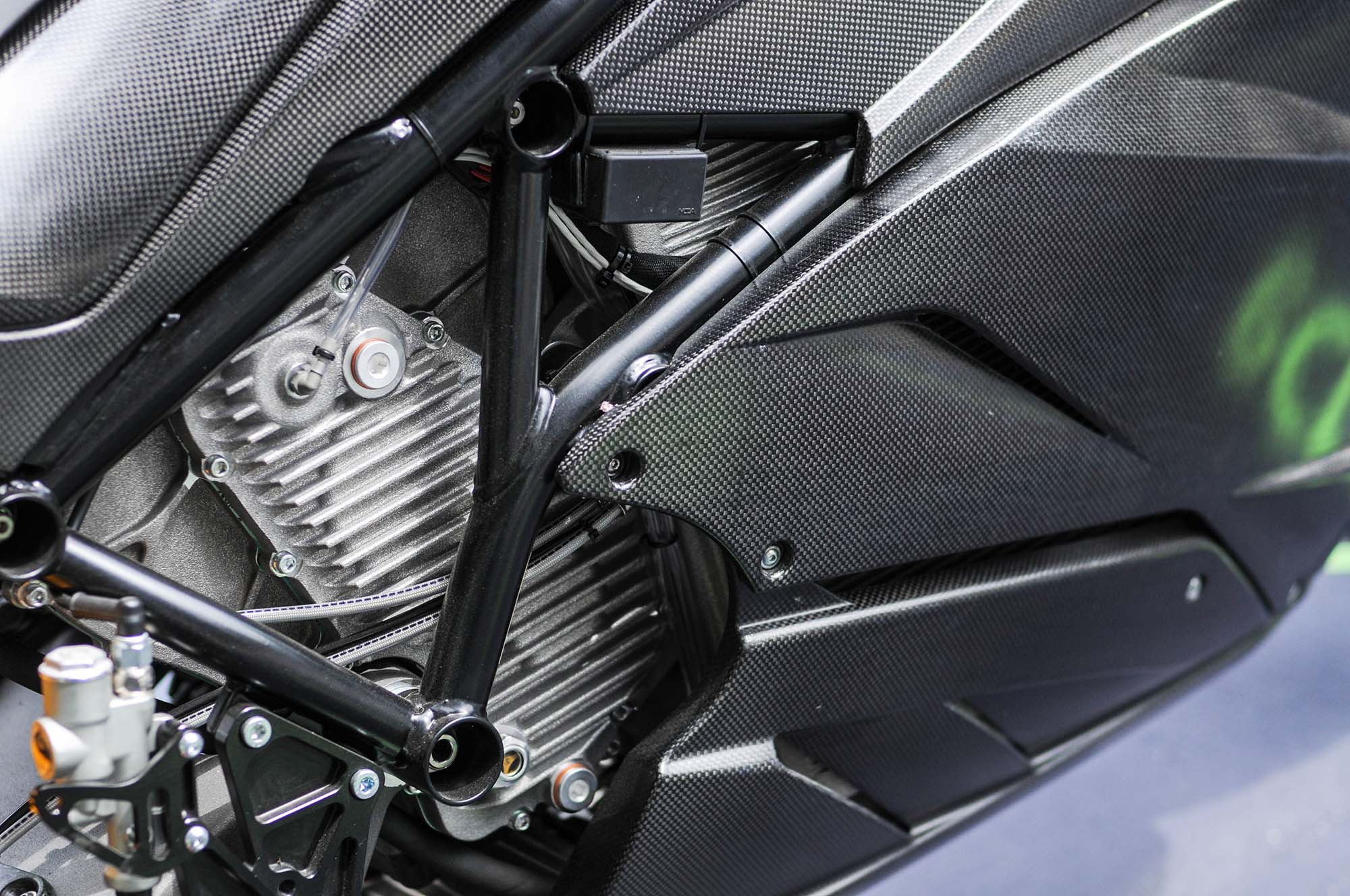 Through the fairings you can see the trellis frame, which is mated to various rapid-prototype plastic subframes and fairing stays. Beneath the 569 lbs bulk one can see the metal enclosure for the 11.7 kWh (nominal) battery pack and controller, which use water, oil, and air cooling (note the slots behind the front tire, which allow air down the center of the battery pack) to manage heat in the Ego’s systems.