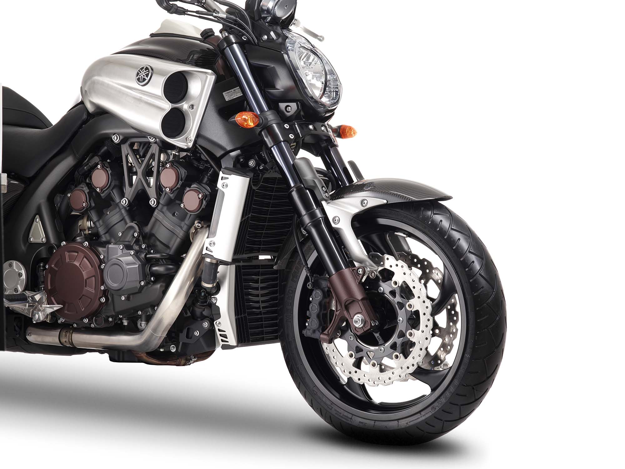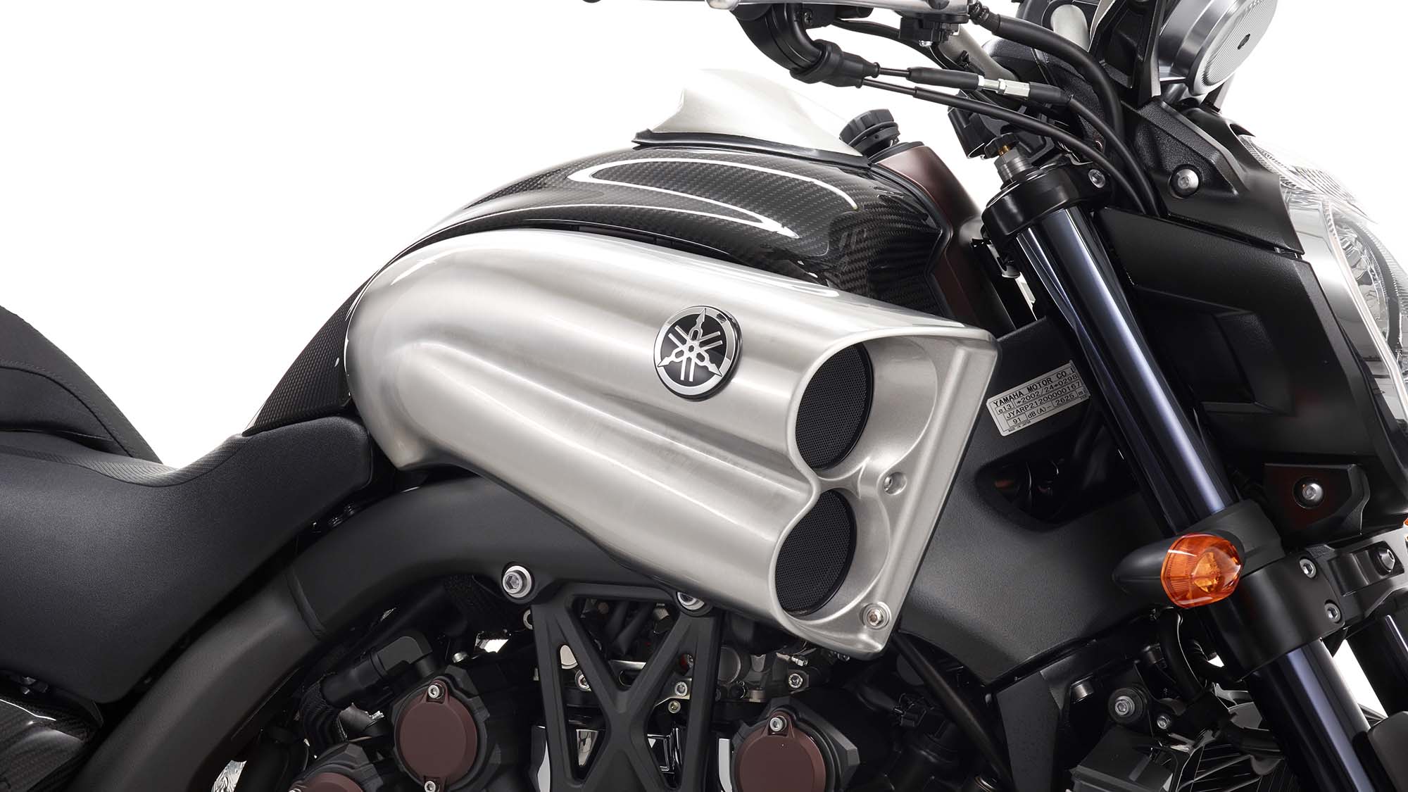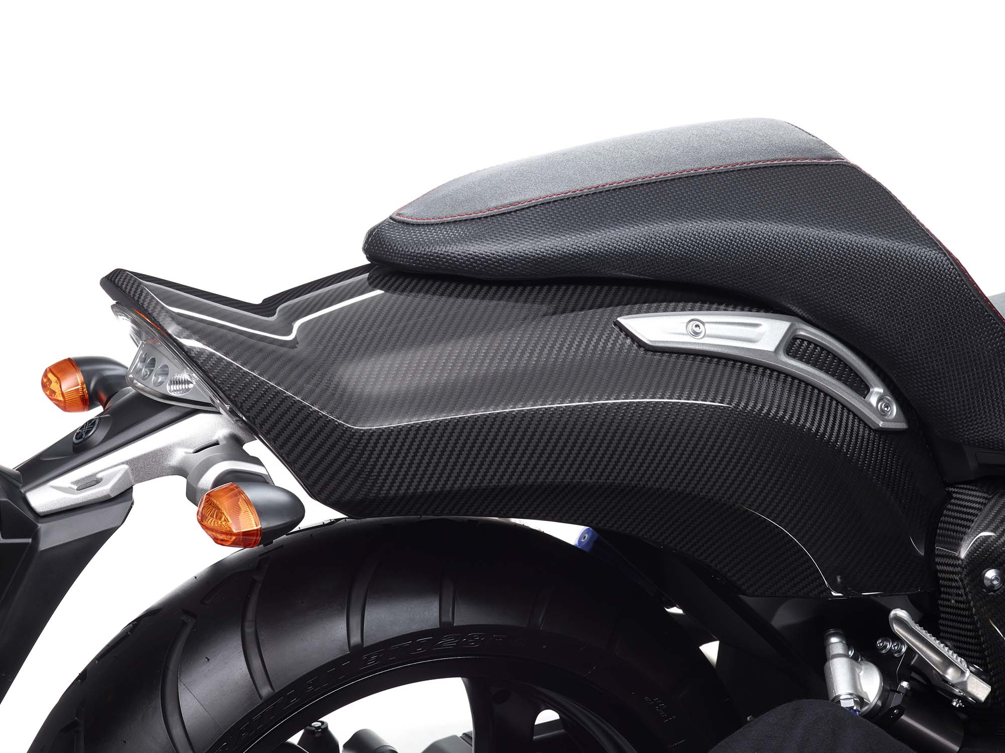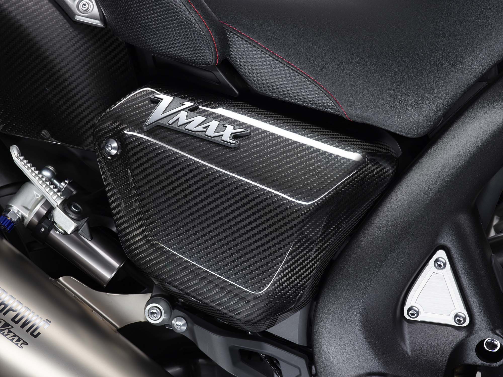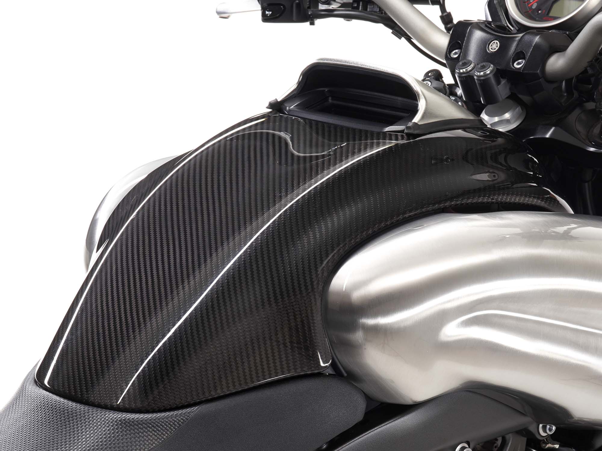 The 2015 Yamaha VMAX Carbon is exactly as the name implies: a VMAX drag bike laden with lightweight carbon fiber. In total, the VMAX Carbon’s tank cover, front and rear fenders, and side covers are all made from carbon fiber.