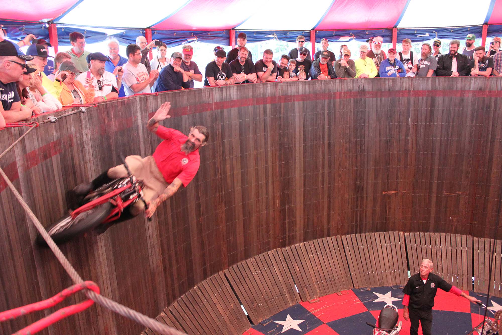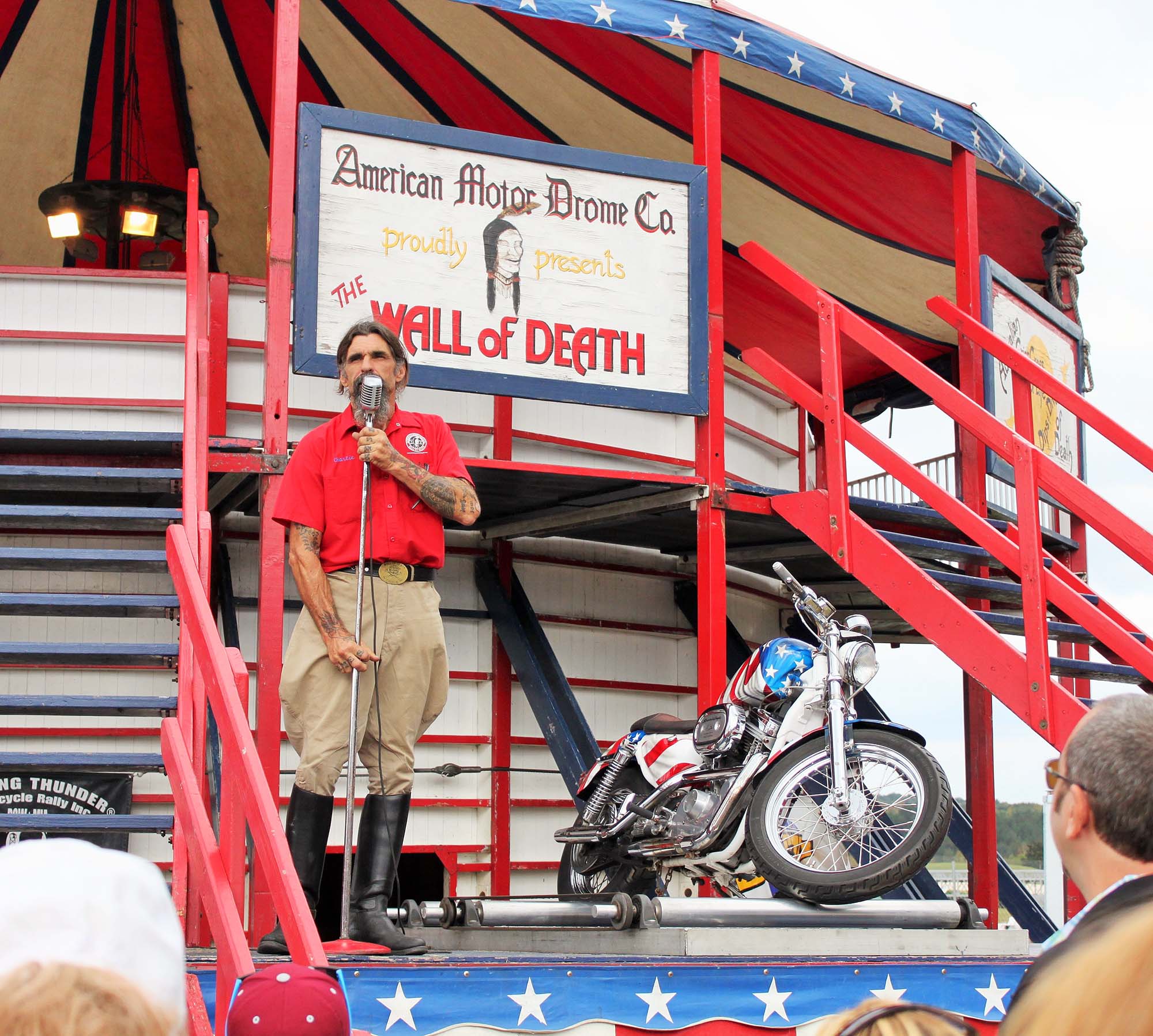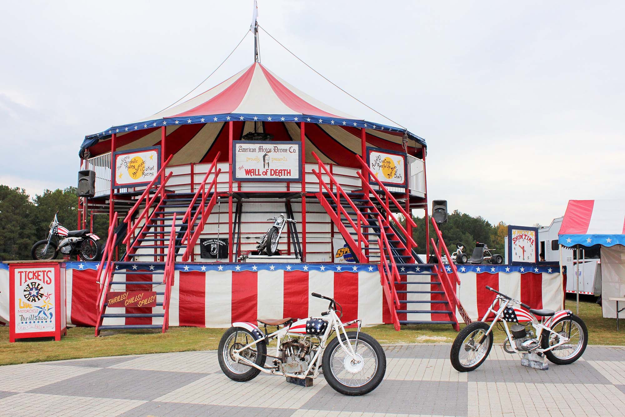 The final and biggest show was the American Motor Drome Company’s Wall of Death. This show involved riders zooming around a 15 foot tall wooden, cylindrical building on vintage American bikes.