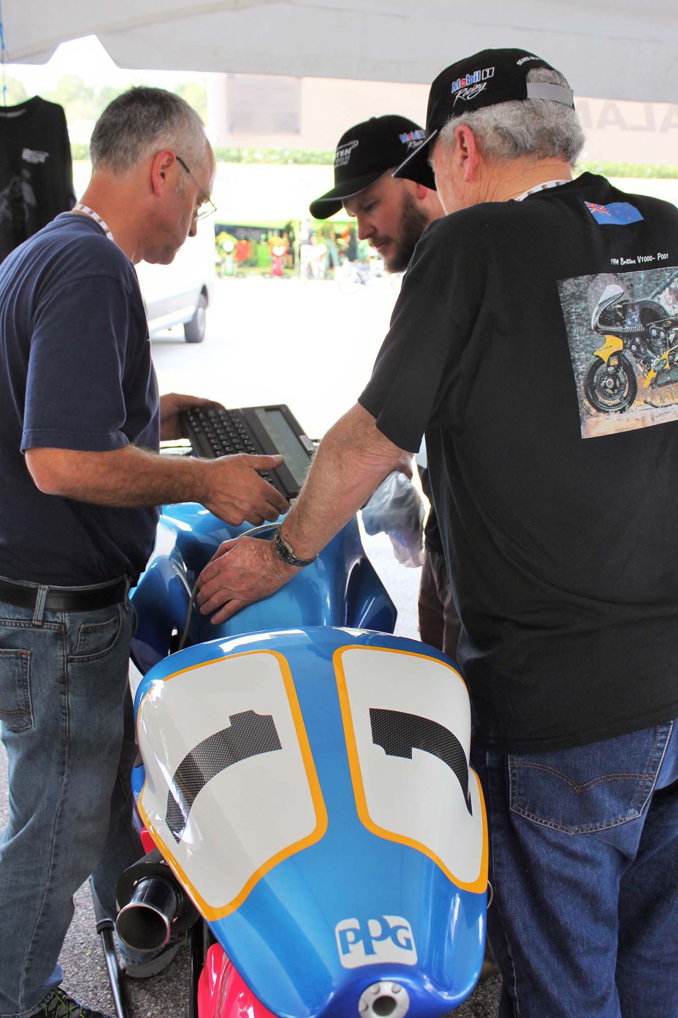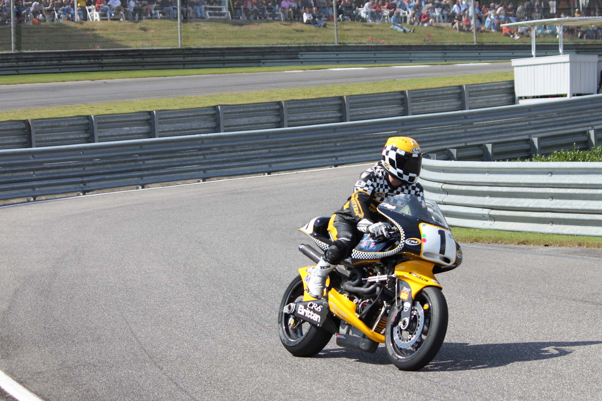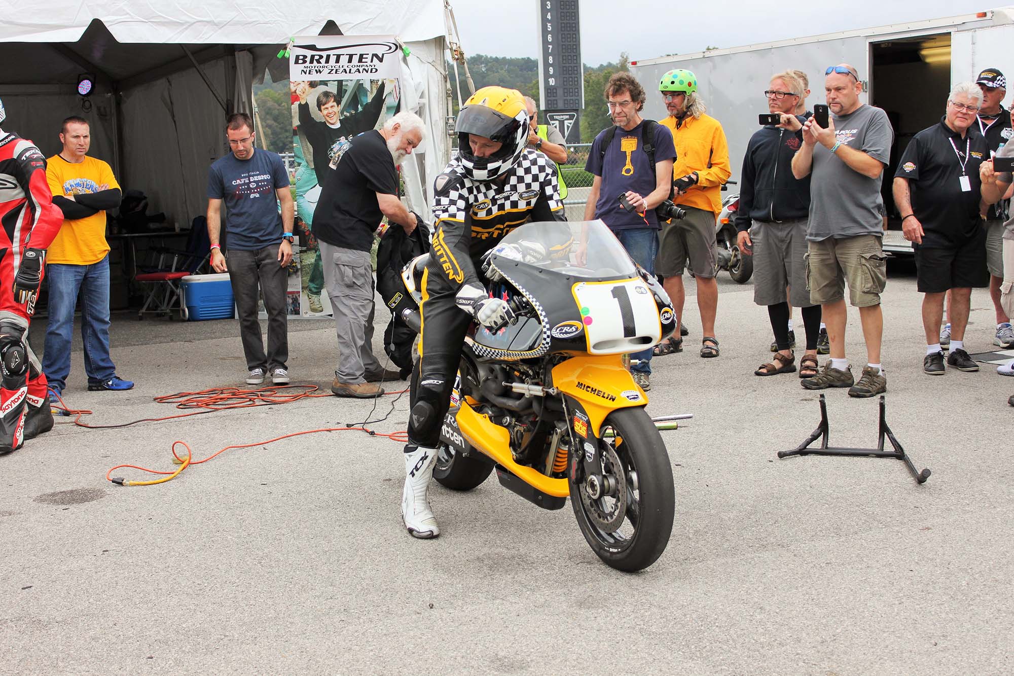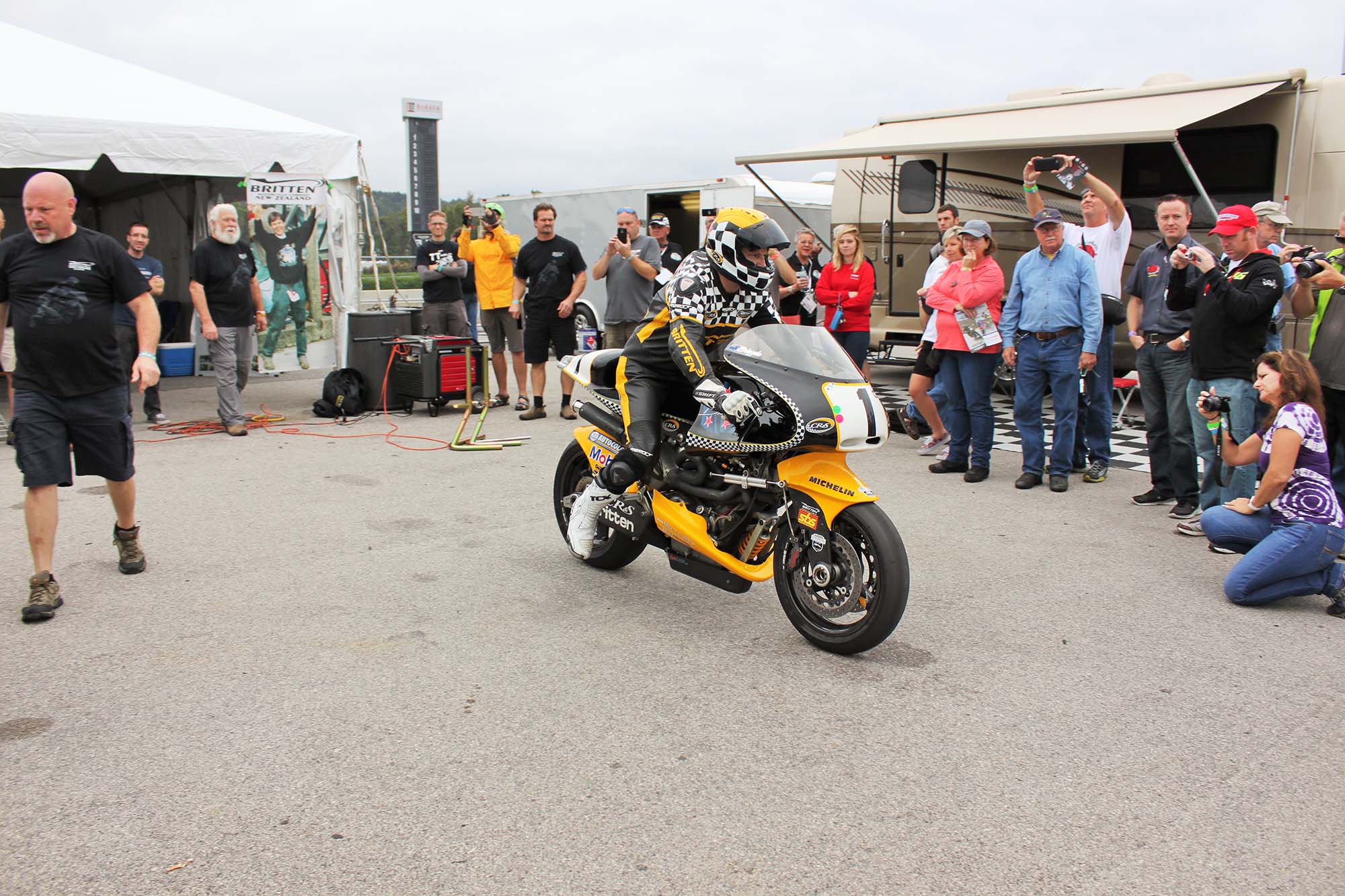 Andrew Stroud, an original Britten rider, actually wheelied his machine across the finish line in celebration. Prior Britten rider Steven Briggs was also on hand for the tribute events. Besides the bikes taking laps on the track, there were many other Britten events during the entire weekend.