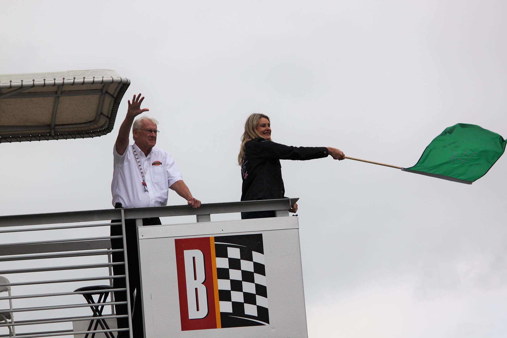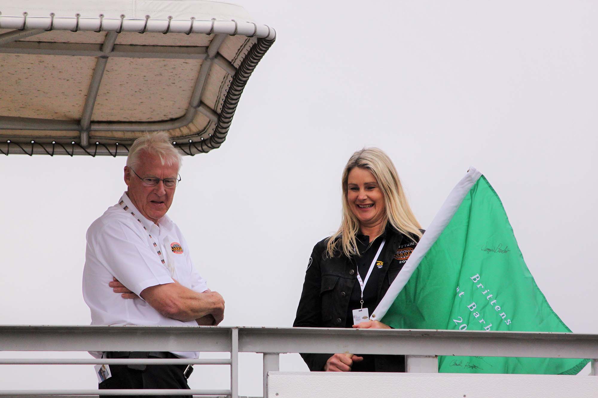 George Barber and Kirsteen were perched in the flagman’s tower at the start/finish line and Kirsteen started the 20 minute track session by waving a specially embroidered green flag.
