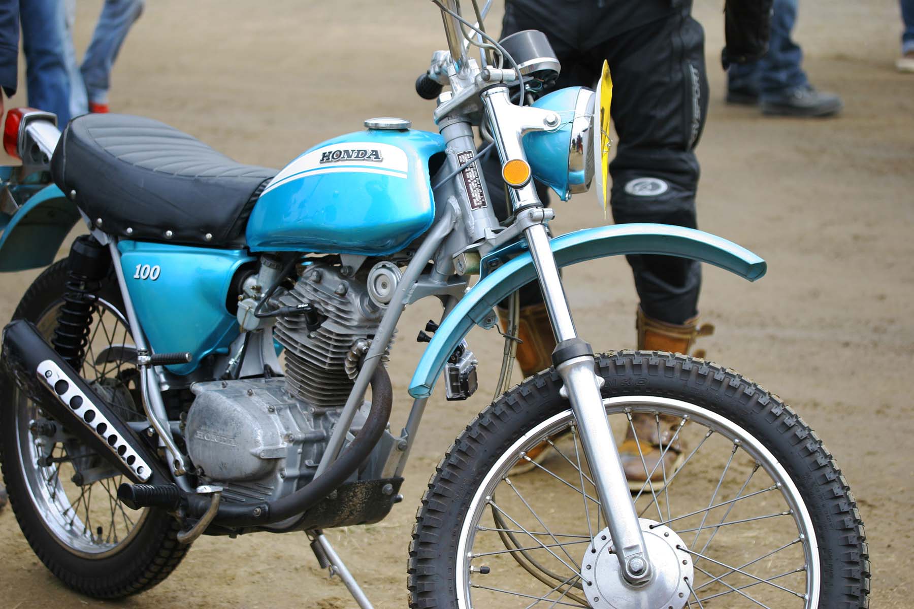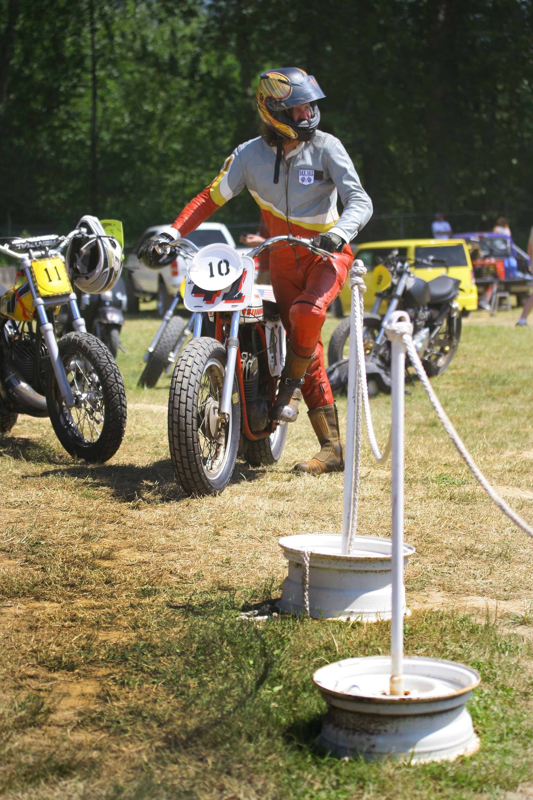 There were loads of 19″ DTR tire wearing CRFs, an SV1000 framer with seemingly unlimited horsepower and unpredictable handling, a tiny woman on an SL100, George Kassapakis on a CR250 framer (looking like some Tom of Finland character wearing a thick black moustache, leather pants and hat, and dark glasses cruising around the pits), countless SR500s, a freaking MZ, three ninja 250s, an air-cooled GSX-R streetfighter, and a Brammo Enertia.
