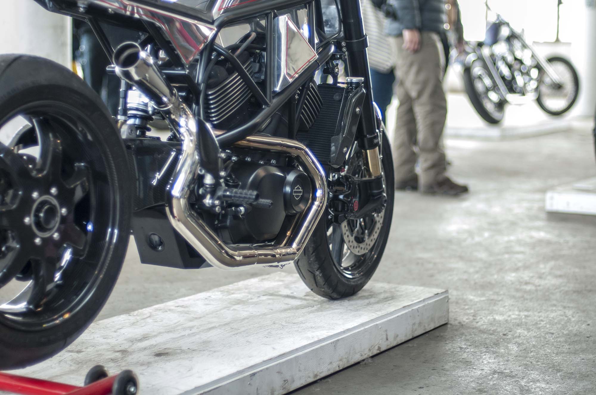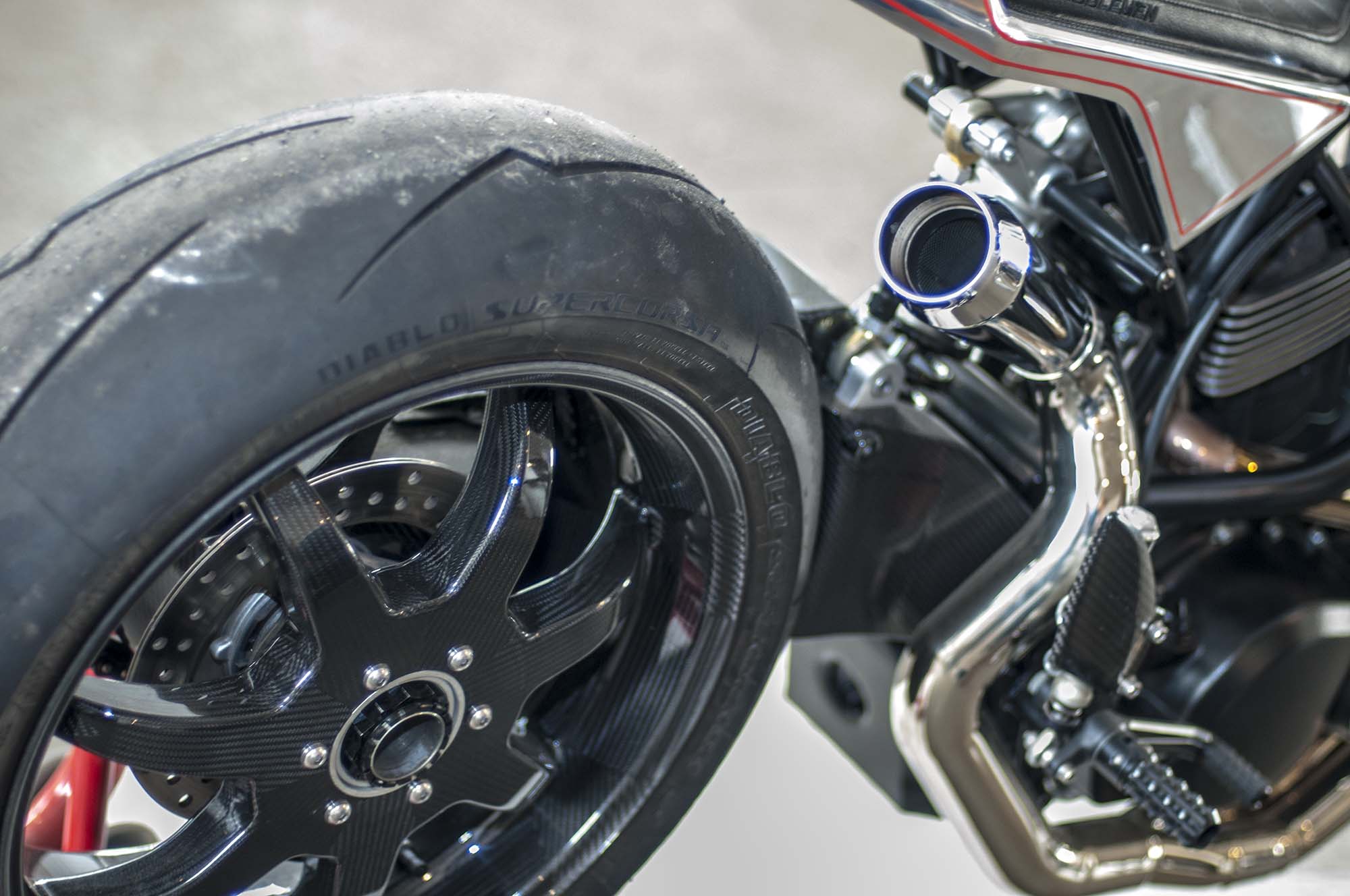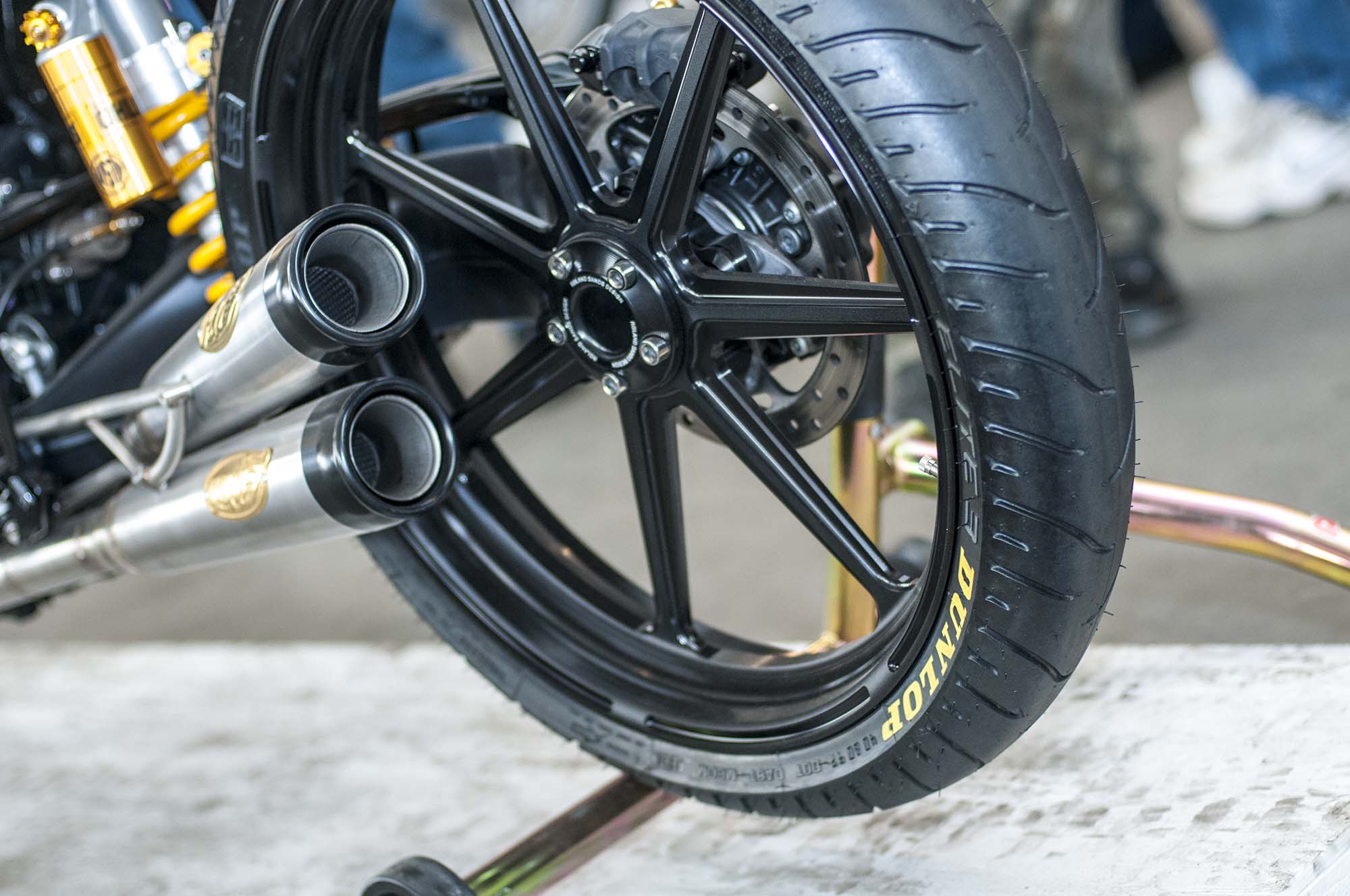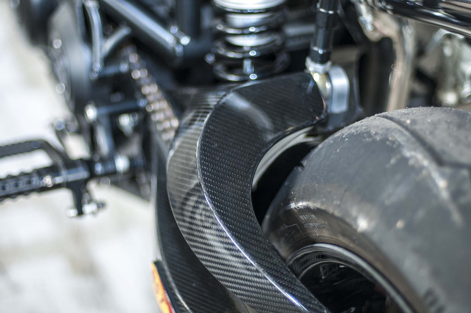 The world might be collapsing when the sportiest custom you see at a bike show is from the Bar & Shield brand, and yet here we are with Suicide Machine’s tasty Harley-Davidson 750. The bike has not only carbon fiber wheels from BST, but also a carbon fiber swingarm from the South African outfit.
