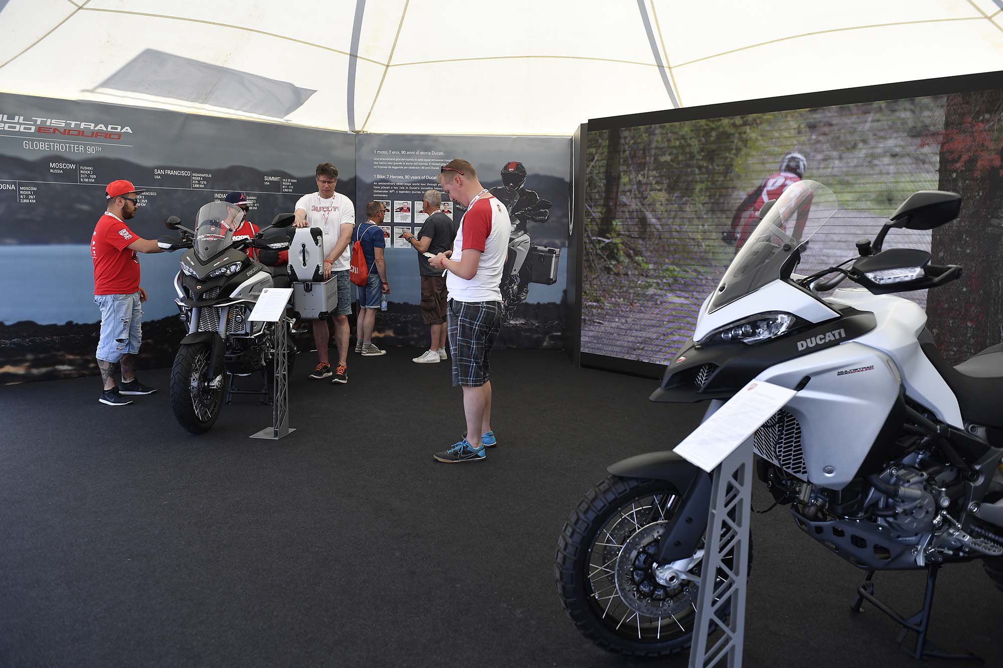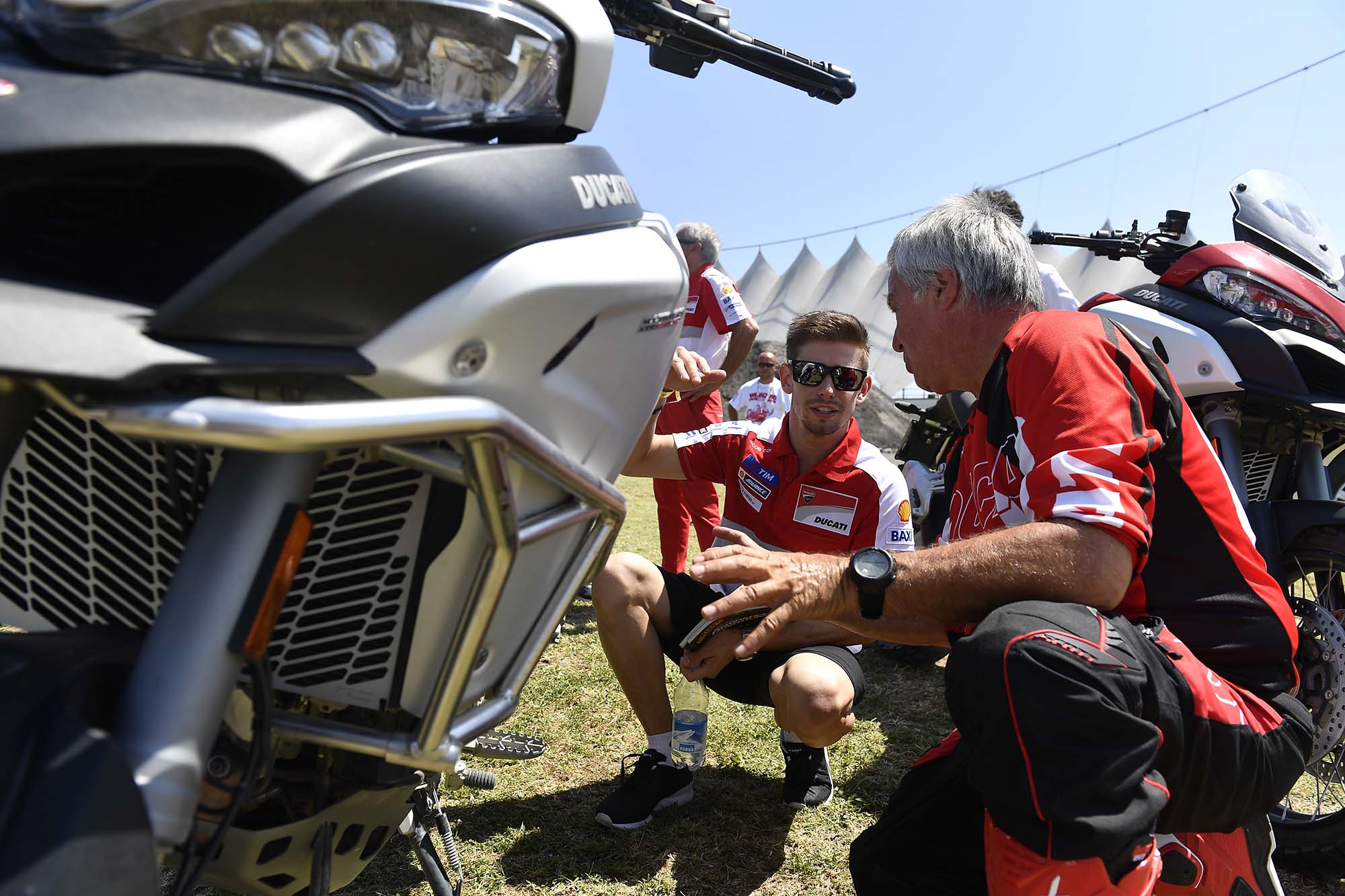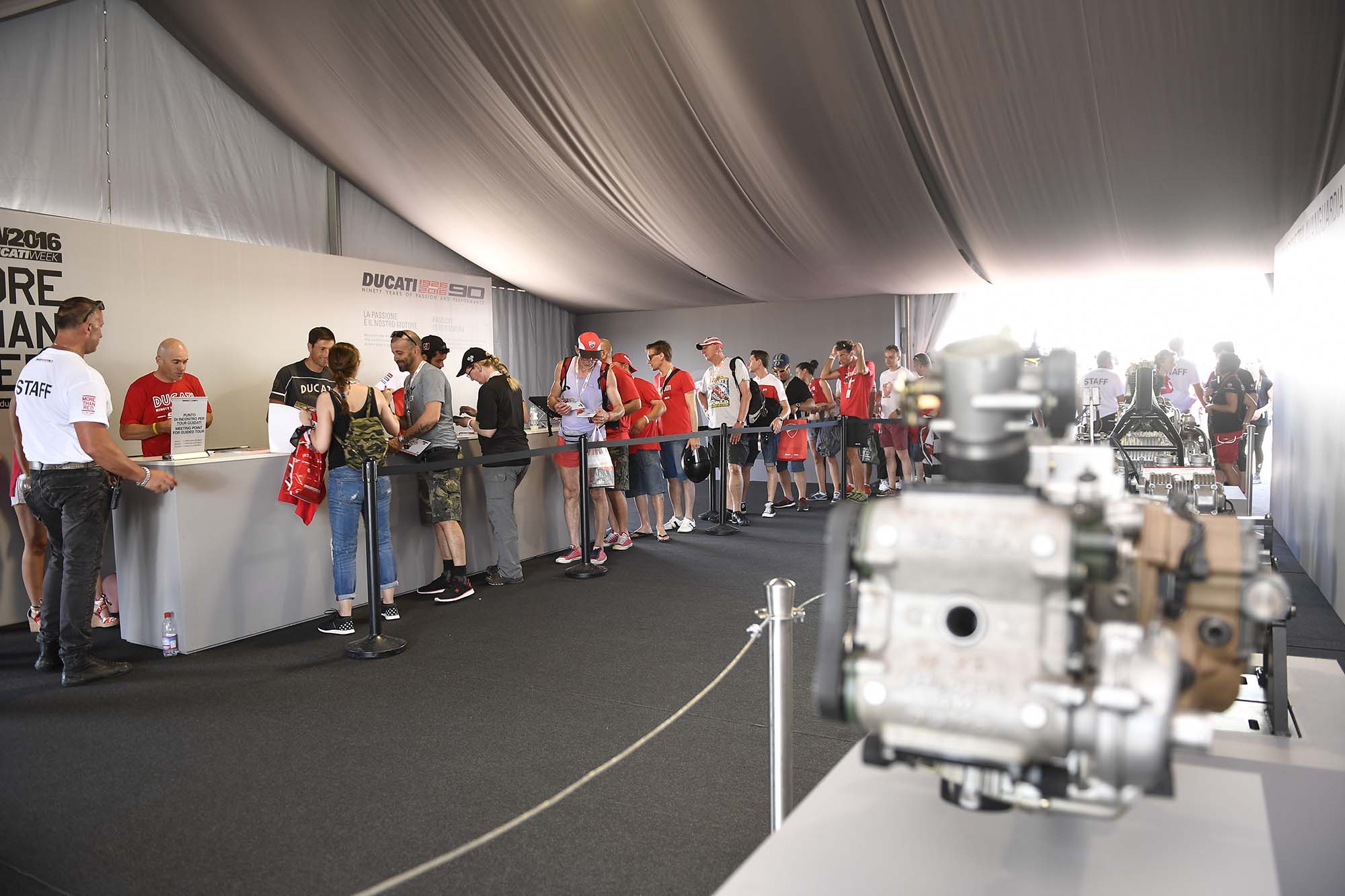 Stumble into any of Ducati’s several tents, and you can find a lineup of cutaway engines that show the Ducati lineage, or maybe an exhibition match between the Ducati Corse MotoGP and WSBK mechanics, testing which pair of wrench-turners can rebuild a Superquadro engine the fastest (hint: always bet on Team WorldSBK).
