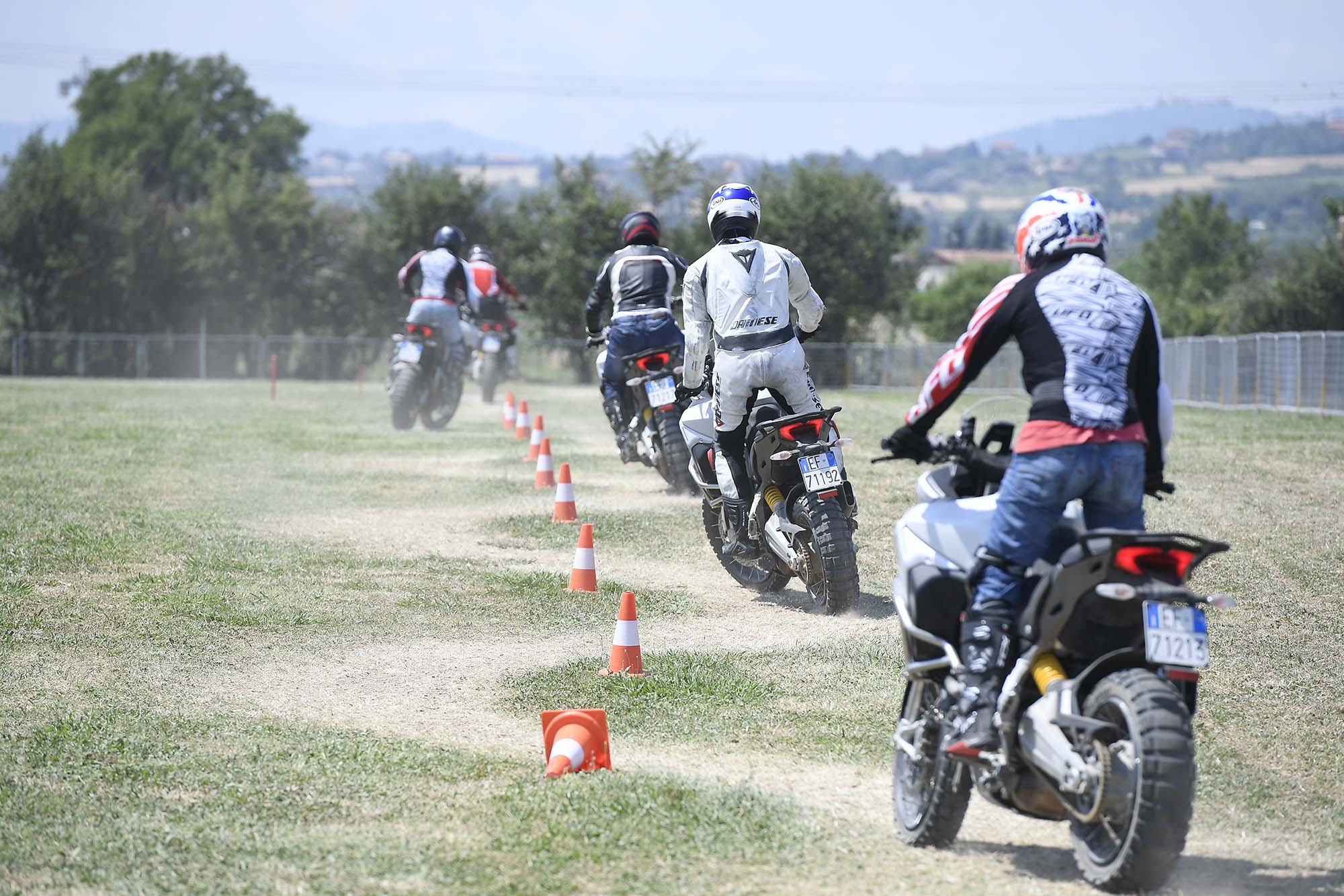 The DRE Enduro instructors guide you through several drills: weaving through flags, balancing along a plank, and summiting a sizable metal mound. Afterwards, you are left to freeride laps around a tight-turning course that’s marked on the field.