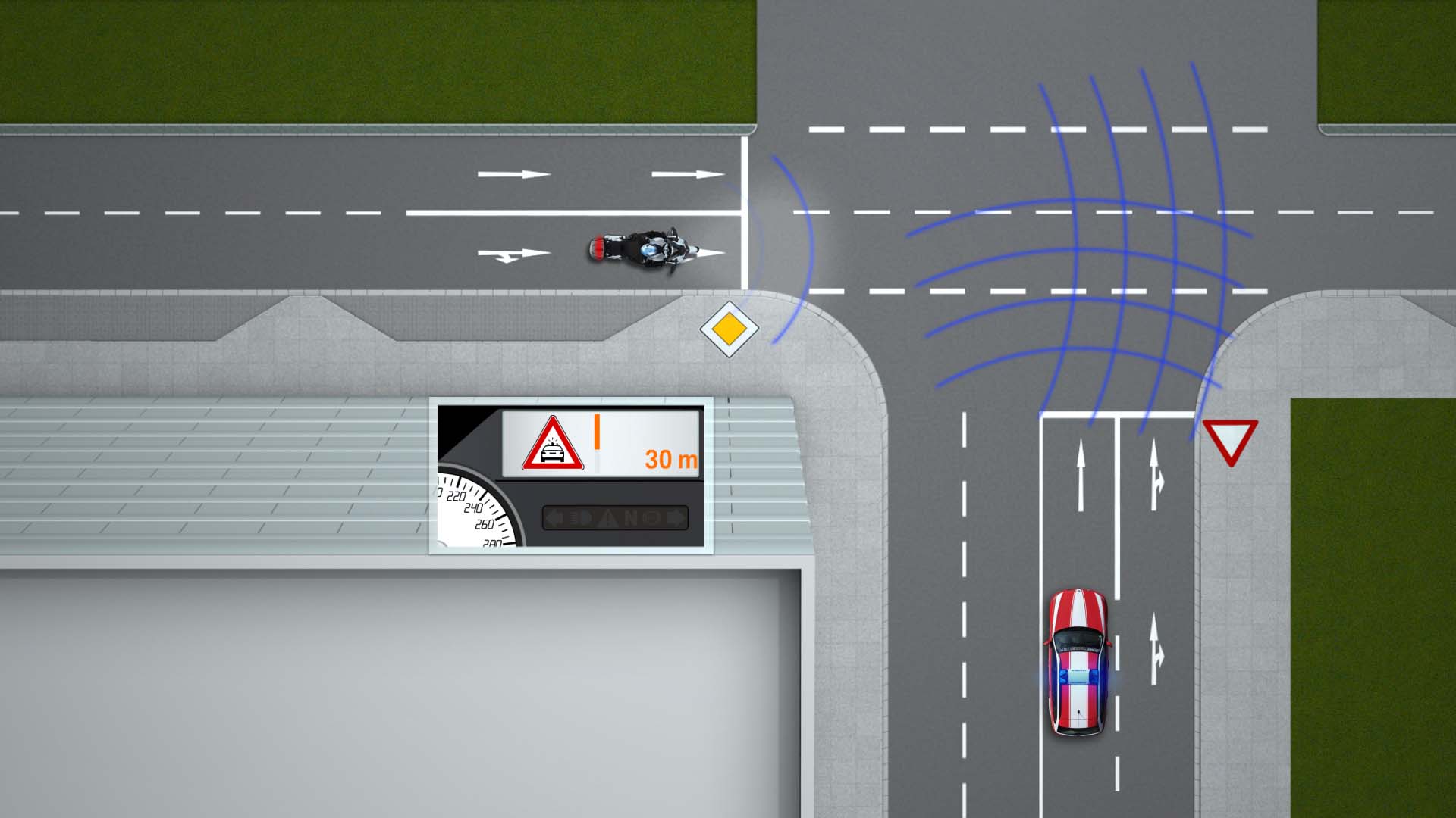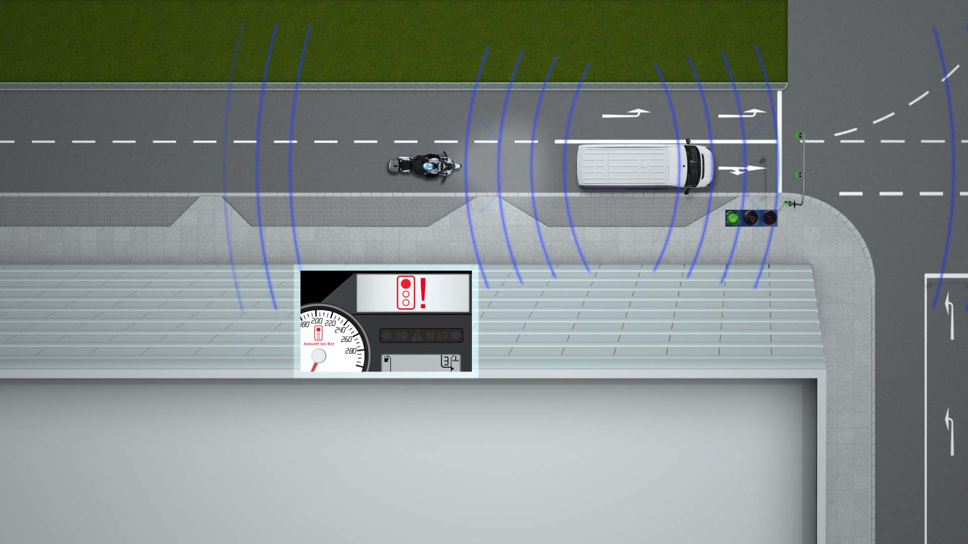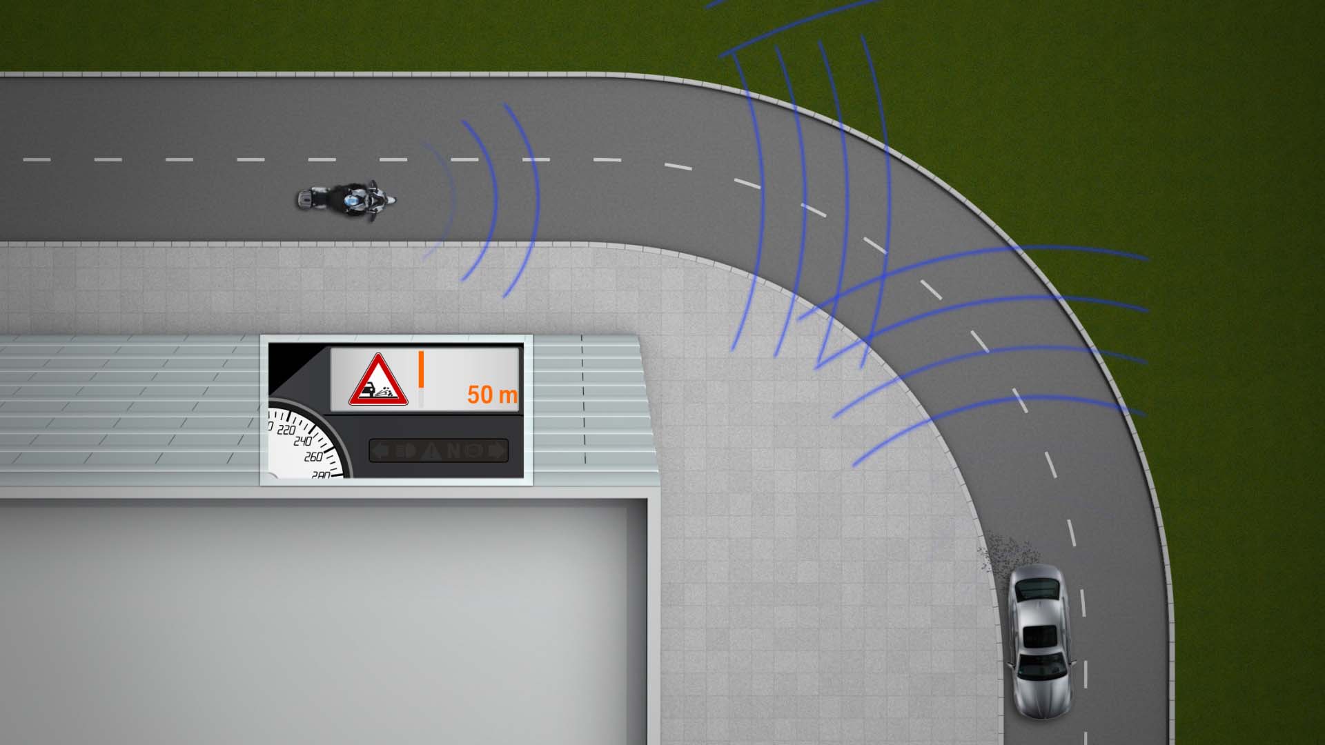 Other benefits from the system also include alerting riders and drivers to when there is a vehicle behind a blind turn, possibly about to enter the lane and cause an accident (it is worth noting that vehicles could also be made aware of oncoming, but unseen, traffic as well).