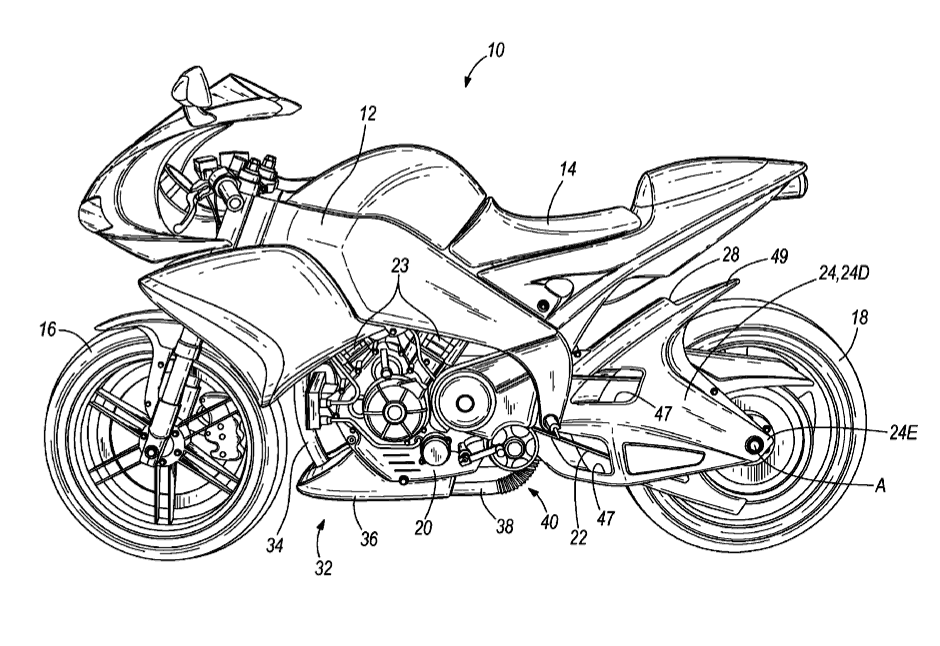 While the patent was published on October 28, 2010, its was filed by Buell last year (April 24, 2010), well before Harley-Davidson closed the company, and while Erik Buell still worked as a Harley-Davidson employee. As such, the patent is assigned to the Buell Motorcycle Company, whose intellectual property is still owned by Harley-Davidson.