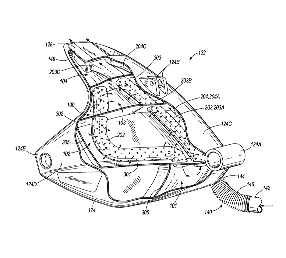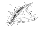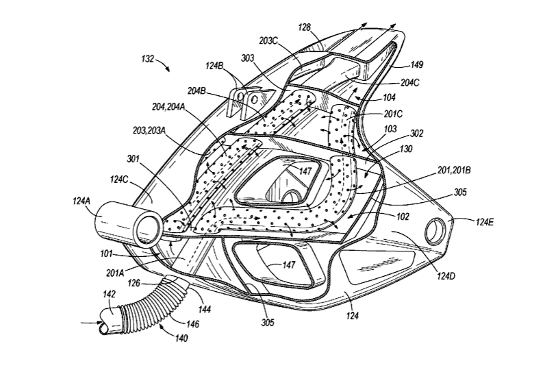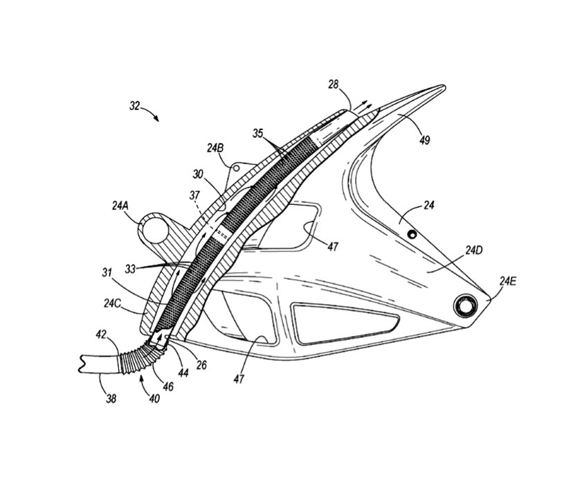 Once inside the hollow swingarm, a perforated pipe disseminates the exhaust gas into the swingarm chamber(s), which in-turn serves as secondary muffler of sorts (the patent provides that this could serve as the only muffler in the design if found to be adequate). The swingarm design includes exit ports for the gas to escape from, as exhaust fumes fill the swingarm cavity.