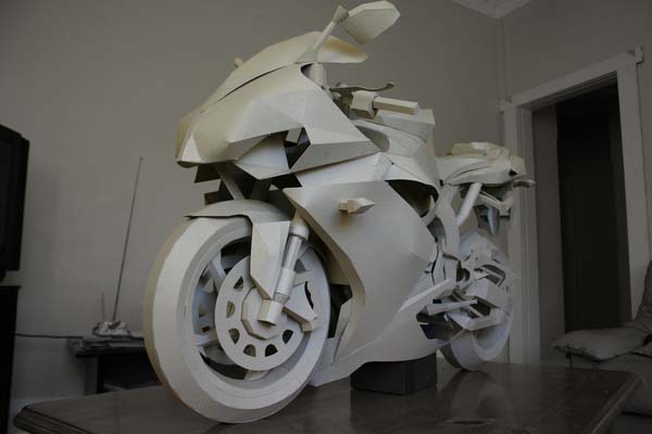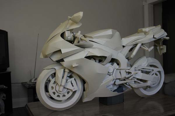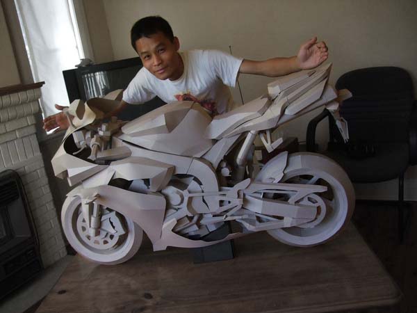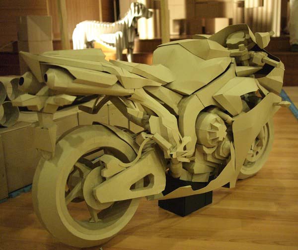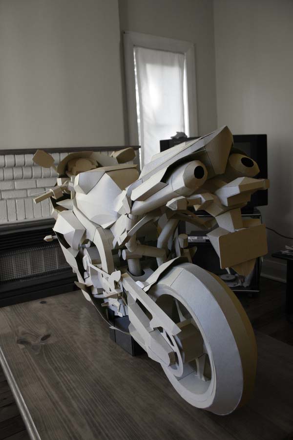 Roughly 60% the size of the genuine road-going version, Chen used Yamaha’s sheets as the basis for his masterpiece, and then super-sized the proportions. Skill, patience, and scissor control…you sir are a cardboard motorcycle Jedi, and we salute you. Photos after the jump.