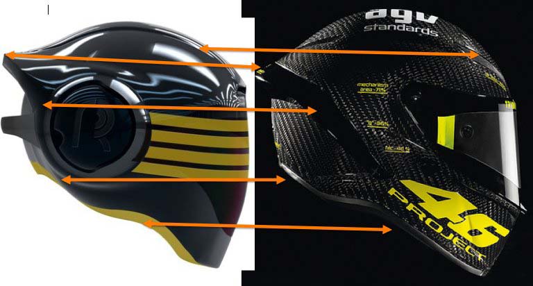 Del Rosario has a point with its statement, as the PistaGP’s chin bar and rear spoiler make for a striking resemblance to Del Rosario’s helmet renders, though it should be noted that similar rear spoiler designs can be found on several helmets already, like the Shoei X-Twelve. We will let you decide whether Del Rosario’s work and the PistaGP are cut from the same cloth, and whether those design elements are novel or not, but legally Del Rosario has some good leverage with the fact that they can presumably prove that AGV had seen the company’s designs before the PistaGP’s inception.
