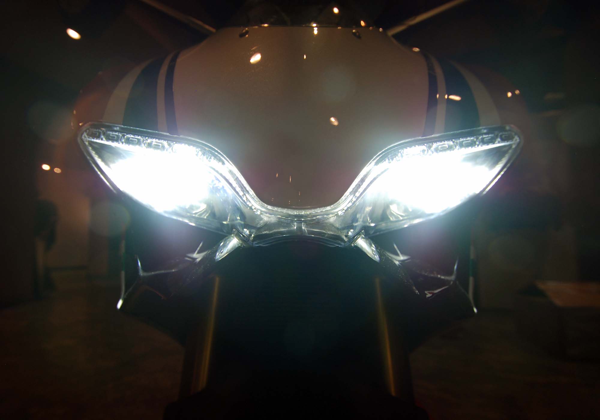 Common to all the Ducati 1199 Panigale superbikes, the LED headlight really is something to behold. In its low-beam setting, the two groupings of LEDs near the center of the Panigale’s nose illuminate the way ahead. They are noticeably bright, with a slightly bluish hue. Flipping the switch to the high-beam setting though, and the lux value doubles by our estimates, with the entire headlight array projecting photons. Sources have told us that the entire headlight package is very thin, and surely there is some significant weight savings occurring here because of the LED implementation.