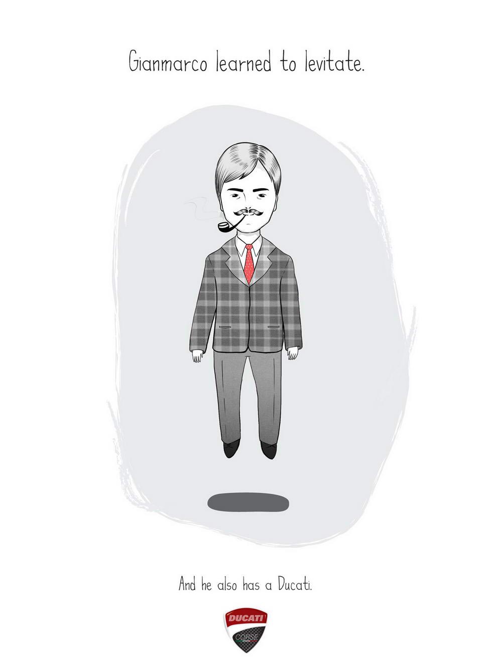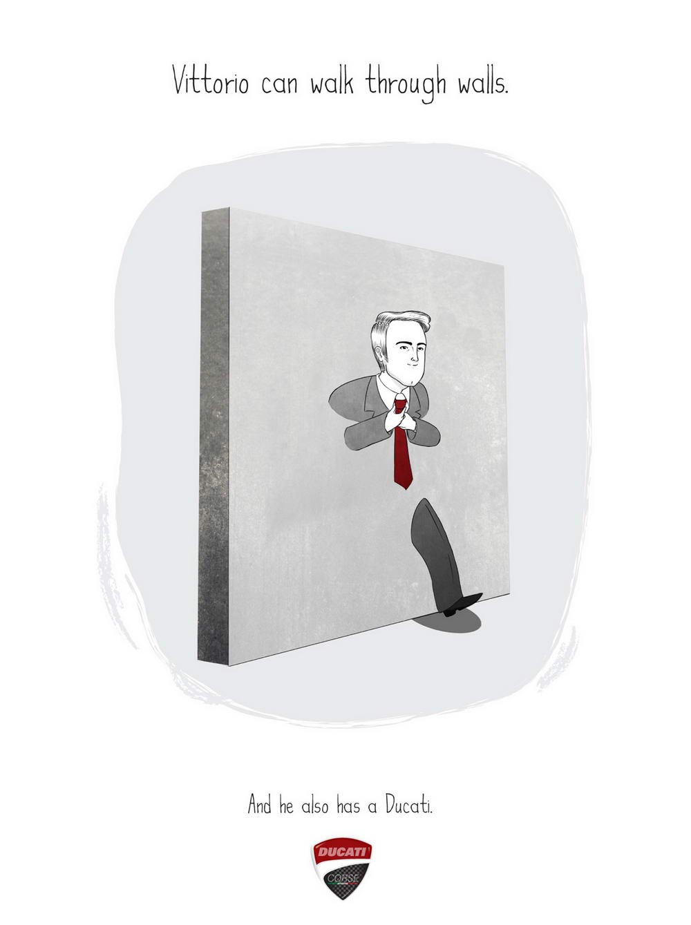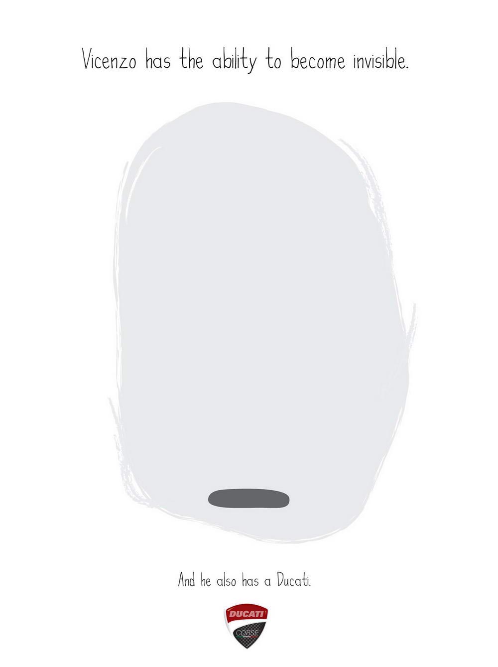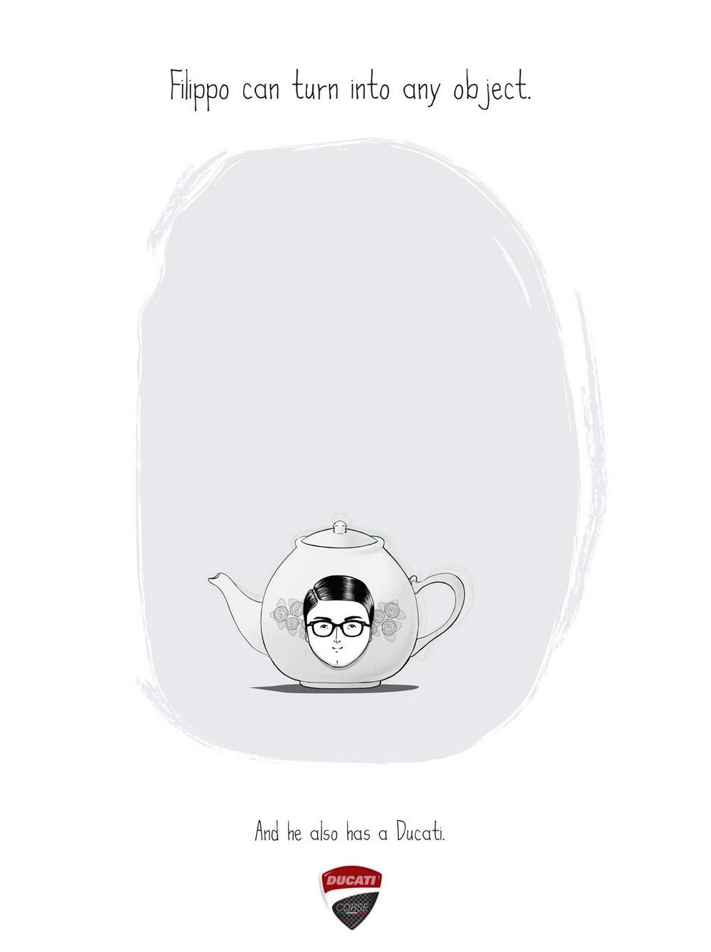 Trying to make a statement about how owning a Ducati motorcycle is as fantastic of an accomplishment as becoming invisible, turning into other objects, walking through walls, and levitating, we’re not sure that the comparison, though clever, is readily apparent when these photos stand on their own on a page. Better pitched in the idea room than executed on the paper, after the third advertisement or so it finally hits you (the walking through walls one was the “ahh-ha!” moment for us). But as for a clearly communicated message, there is a bit left wanting here from Ducati and its ad agency, The Grey Group…that and the teapot thing is just damn silly. More examples after the jump.