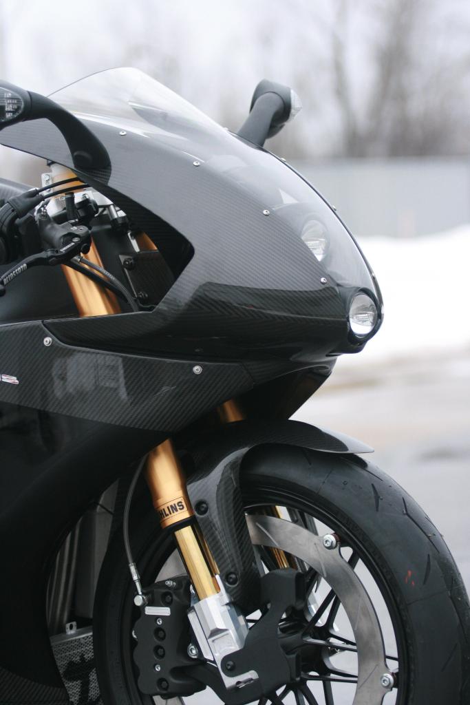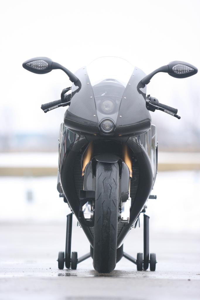 Styling will be subjective, but we happen to like the double-stacked headlight look that EBR has done here, while the mirrors with their integrated turn signals stick out oddly at us (and by oddly we mean the bike looks depressed). Looking at the bike head-on you can see the teardrop design in the fairings, which should make for good ground clearance (like on previous Buell models). Of course our favorite color for any motorcycle is going to be carbon black, which the EBR 1190RS Carbon Edition has plenty of in spades. We’ll live with the minimalist tail, and cardboard looking race seat…we’ll even live with those funky mirrors as they’re not needed where this bike was born to thrive.