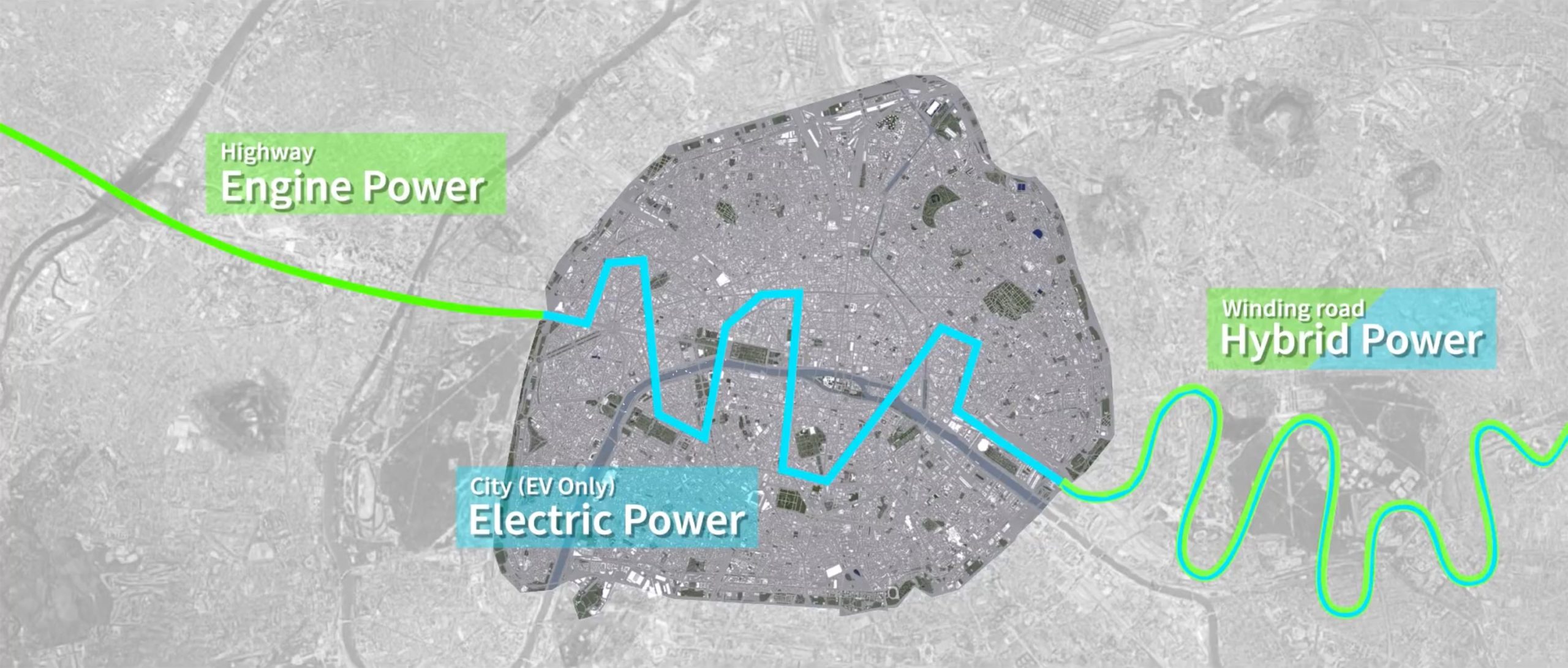 As the video shows, the motorcycle travels the highway into the city under internal combustion propulsion, switches to electric within the city boundaries, and the offers a hybrid boost during spirited riding. Presumably, this is the best of both worlds.