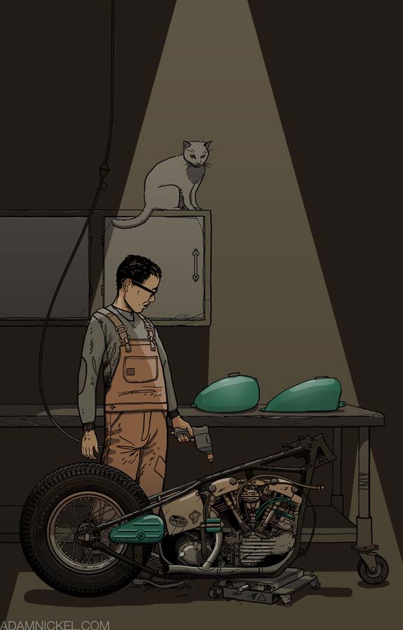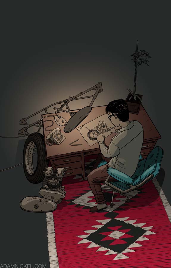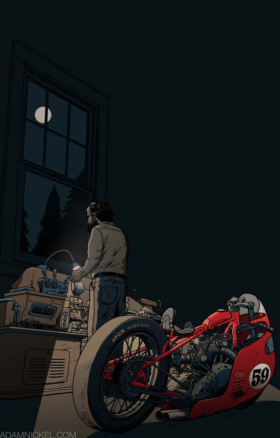 Coming across the work of Adam Nickel, my imagination was again lit-up. Publishing a few of his drawings on his blog, I was drawn to the alliterately titled pieces Dedication, Defeat, Dreams, & Decisions — which portray four events that are sure to feel familiar to any motorcyclist. Enjoy them after the jump, and be sure to stop by Nickel’s site for more pieces of moto-inspiration.