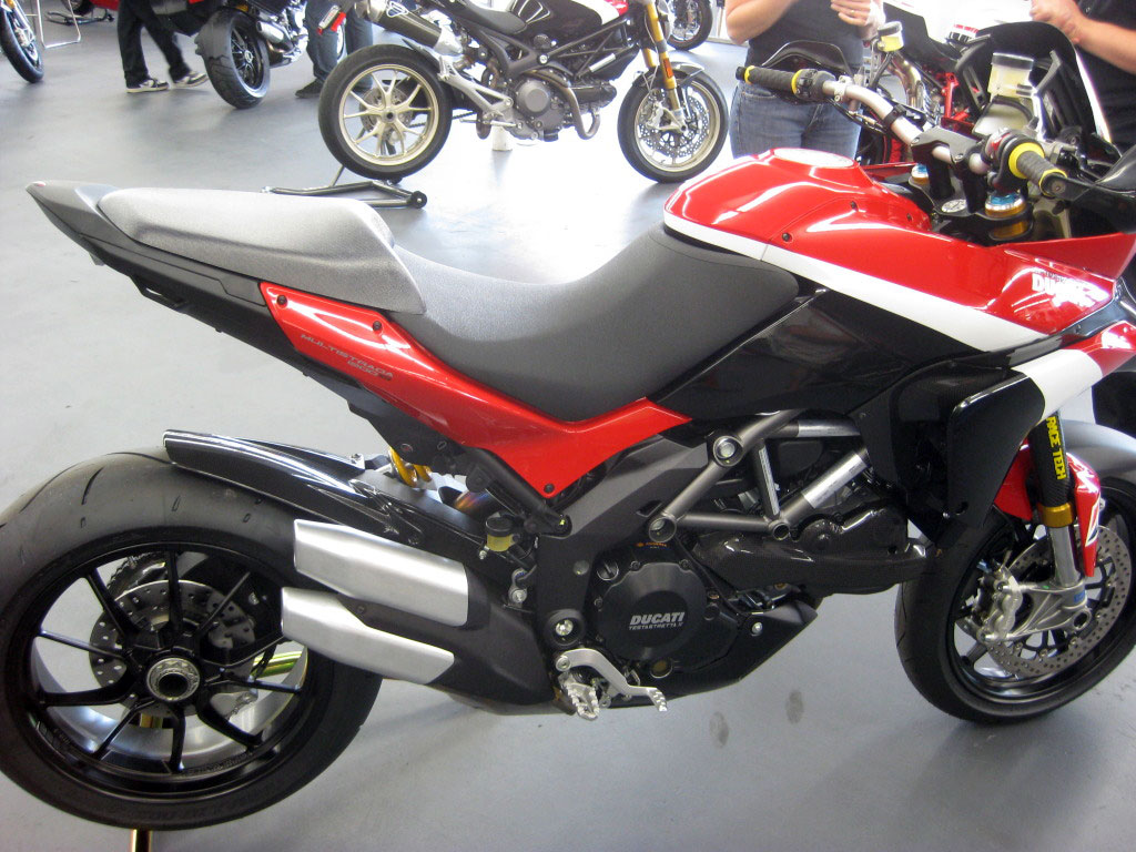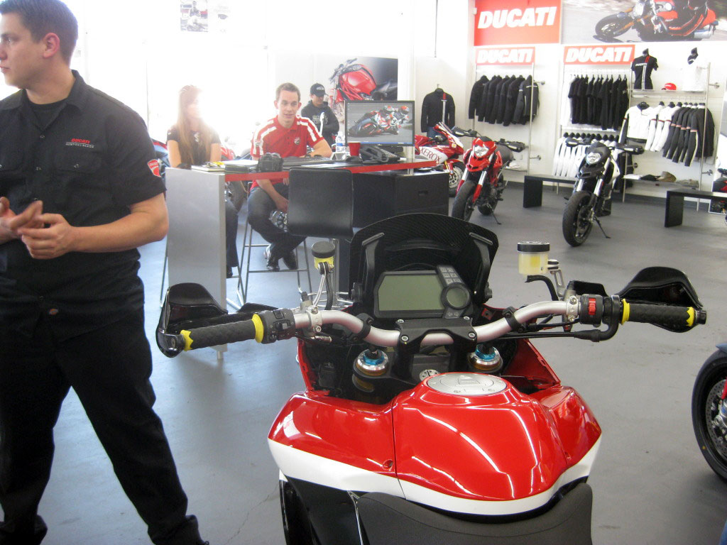 We were lucky enough today to get some shots from an Asphalt & Rubber reader who was in attendance at the Newport Beach Ducati shop to check out the Pikes Peak Ducati Multistrada 1200S race bike. From what we can tell the race bike has a cropped windsceen, hand-guards, revamped tail section (no luggage racks needed!), and a killer paint job. The overall affect is pretty dramatic, and makes the Multistrada 1200S look like a real speed demon. Ducati North America, can you say race replica? Thanks for the photos John!