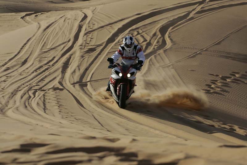 Well, someone in Yamaha’s French office is our flavor of crazy, as they let six-time Dakar Rally winner Stephane Peterhansel loose in the sand dunes of Merzouga, Morocco on a Yamaha YZF-R1. Shod with exquisitely hand-cut Michelin tires, Peterhansel flexes the 180bhp machine over the dunes with proper rallying style.