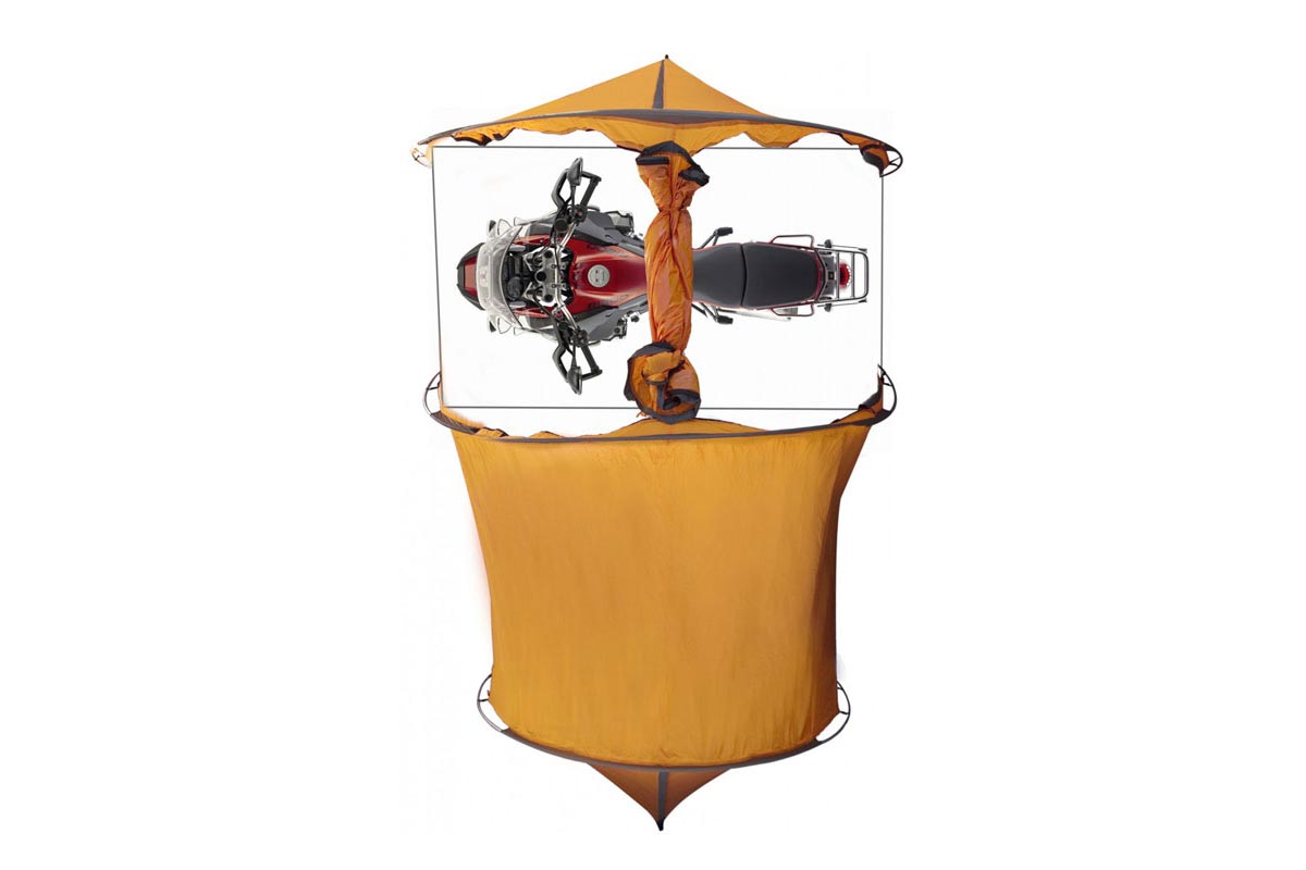 The Redverz Tenere Expedition tent, and the larger Series II Expedition tent, are not perhaps the first motorcycle-in-a-tent ideas, though they catches us as some of the most well thought-out offerings in this space. These three-season tent sleeps three people (read: two normal-sized humans) and one motorcycle, have a rain fly, and are generally packable into your typical motorcycle pannier mess of kit (13 lbs of tent according to Redverz). The motorcycle bay can be ridden into, is tall enough for you to stand in, and zips into the area where you sleep, making it convenient for on-the-trail repairs, coverings, etc.