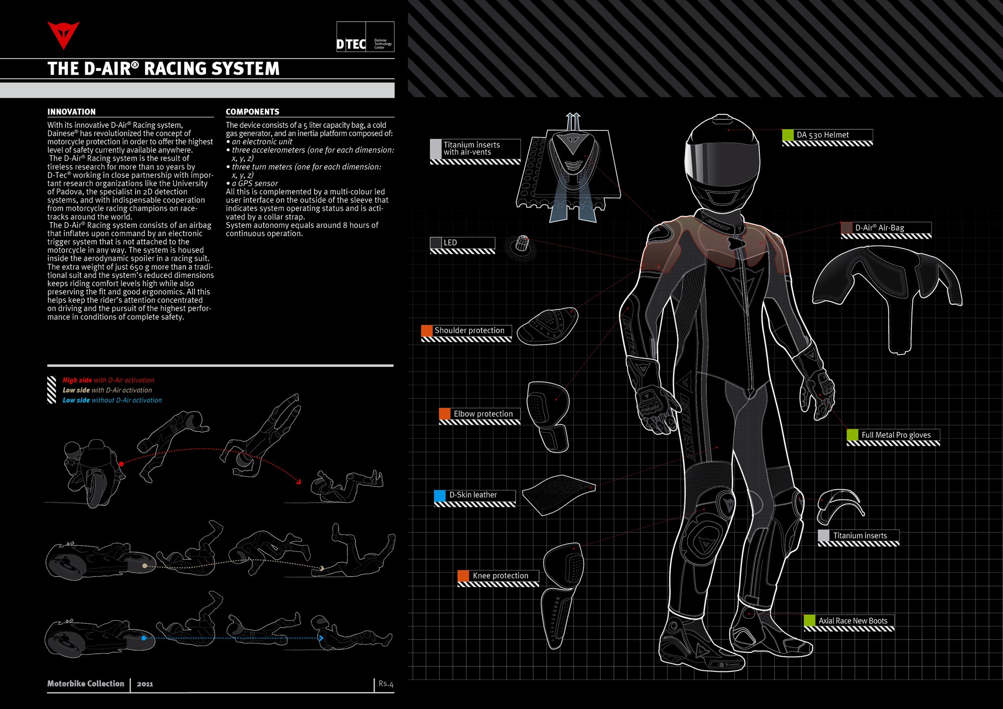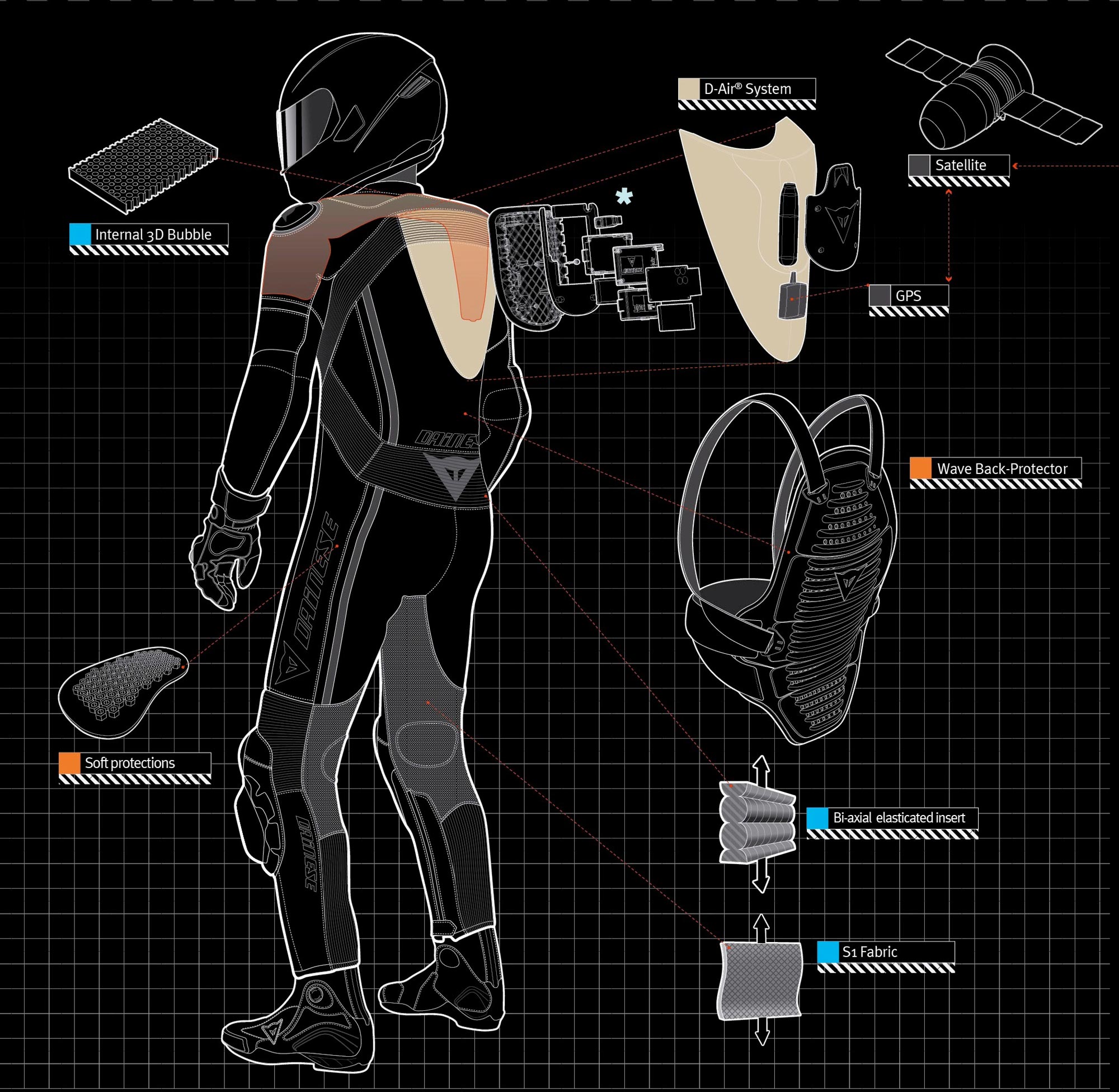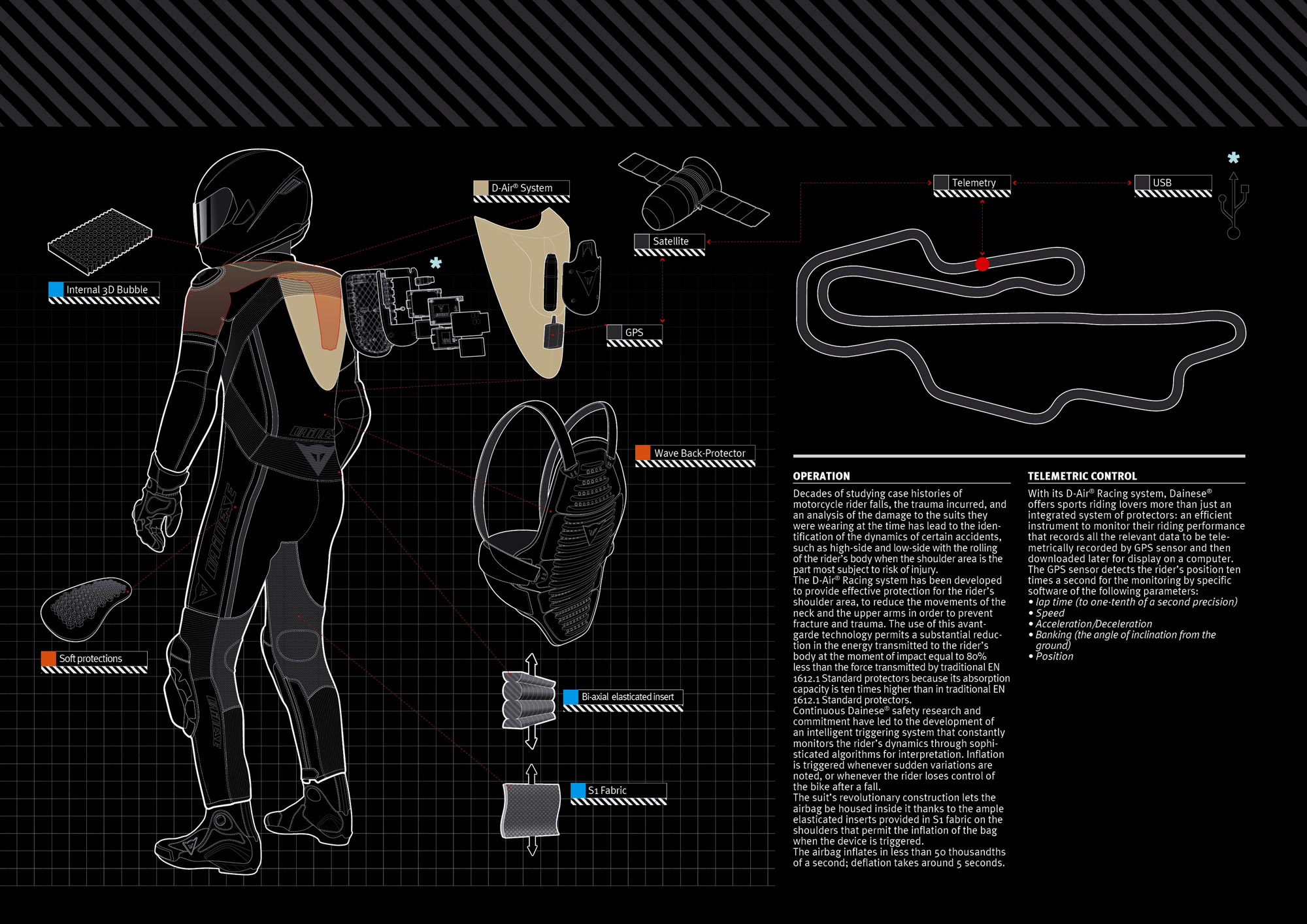 Realizing that the Dainese D-Air Racing suit had three accelerometers, three gyroscopes, 2GB of storage, and a GPS, the Italian company teamed up with 2D, a MotoGP and F1 telemetry supplier, to incorporated the necessary ports and software that allow a rider also to use the D-Air Racing suit for basic data recording.