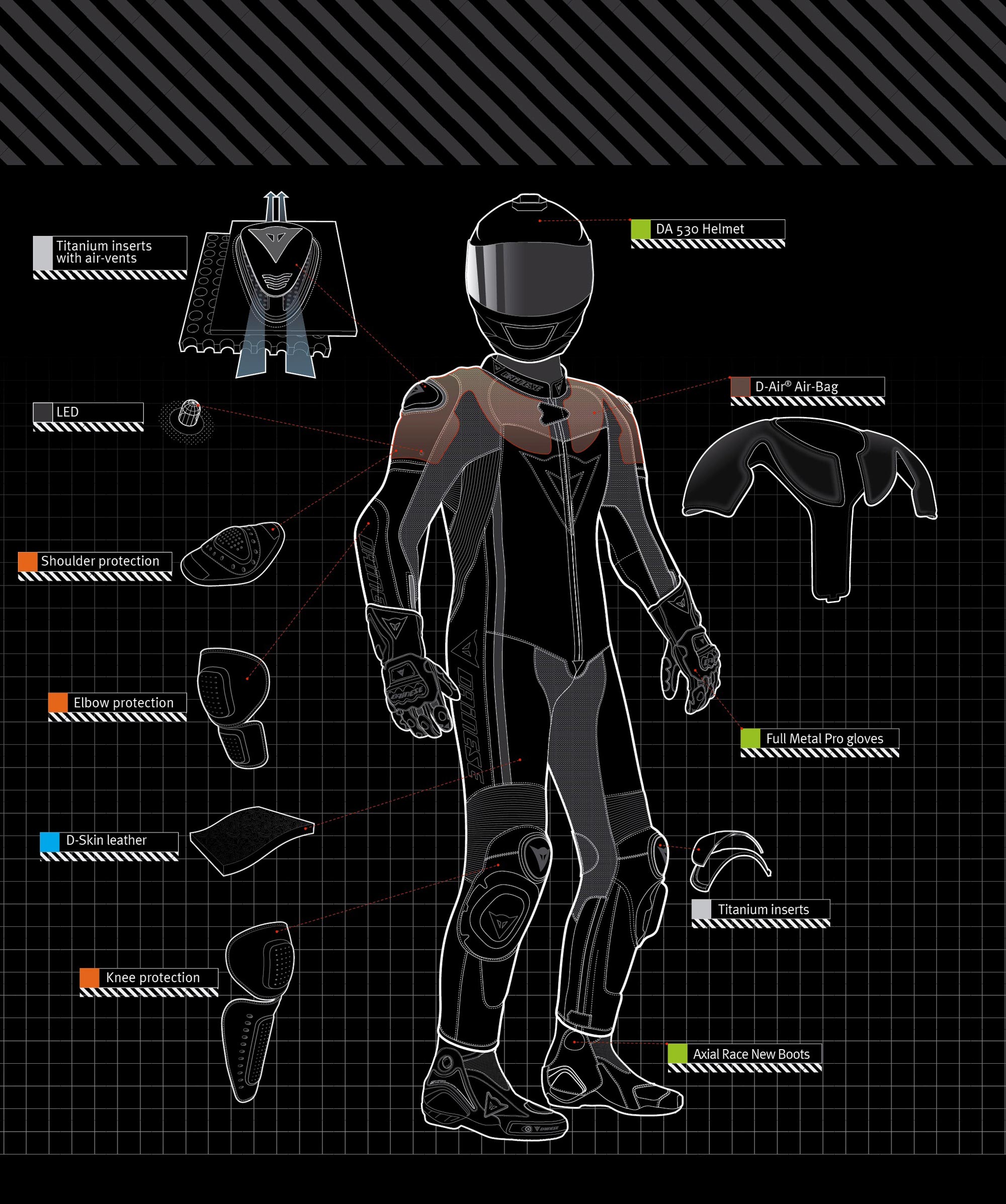 Continuing the company’s history as an innovator in the industry, Dainese was the first to invent the back protector, kneeslidder, and knuckle protector glove, and is now the first motorcycle company to offer a fully-integrated and wireless airbag system for motorcycle racing leathers (Alpinestars is expected to have one on the market within a year or two).