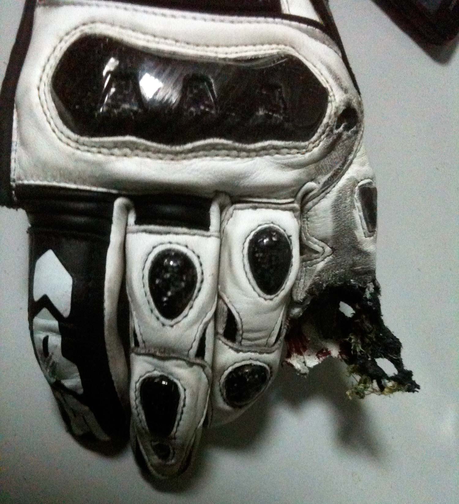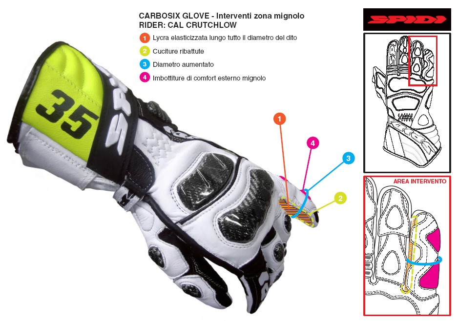 After losing the top joint to his pinky finger in a crash during the Monday night testing session at Qatar, Cal Crutchlow has had to have some special gloves from Spidi made in order to accommodate his injured finger and its bandages. Luckily Spidi, the Italian glove manufacturer and Crutchlow sponsor, has been able to rush produce a glove with a larger pinky finger sleeve that incorporates a lycra panel and special reinforcements.