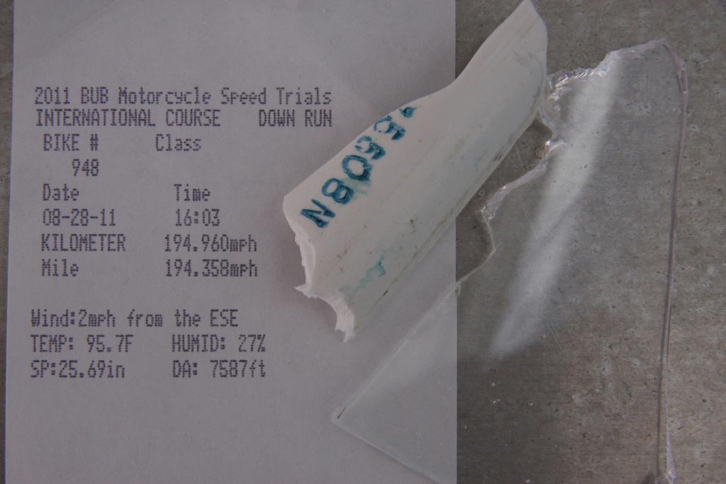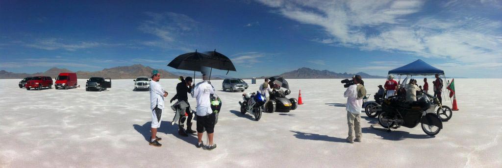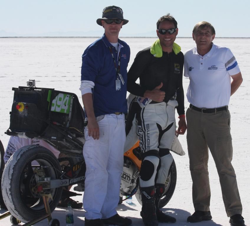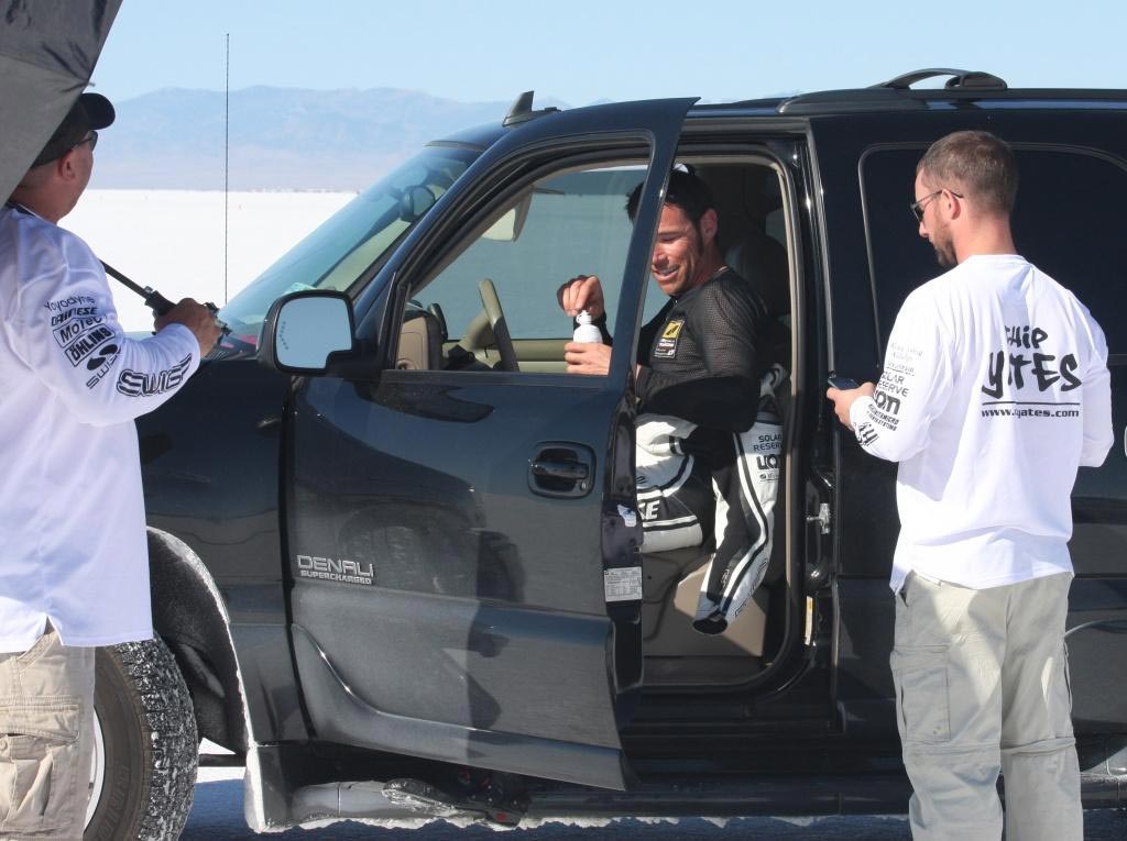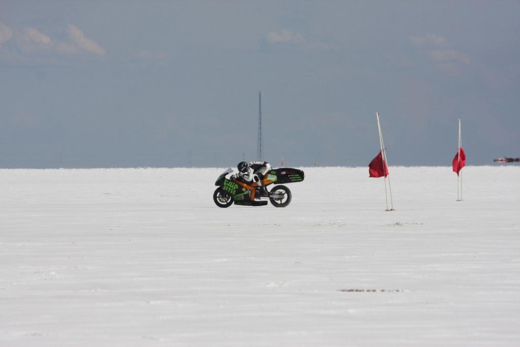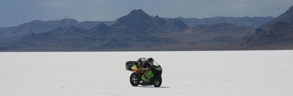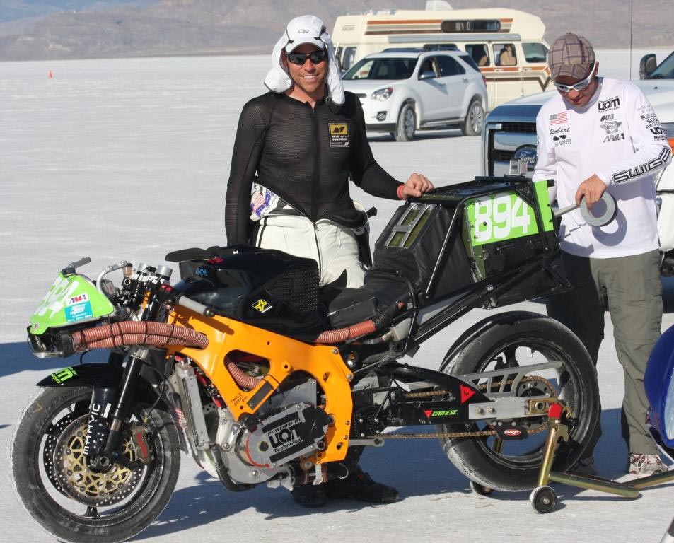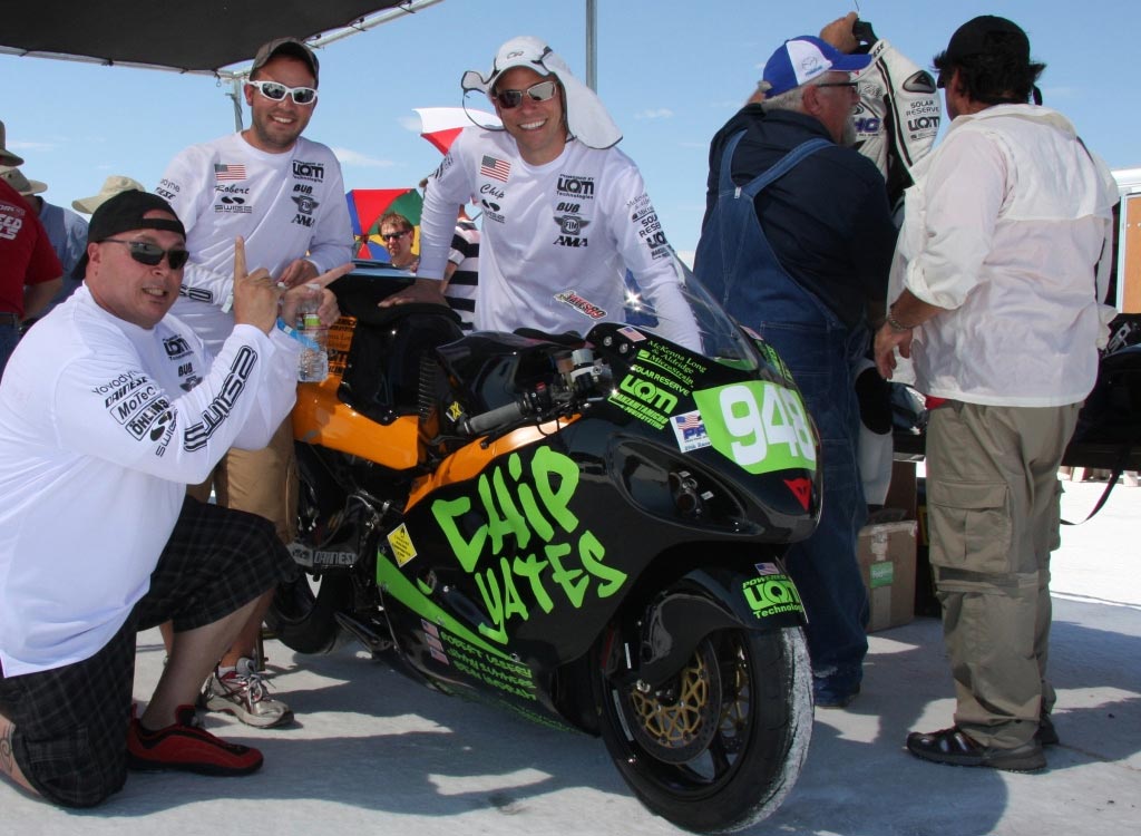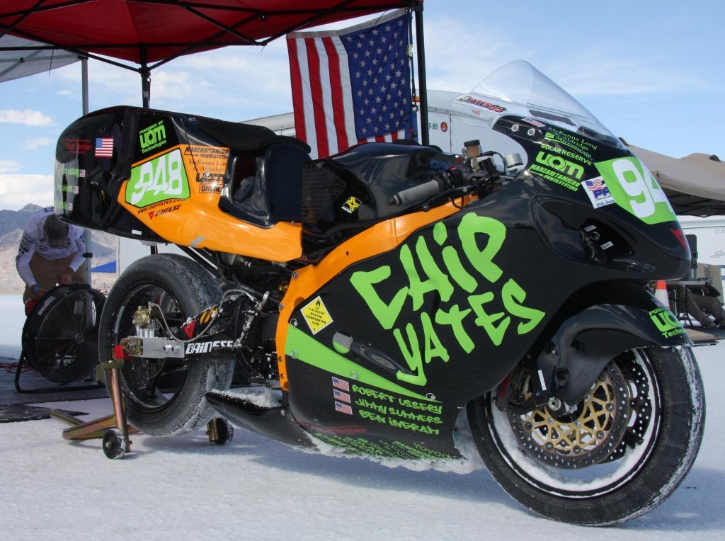 We got a quick message from Chip Yates this afternoon, saying that the SWIGZ Racing team just completed setting four FIM/AMA land speed records at the BUB Speed Trials currently being held at the Bonneville salt flats. Getting off to a rocky start after crashing through a mile-marker pylon, Yates went on to salvage the outing, setting his first FIM/AMA record on Tuesday with a 196.421 mph LSR in the “over 300kg class” (the team also hit a 200.7 mph speed trap velocity at BUB).