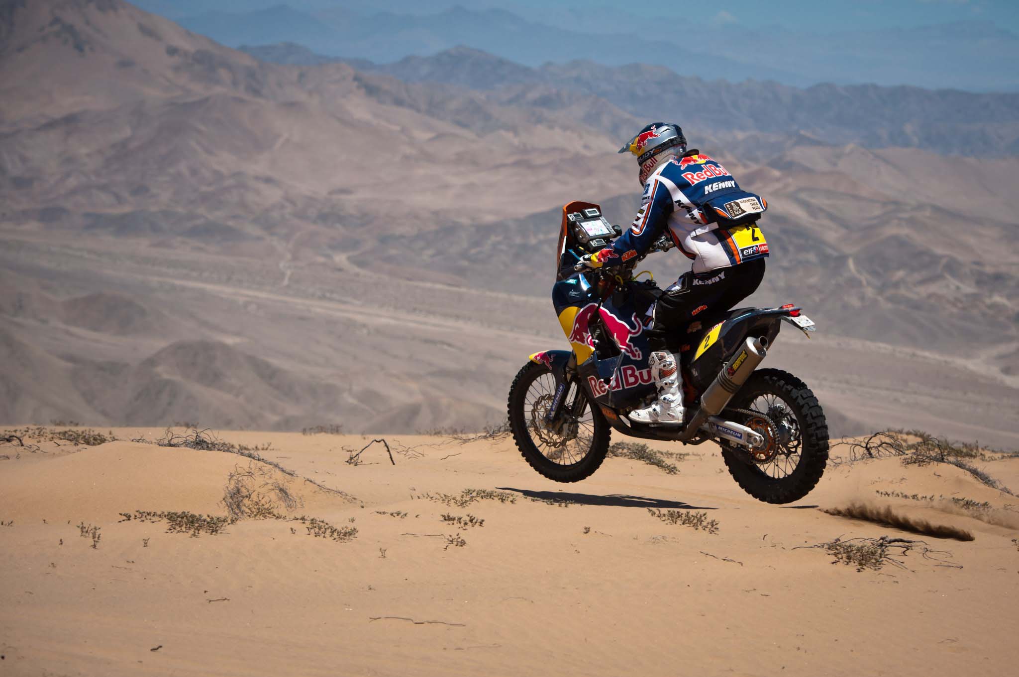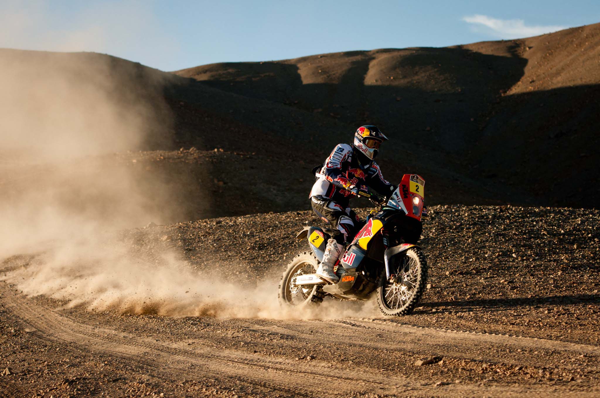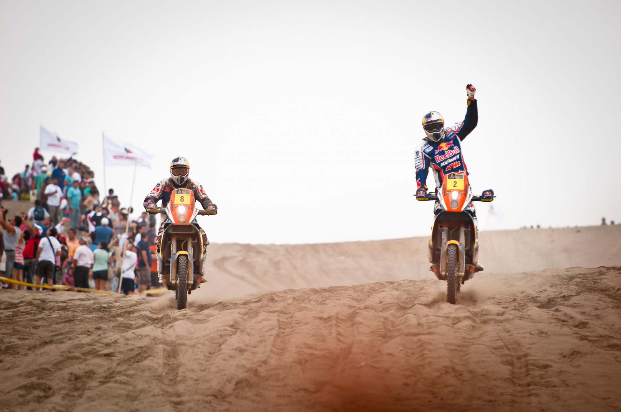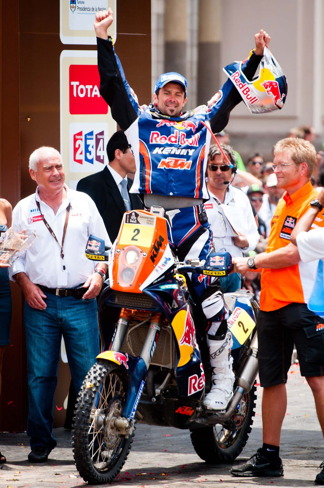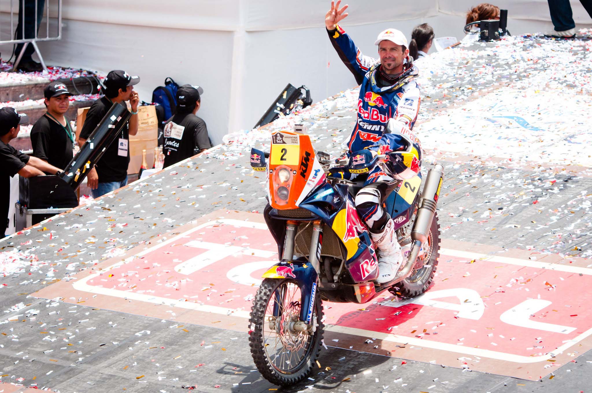 After battling with KTM teammate Marc Coma for the entire duration of the 2012 Dakar Rally, Cyril Despres bested the Catalan rider on the final stage, and claimed his fourth Dakar title. Despres won only four stages of the Rally (compared to Coma’s five stages), but the Frenchman was able to cling to his overall lead, despite finishing behind Coma on the last stage. With The Dakar concluding in Lima for the first time in history, Despres’ triumph brought KTM its eleventh consecutive Dakar win. After a critical time penalty was levied against Marc Coma, Cyril Despres won the rally with a 53 minute margin, though the racing was decidedly closer than that number implies.