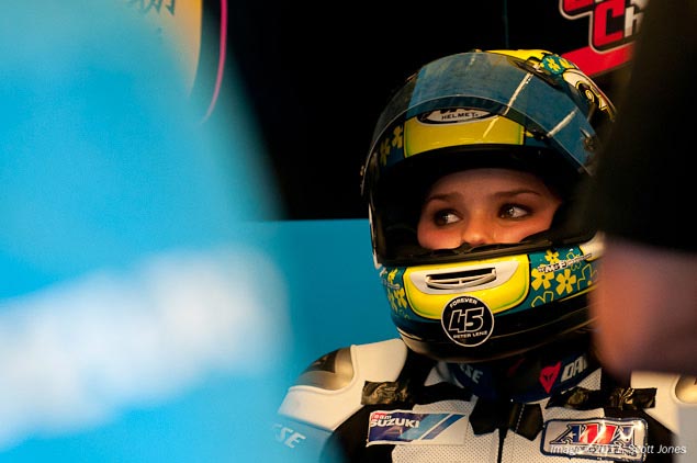 Elena Myers got a bit closer today to her dream of racing a MotoGP motorcycle, as the young AMA Pro Supersport rider got a chance to ride one of the Rizla Suzuki GSV-R race bikes around the Indianapolis Motor Speedway GP circuit. The outing started with a rocky start, as the Suzuki GSV-R cutout after Myers finished her out-lap, and was on her first proper lap of the session. Getting it started and riding back to the pits, Elena got back out on the track, after her tires were thrown back on the warmers for 20 minutes, and gave the Suzuki a proper go of things.