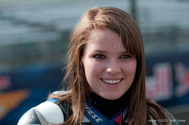 Taking a slew of laps around The Brickyard’s GP layout, Myers, to our knowledge, is the first rider on a GP bike to go around the newly paved infield section (Nicky Hayden lapped last week on a production Ducati Superbike 1198 SP). Eager not to crash one of Álvaro Bautista’s race bikes, the 17-year-old rode a smooth and consistent pace around IMS, but still managed to open up the Suzuki a bit with a top 306 km/h (190 mph) speed down the front straight. More of a chance for Myers to try out the MotoGP machinery than an actual test, her GSV-R was race-spec sans for some steel brake rotors (MotoGP bikes typically run carbon fiber brake discs).