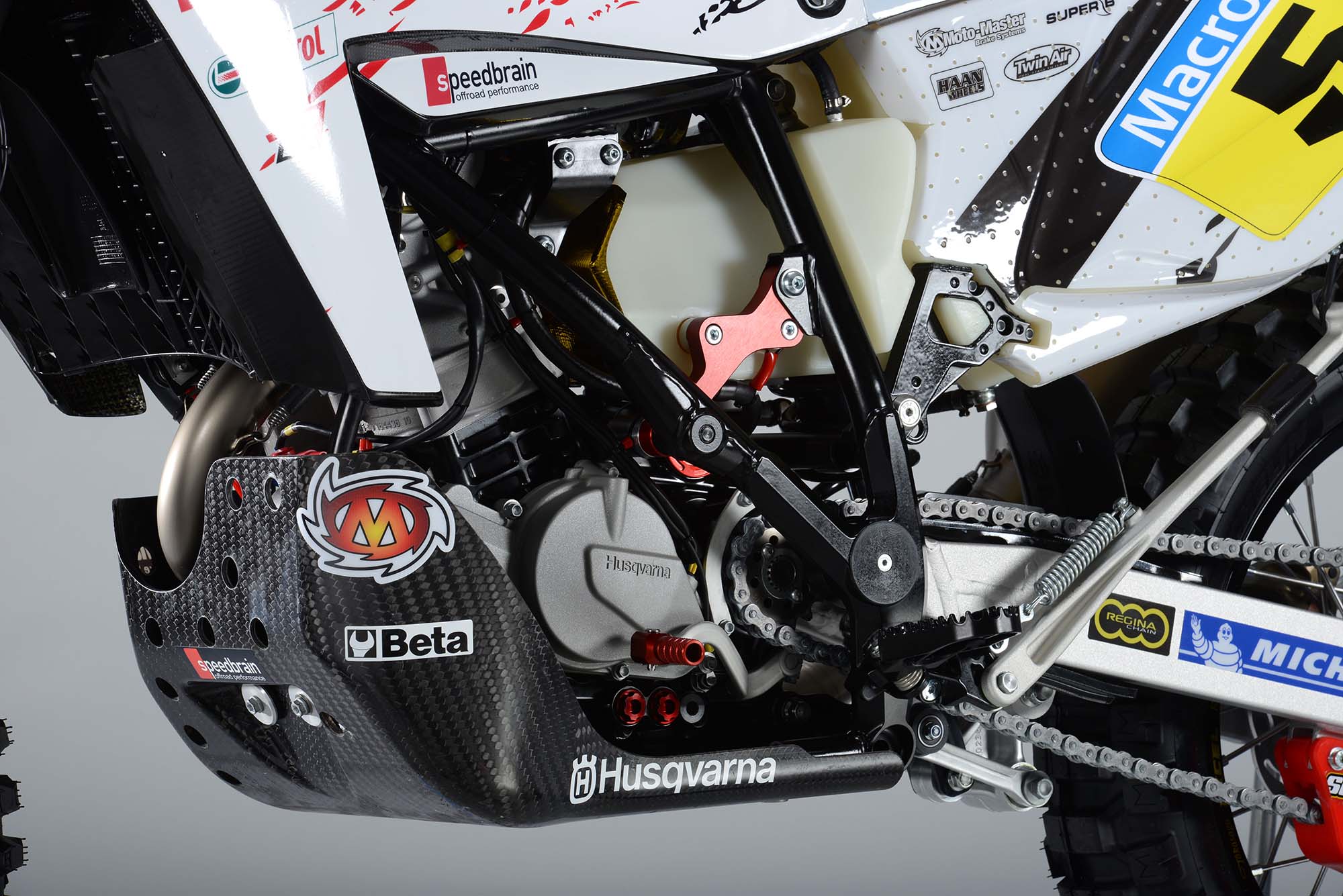 It is an ultra-modern and innovative racing motorbike, which is particularly light, possesses good handling and stability on a wide range of terrains, giving the rider maximum confidence. Husqvarna is feeding its know-how into the further development of the engine and endurance mapping to improve stability. Speedbrain and its research and development department are responsible for developing the chassis and rally-specific components. The bike is continuously being developed and optimised in cooperation with the riders.