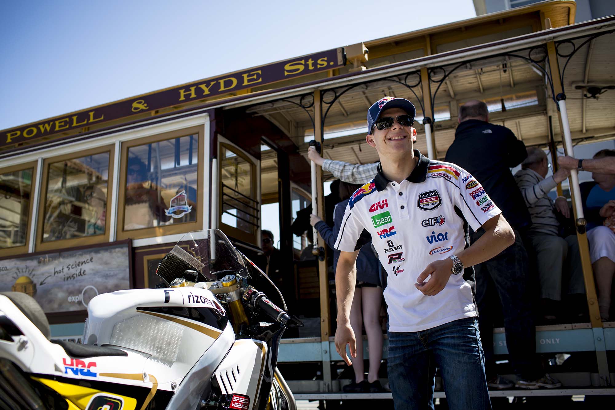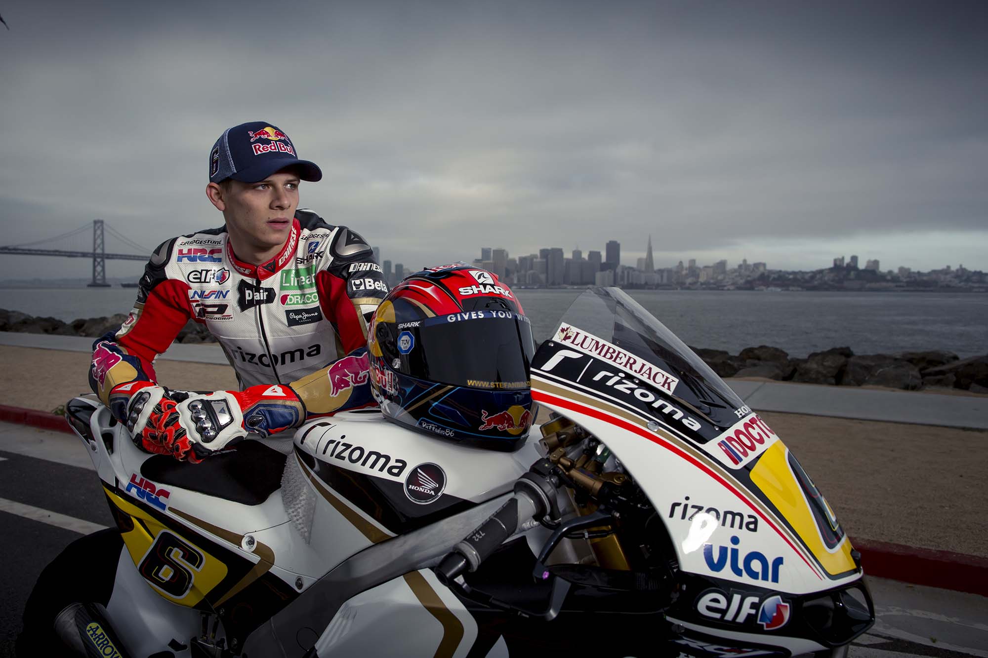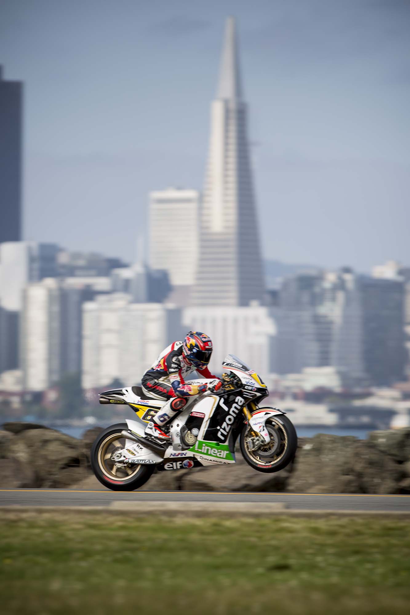 LCR Honda and team rider Stefan Bradl are in town early this week, doing a little promo work for US GP title sponsor Red Bull. Before heading down to Laguna Seca tomorrow (a track Bradl already scouted out with a local track day earlier this year), Bradl was in San Francisco yesterday, popping wheelies on Treasure Island and trying not to crash while going down Lombard Street (any SF motorcyclist could have told you the treachery of the iconic San Franciscan street).