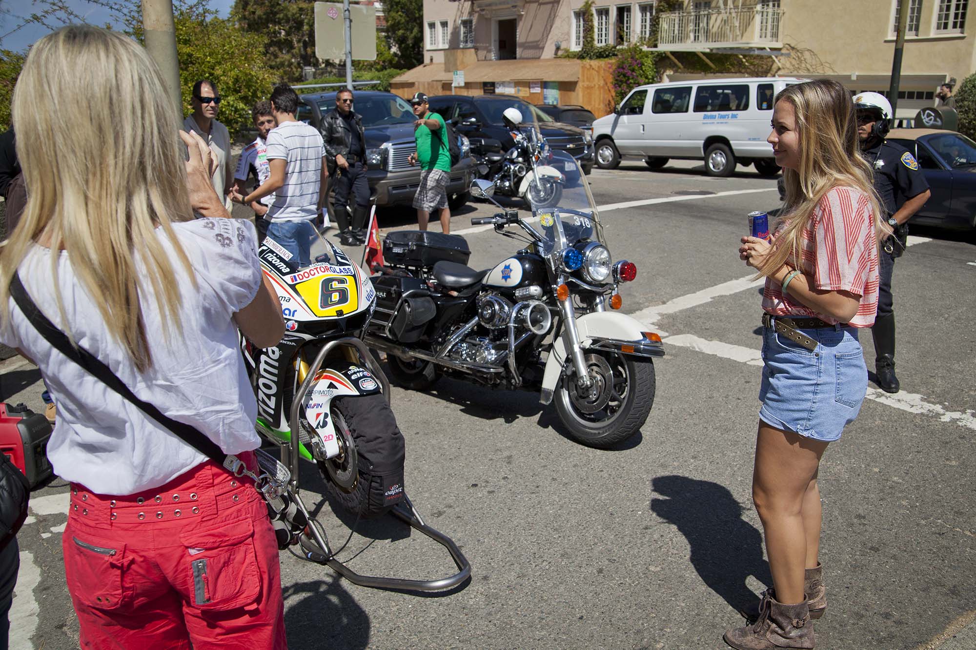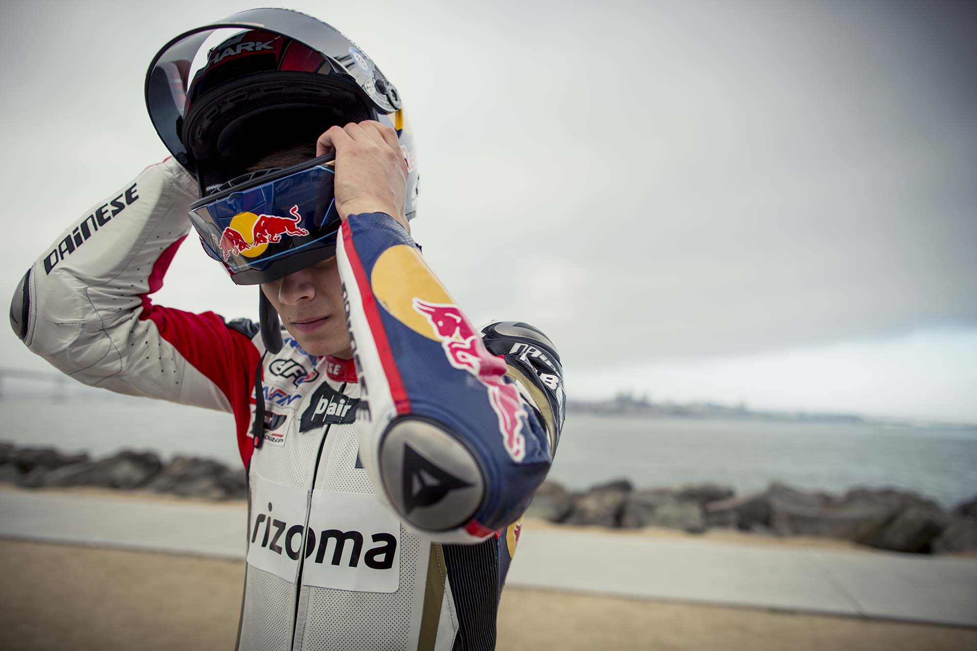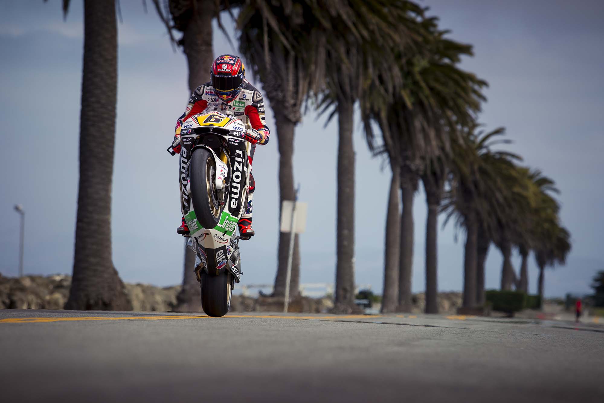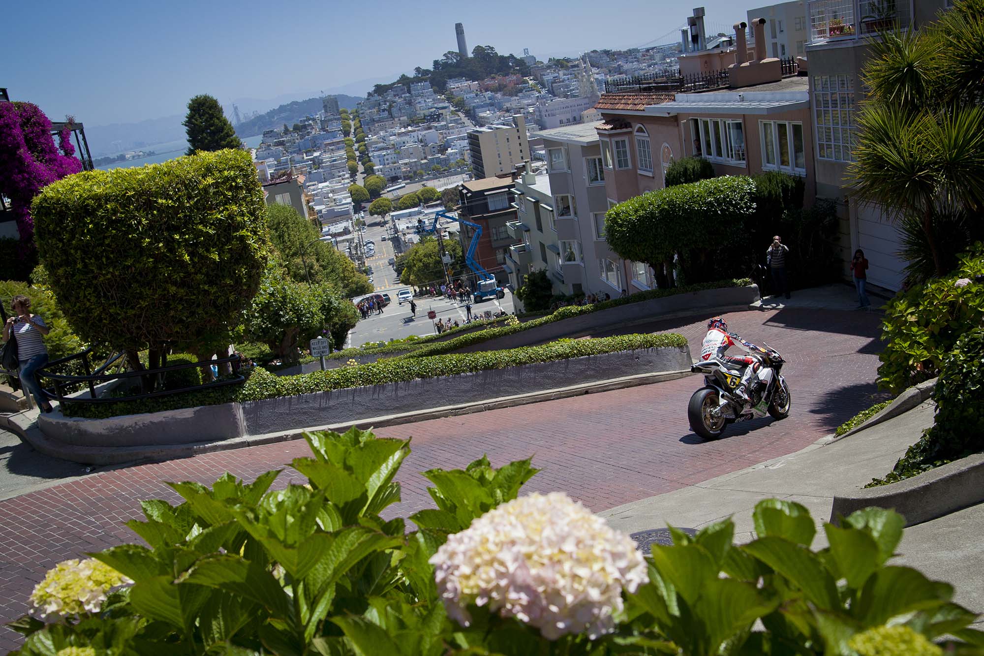 LCR Honda and team rider Stefan Bradl are in town early this week, doing a little promo work for US GP title sponsor Red Bull. Before heading down to Laguna Seca tomorrow (a track Bradl already scouted out with a local track day earlier this year), Bradl was in San Francisco yesterday, popping wheelies on Treasure Island and trying not to crash while going down Lombard Street (any SF motorcyclist could have told you the treachery of the iconic San Franciscan street).