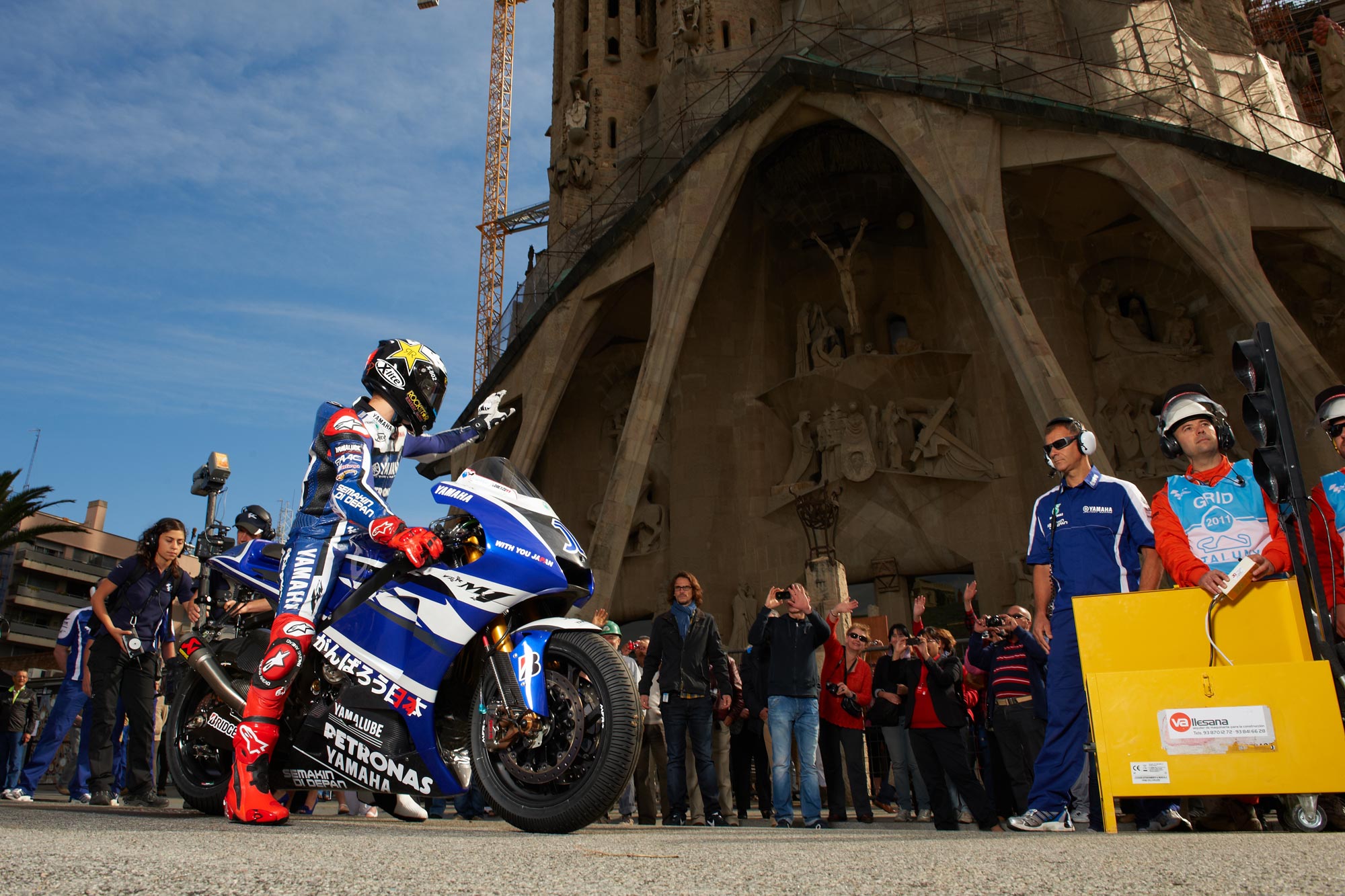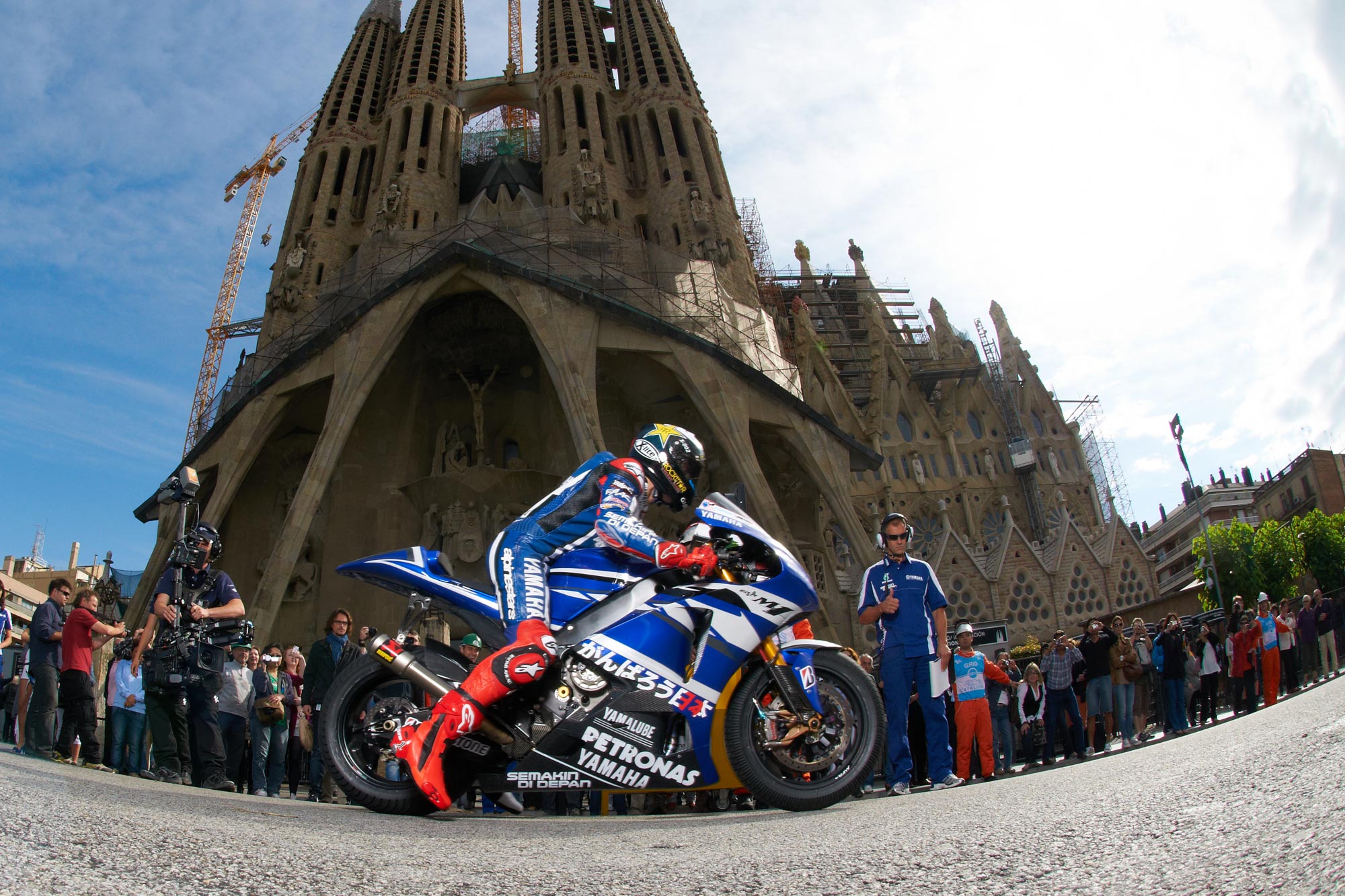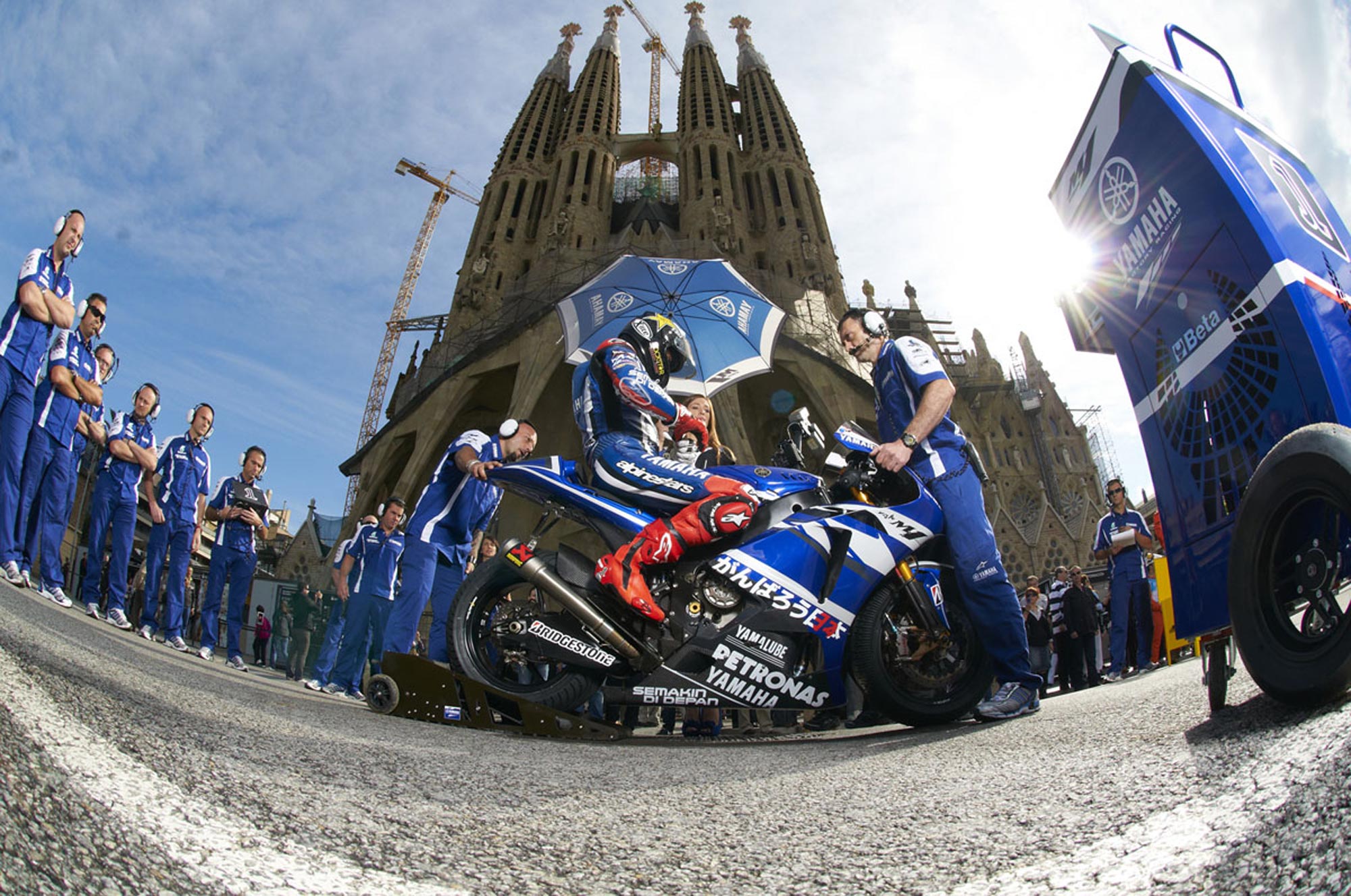 Jorge Lorenzo might not be the most charismatic MotoGP racer in the paddock, but he has some very smart people helping him with his marketing. Pitching a MotoGP grid in front of the Sagrada Familia in Barcelona, the Yamaha Racing team put on a show for the unsuspecting people milling about the famous church.