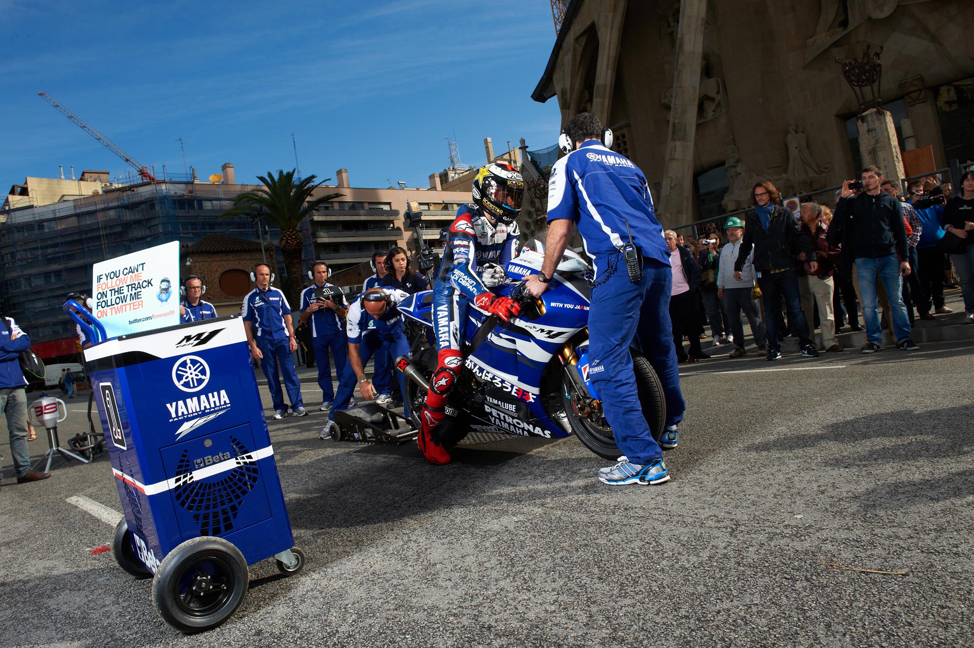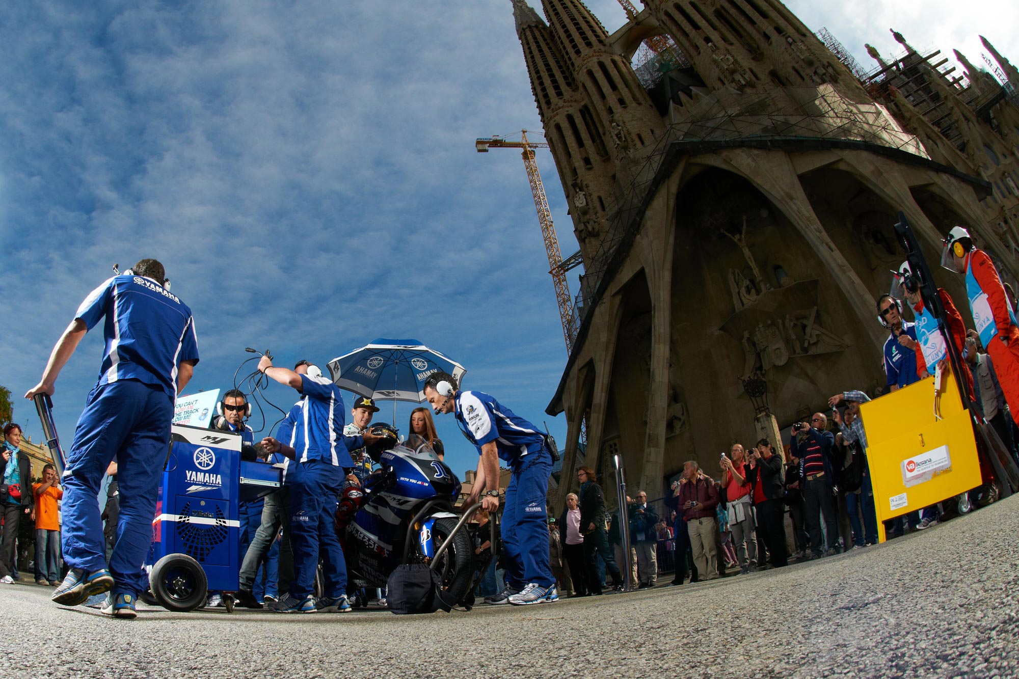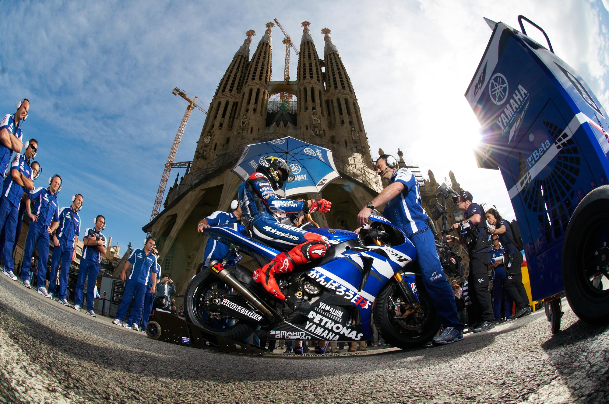 Jorge Lorenzo might not be the most charismatic MotoGP racer in the paddock, but he has some very smart people helping him with his marketing. Pitching a MotoGP grid in front of the Sagrada Familia in Barcelona, the Yamaha Racing team put on a show for the unsuspecting people milling about the famous church.