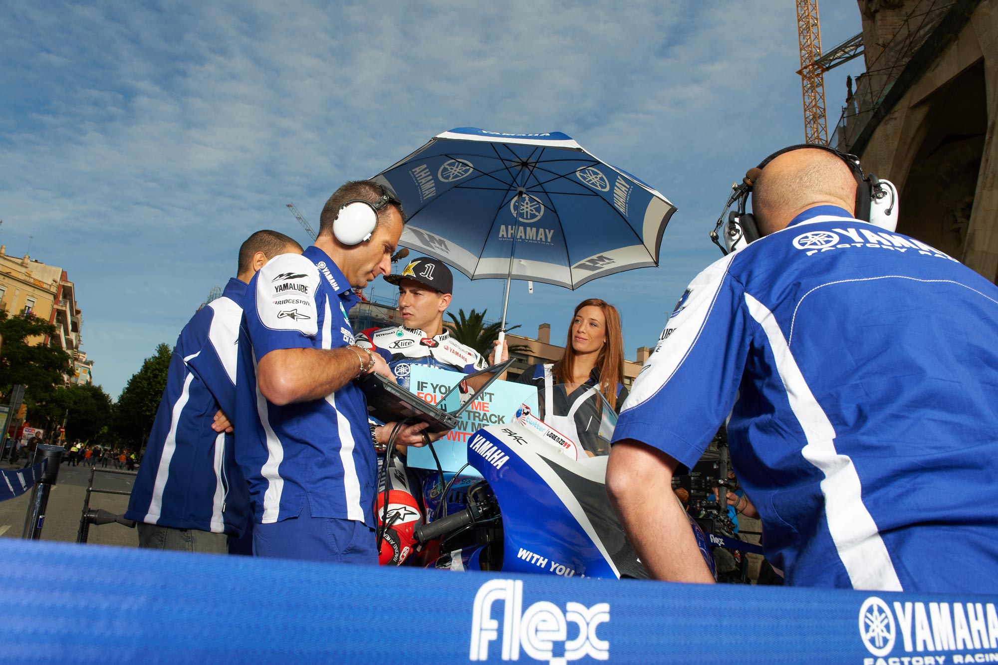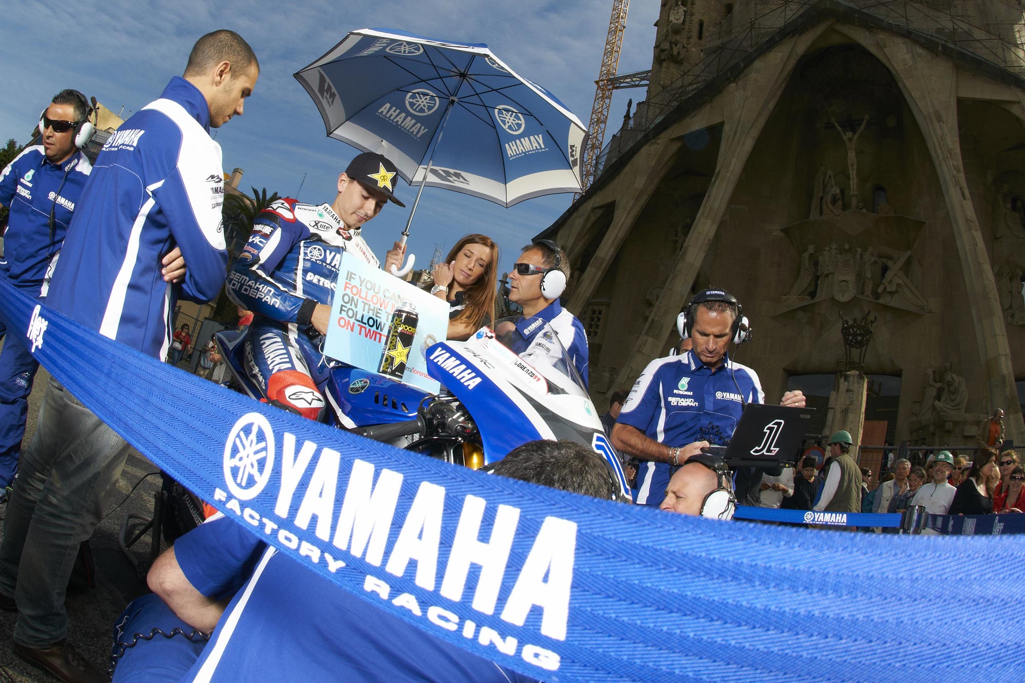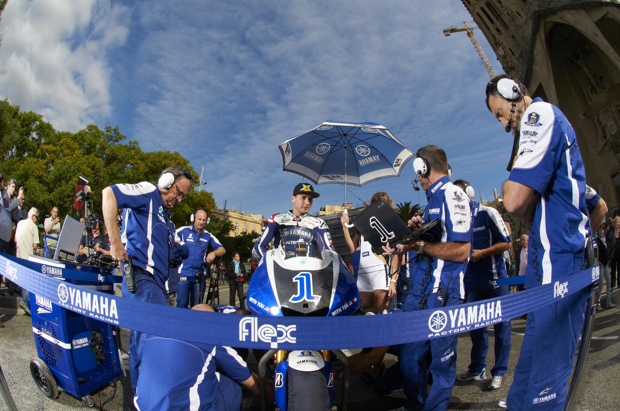 The normal Wednesday commute to work for the residents of downtown Barcelona was transformed this morning as MotoGP came alive on the doorstep of the iconic Sagrada Familia in the heart of the city.  The area was brought to a standstill as commuters, tourists and local workers alike were witness to a personal MotoGP grid experience courtesy of Yamaha Factory Racing and reigning World Champion Jorge Lorenzo.