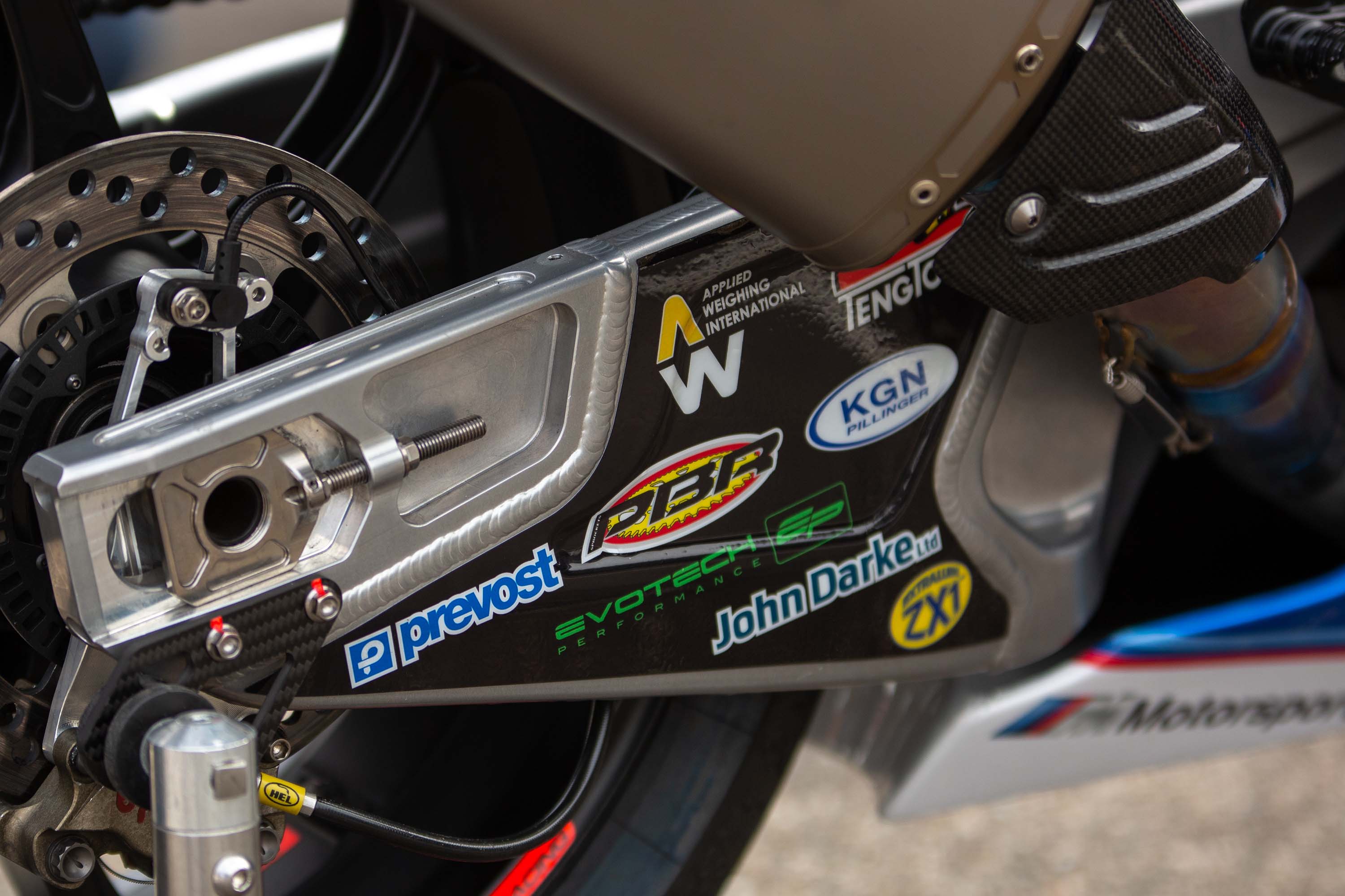 BMW Motorrad likes to make a big fuss about its racing-spec swingarm on the production S1000RR, but as we can see, the Smiths Racing BMW squad has tapped the folks at Suter to build a new unit, and move the rear caliper mount in the process as well.
