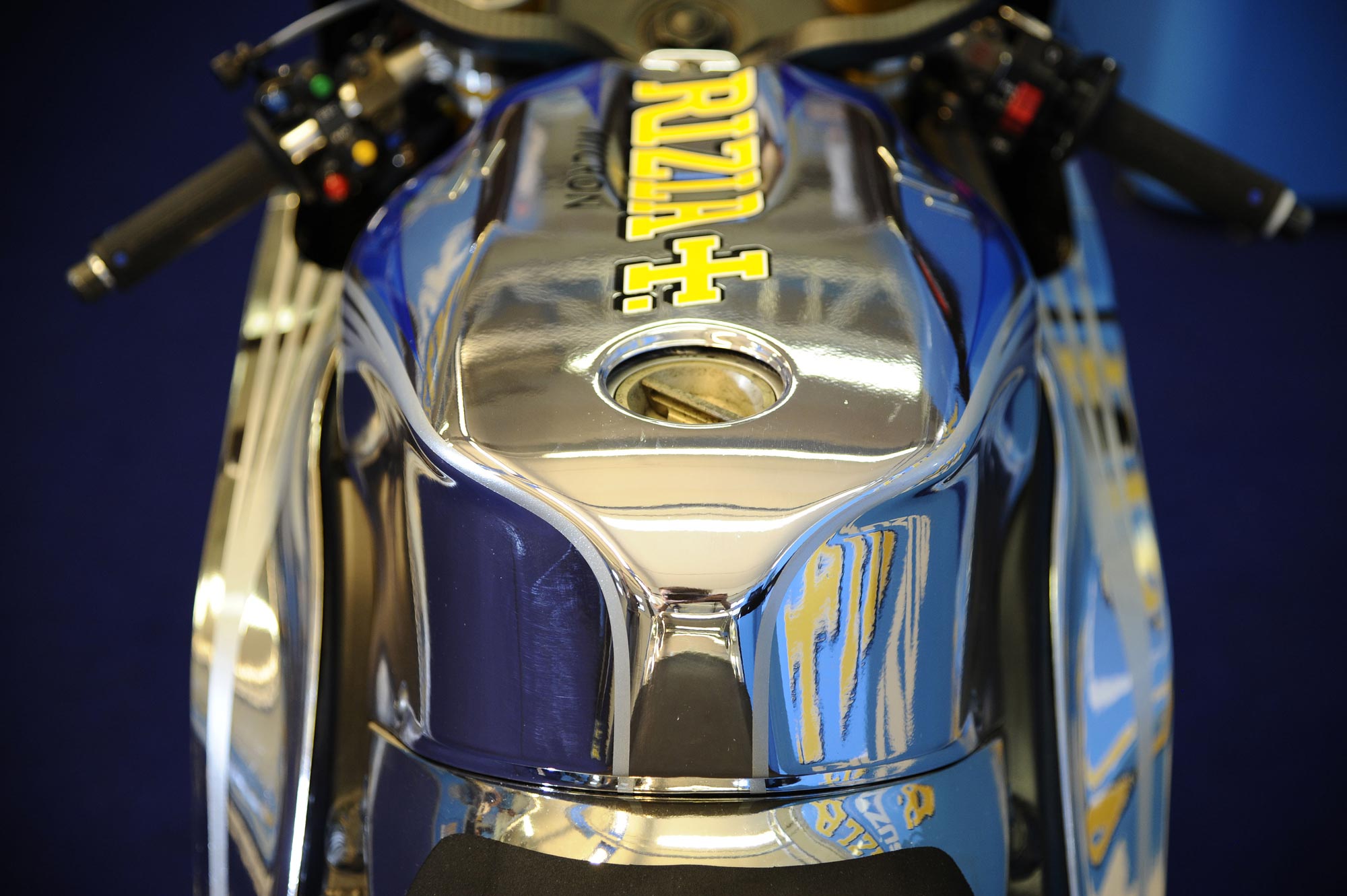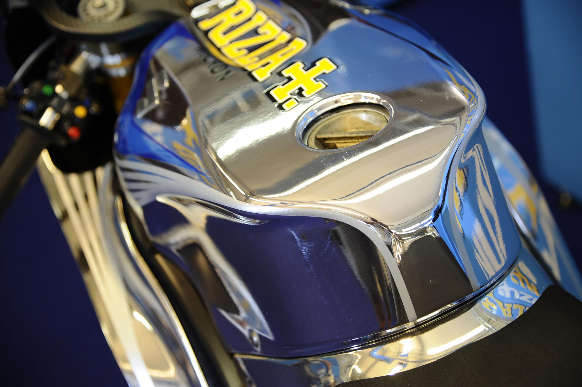 Álvaro Bautista sported some new race livery this past weekend in Misano, as the Spanish rider donned a chrome paint scheme at the San Marino GP to help title sponsor Rizla hock some more cancer sticks. The “Micron” paint scheme, done by Troy Lee Designs, is one of the many ways the Rizla Suzuki team has tried to promote itself for its financial backers, with PR rides by John Hopkins and Elena Myers also filling the bill. While the Suzuki team has struggled in MotoGP the past few years, the more recent races this season have shown that Bautista and the Suzuki GSV-R are capable of mixing it up with the second-tier of riders (when the bike stays on the track of course).